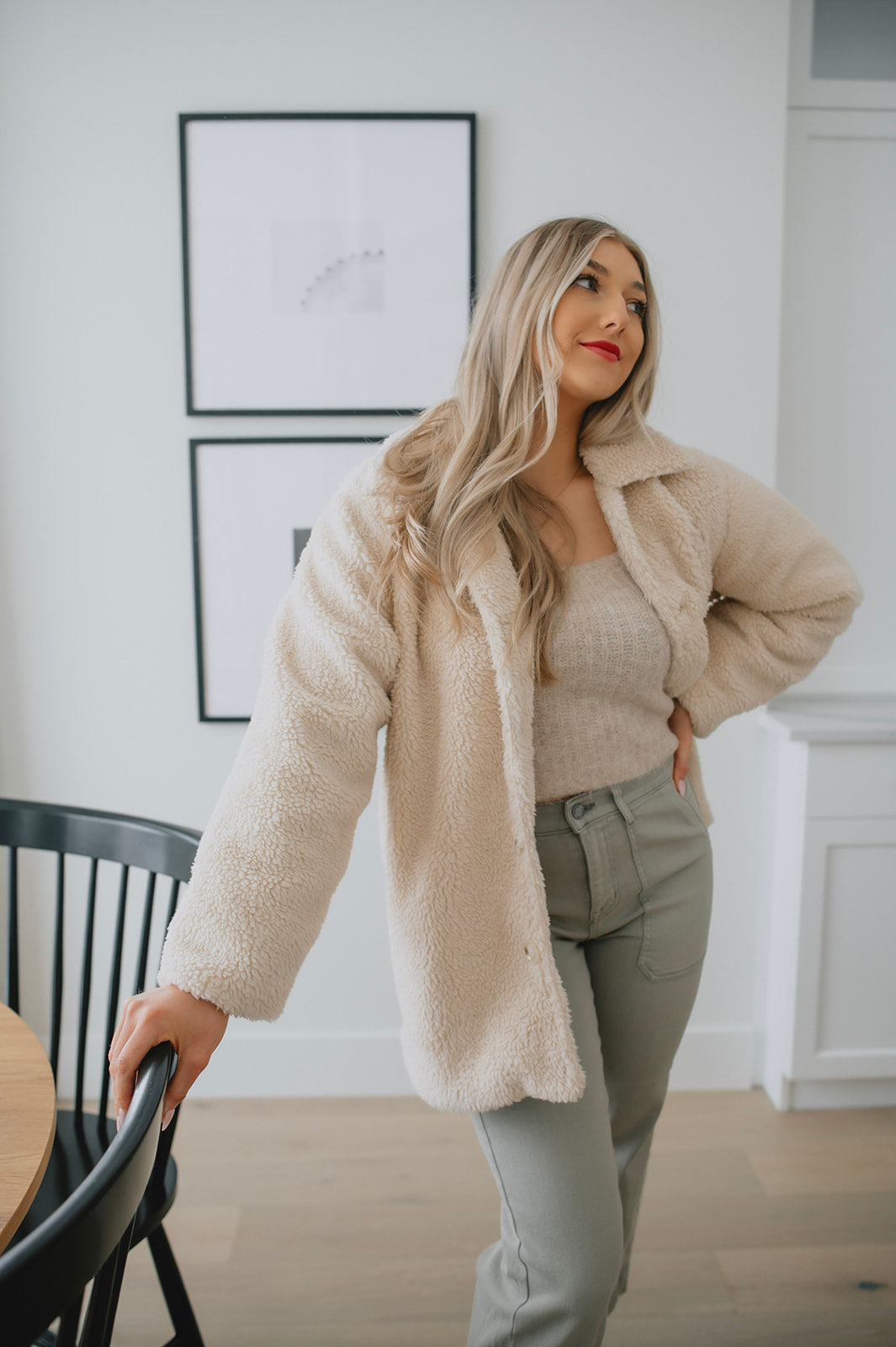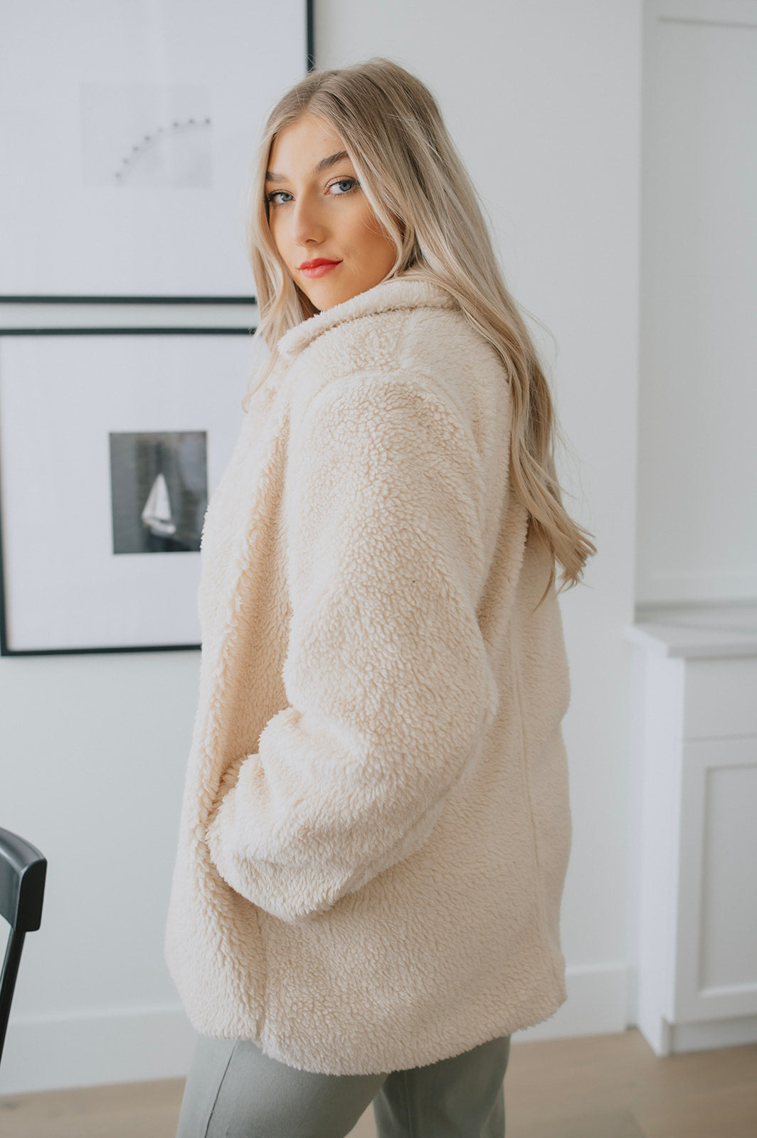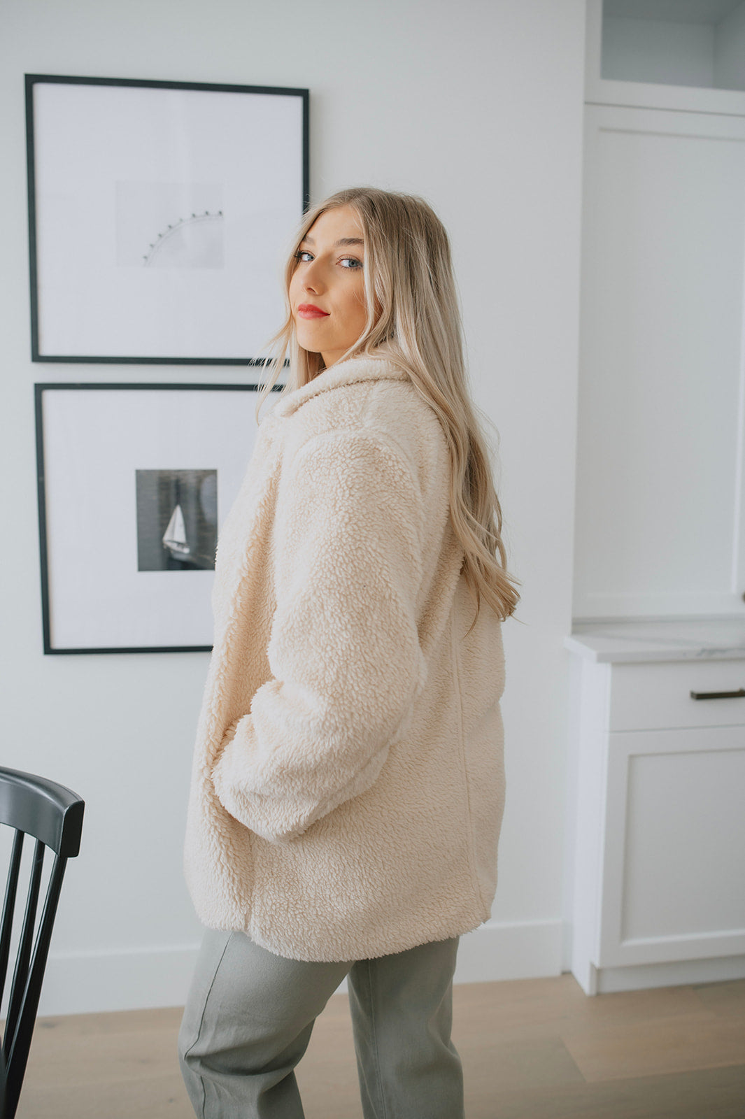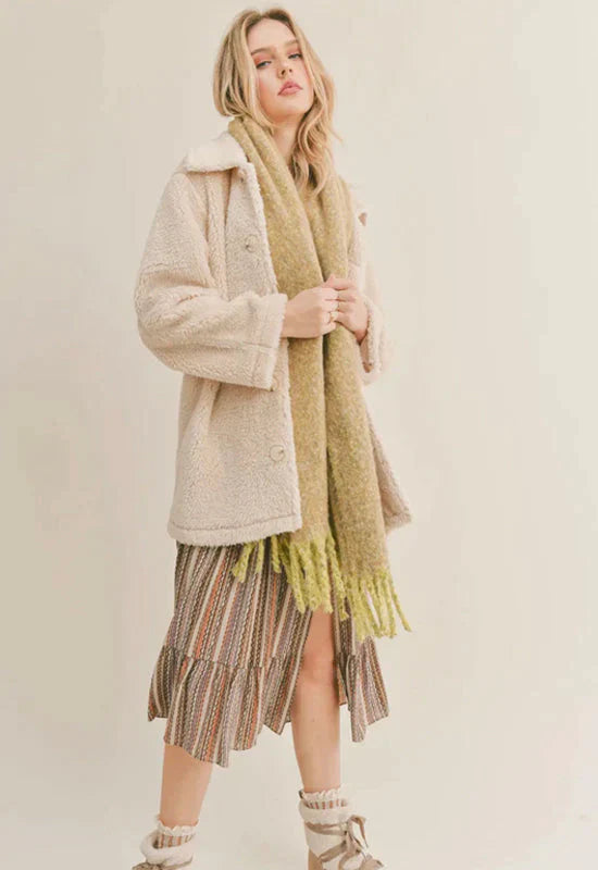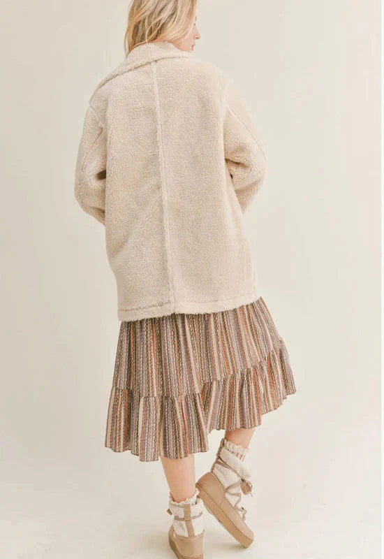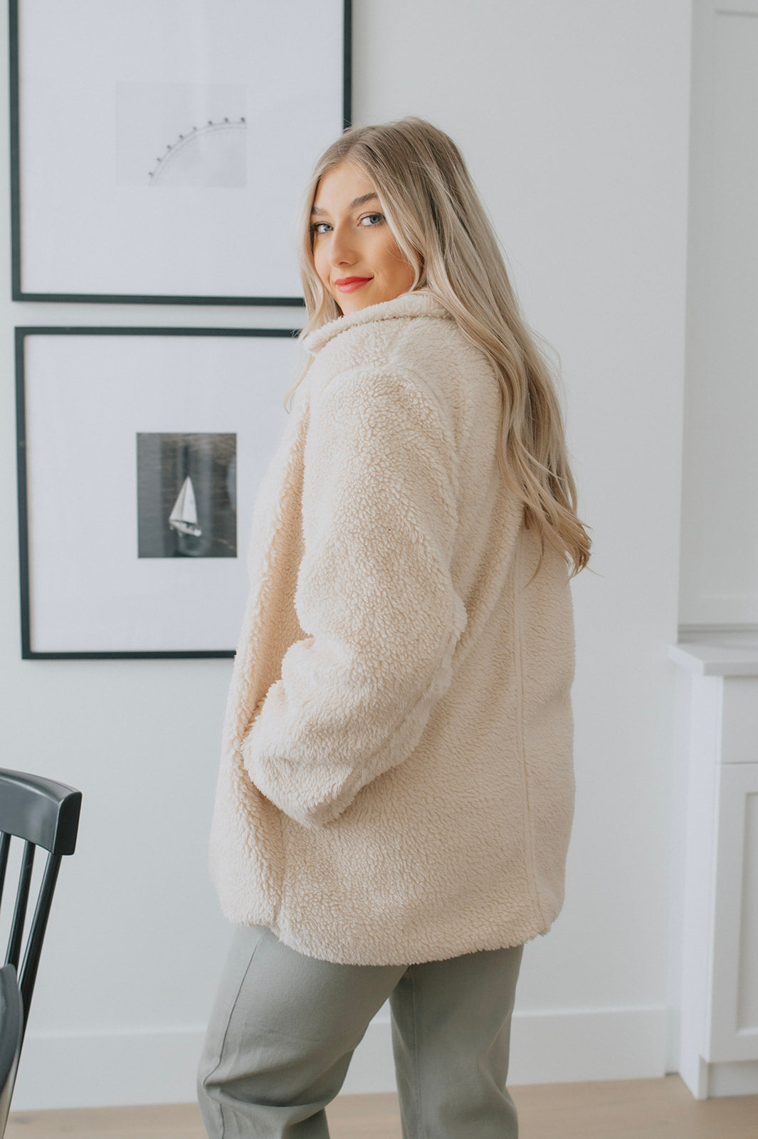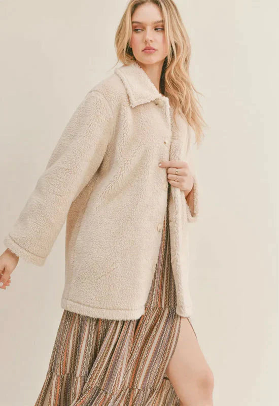 Channel your inner Penny Lane and be fashionable and cool (and warm) while transitioning to spring. This sherpa coat is lined but lightweight and buttons up the front for a versatile look. Throw over a dress or with jeans and a tee for an always on trend outfit!
