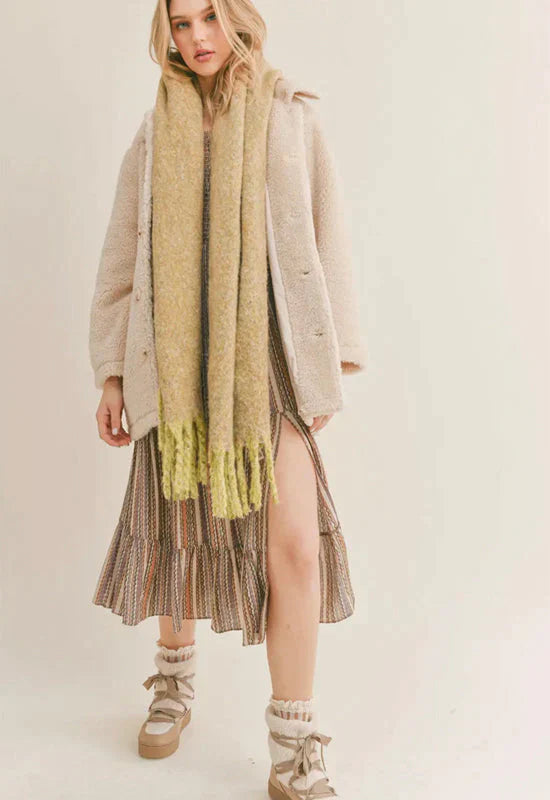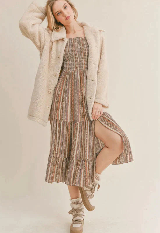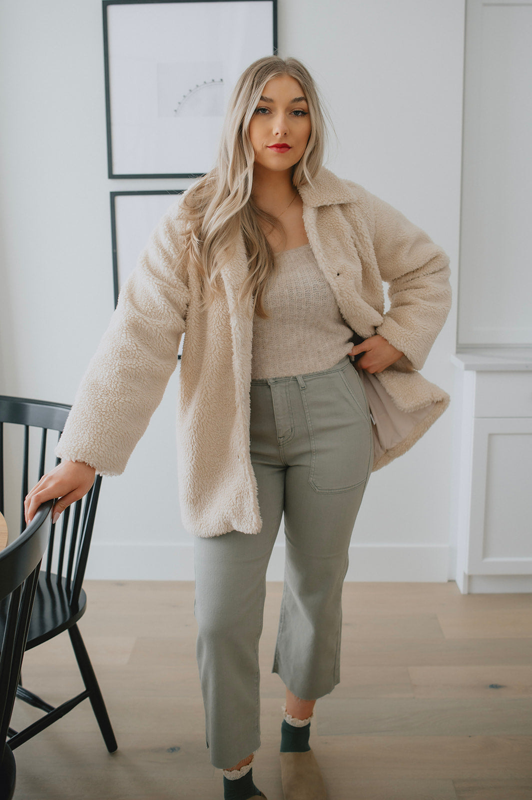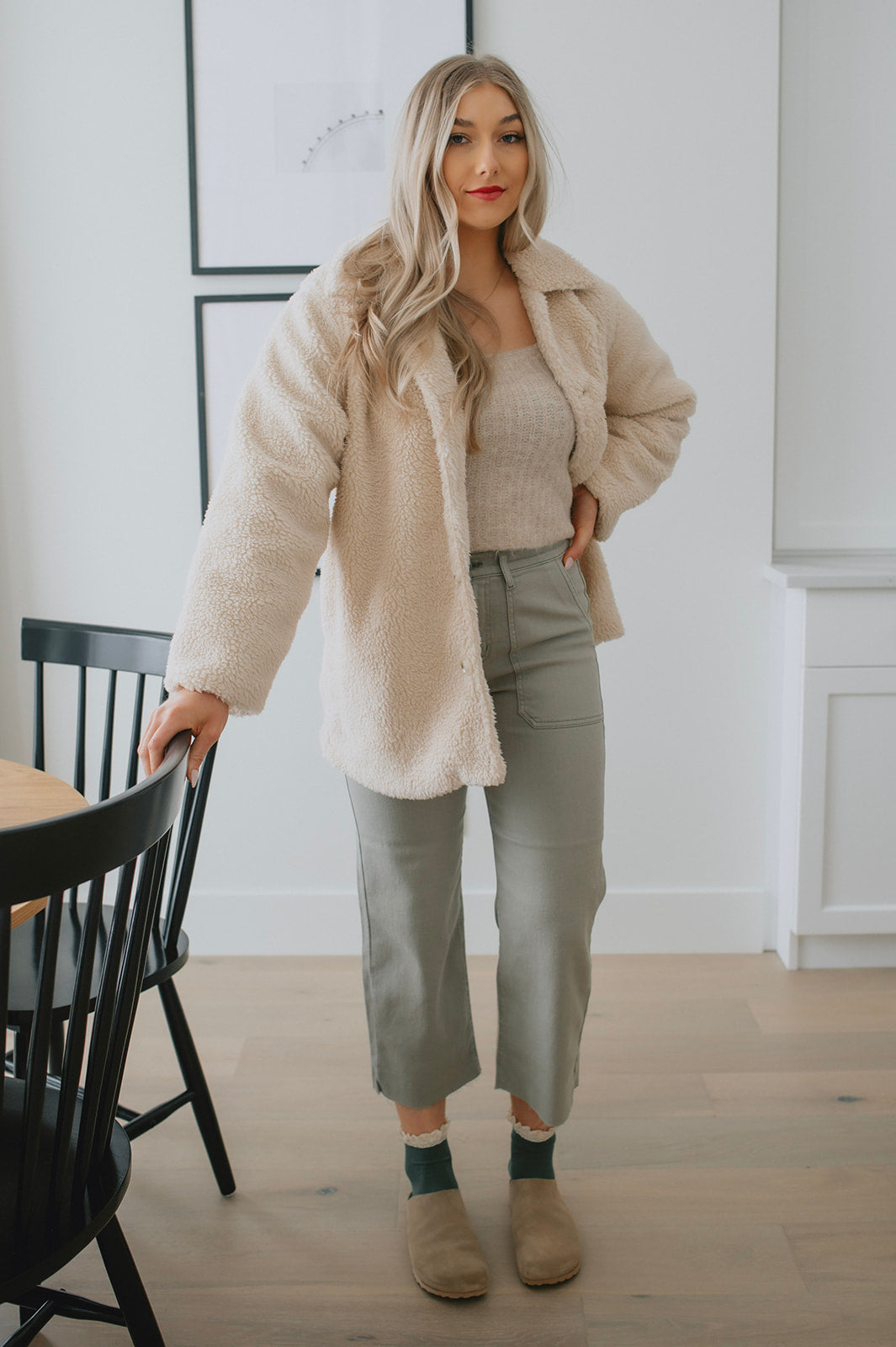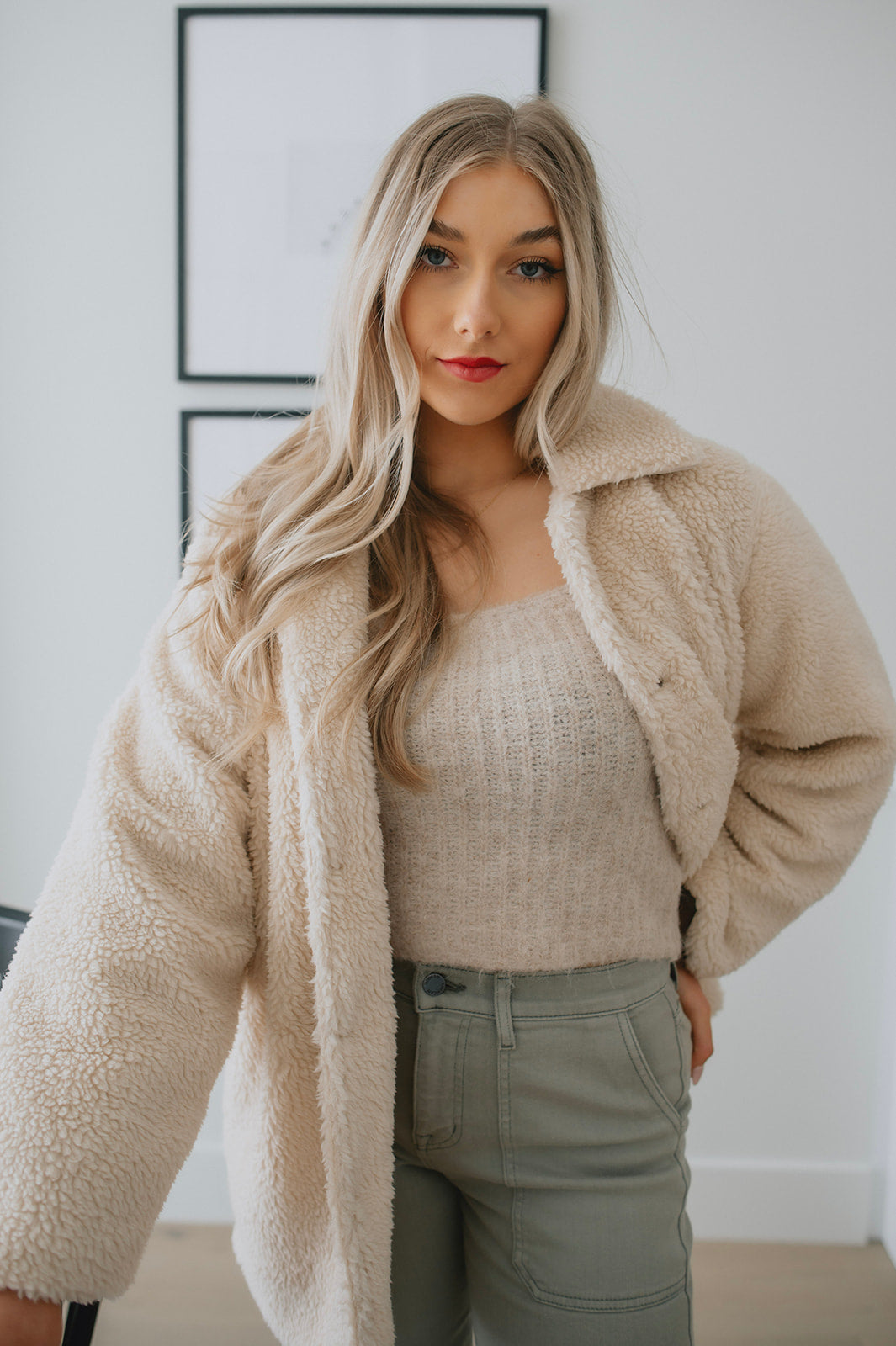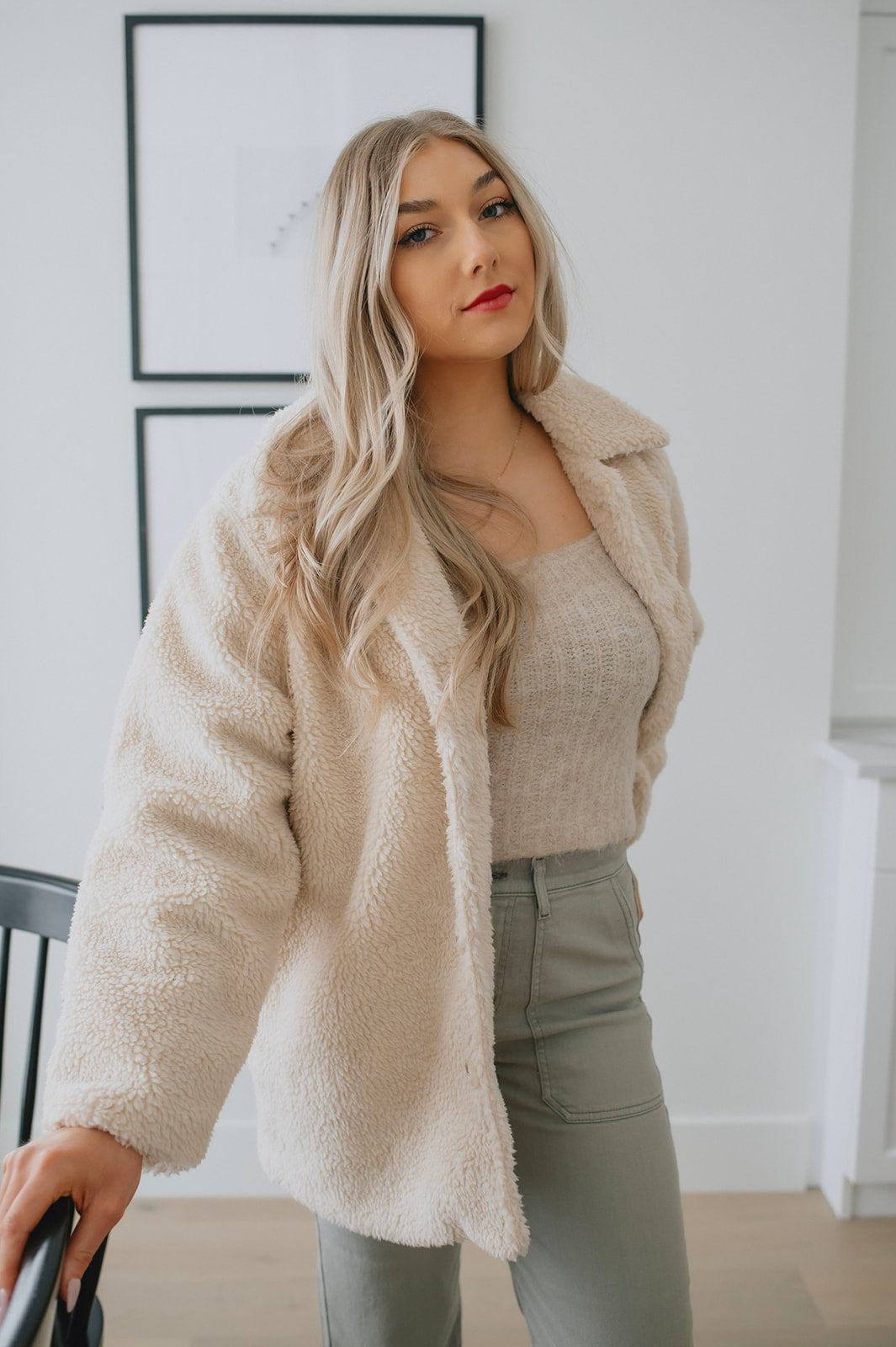 Channel your inner Penny Lane and be fashionable and cool (and warm) while transitioning to spring. This sherpa coat is lined but lightweight and buttons up the front for a versatile look. Throw over a dress or with jeans and a tee for an always on trend outfit!