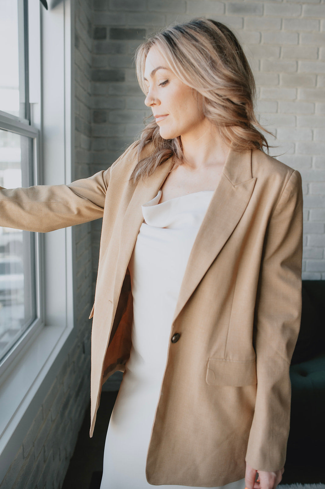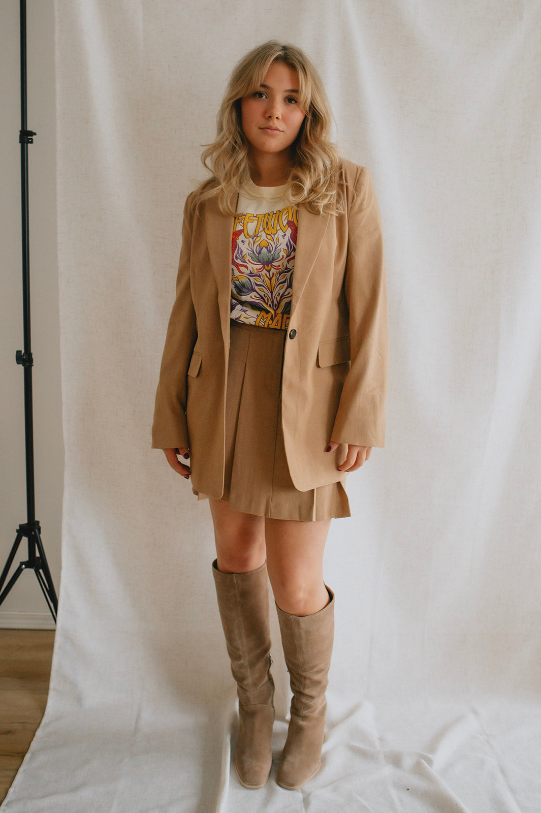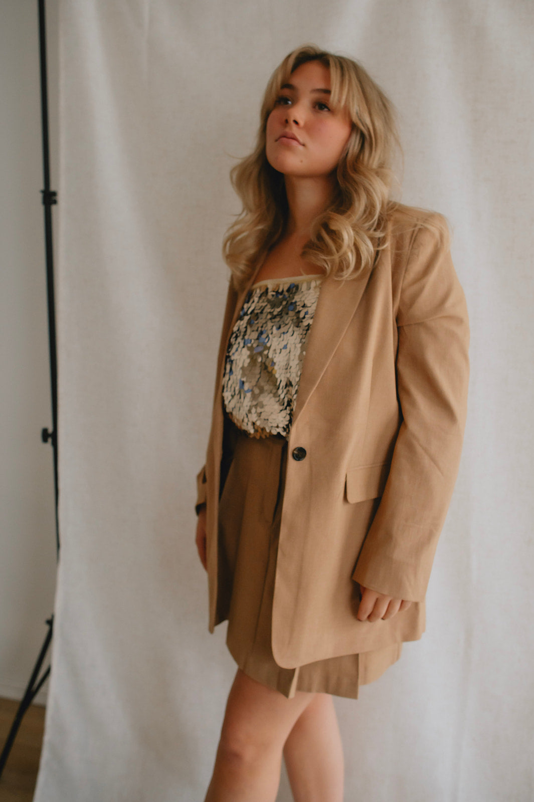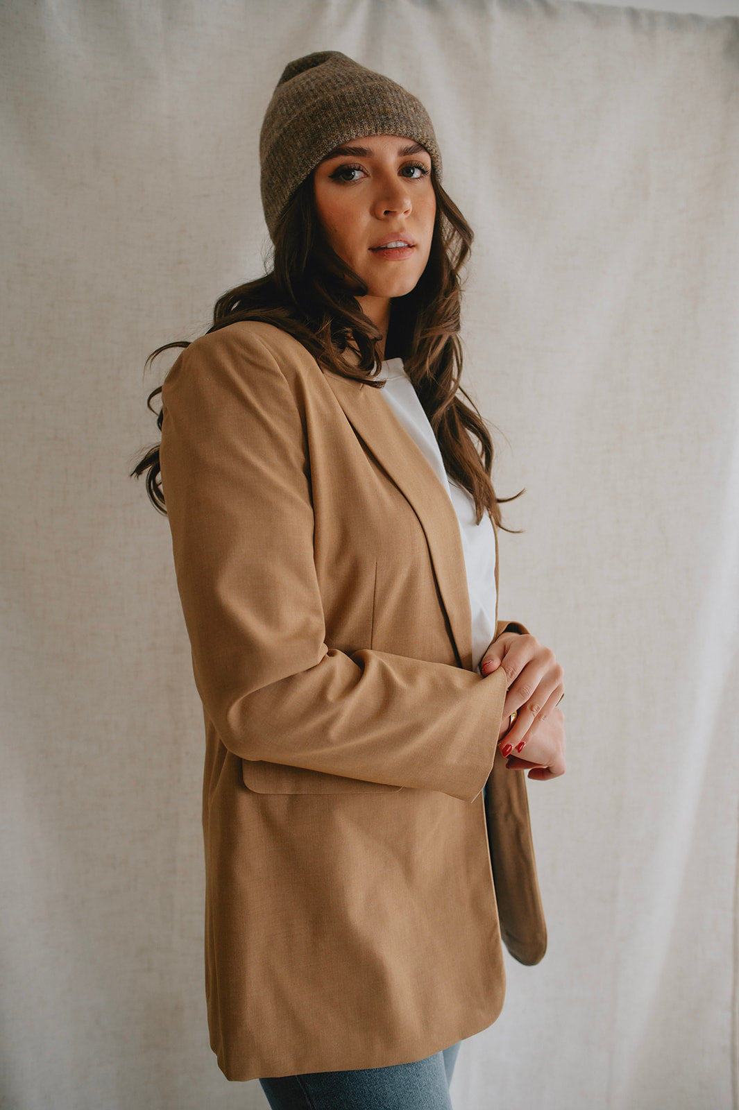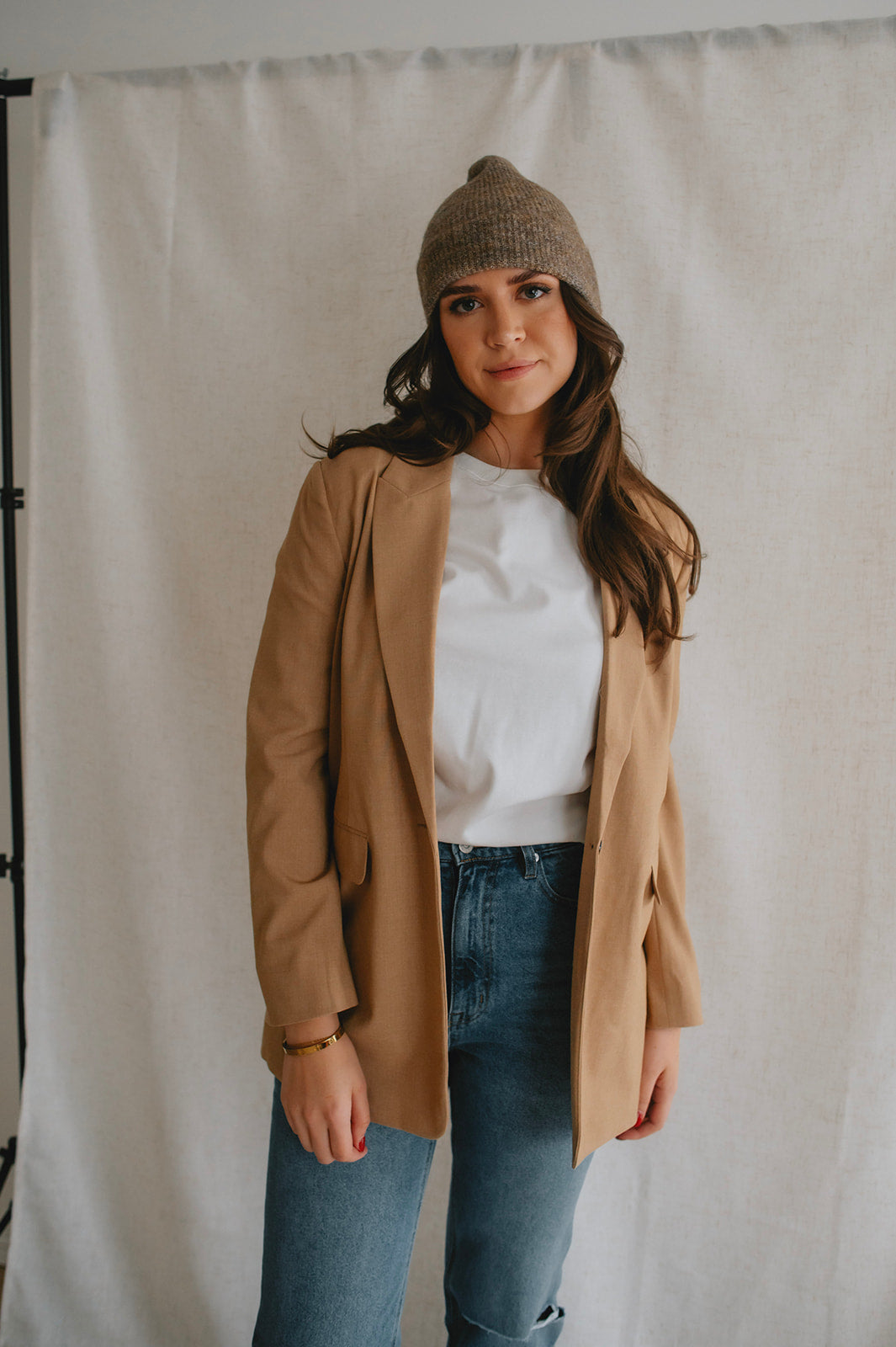 We're suckers for a good blazer. The length and colour is what sold us on this beauty! Slightly longer in through the body gives her a touch of modern femininity and the neutral tone keeps her easy to dress up and down. An instant classic!