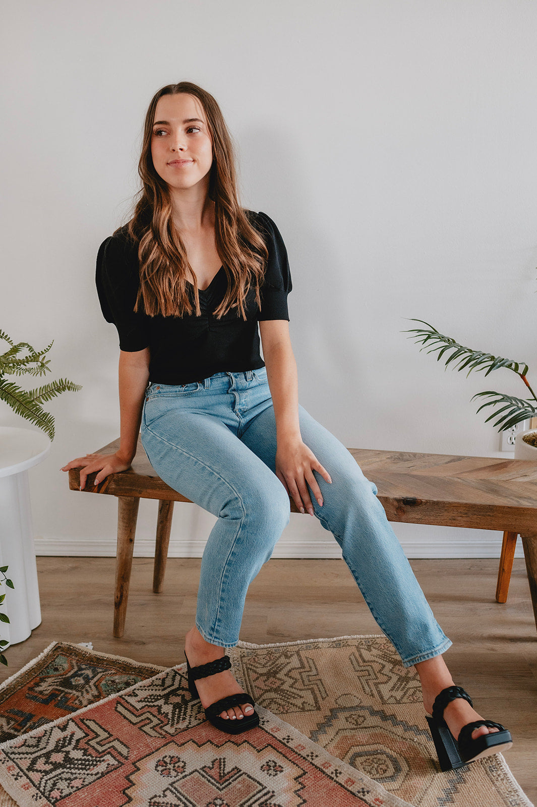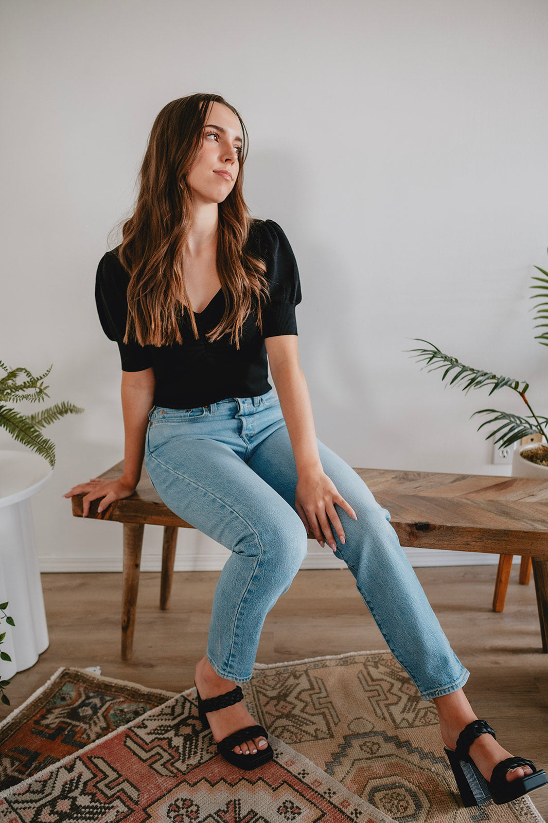 ropped, made of a fine ribbed knit, and has short balloon sleeves and heart necklin. She's super stretchy too which is always a bonus!