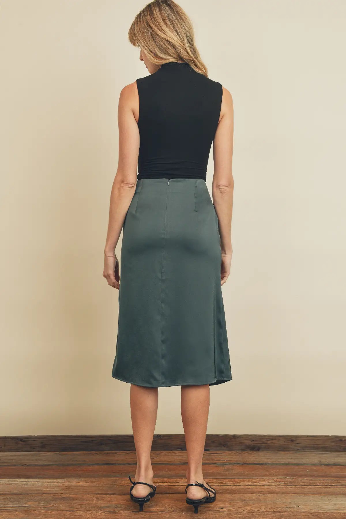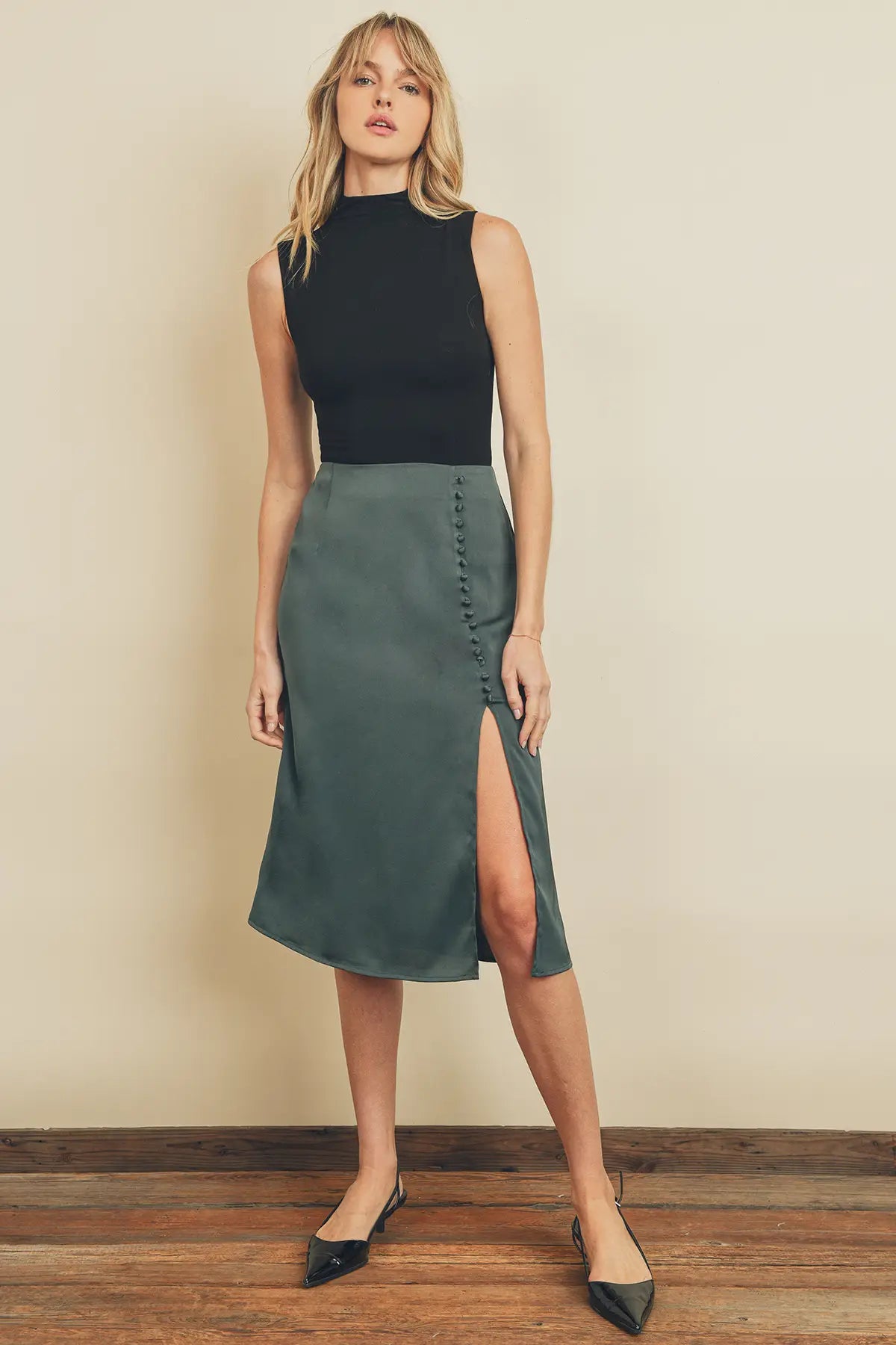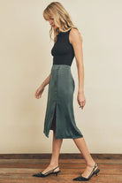 Feeling fancy? Elevate your wardrobe with the stunning Nyla Midi Skirt. Crafted from smooth satin, it drapes beautifully for a flattering silhouette. The elegant side button detailing adds a touch of sophistication, while the subtle side split offers ease of movement and a hint of allure. Perfect for both day and evening wear, this versatile piece pairs effortlessly with everything from crisp blouses to relaxed knits.