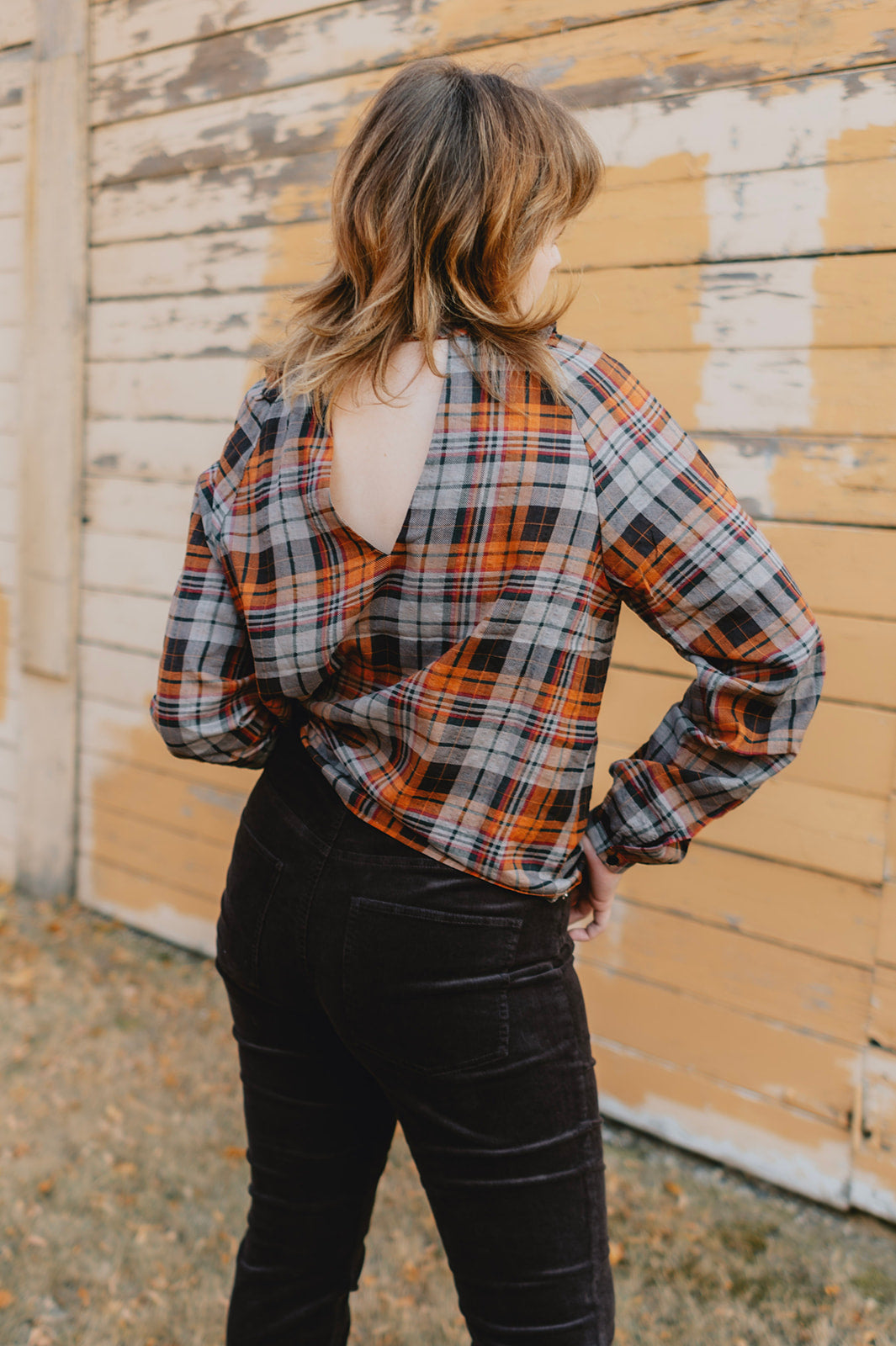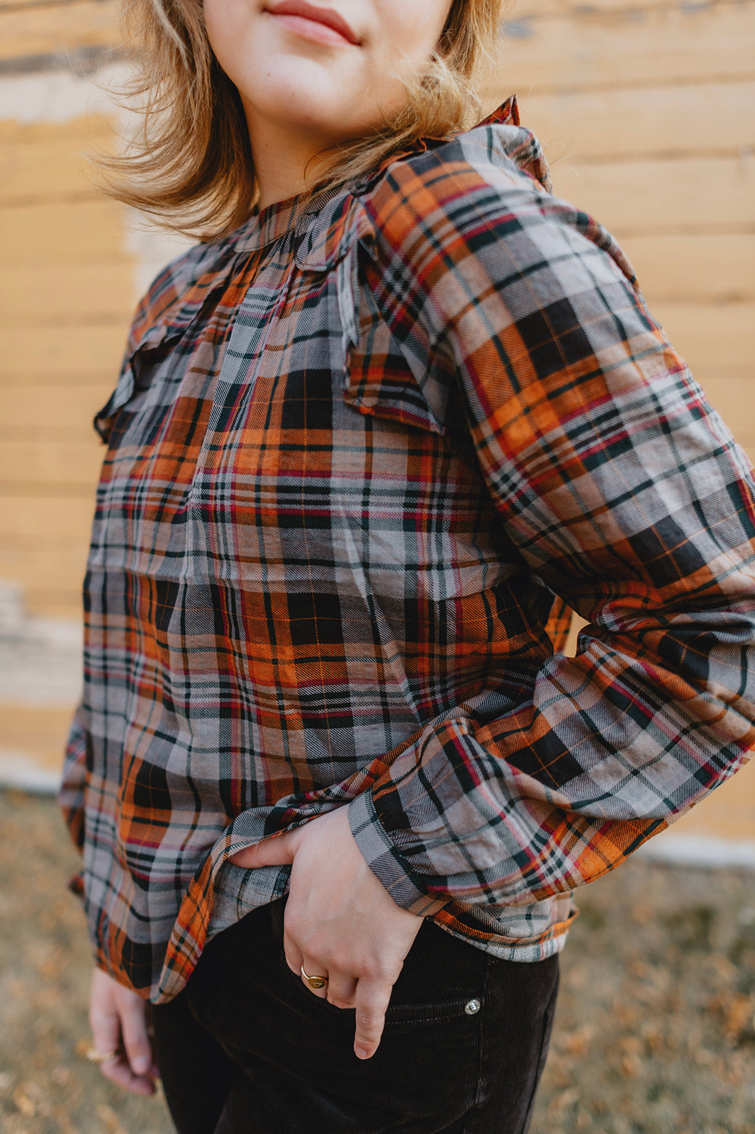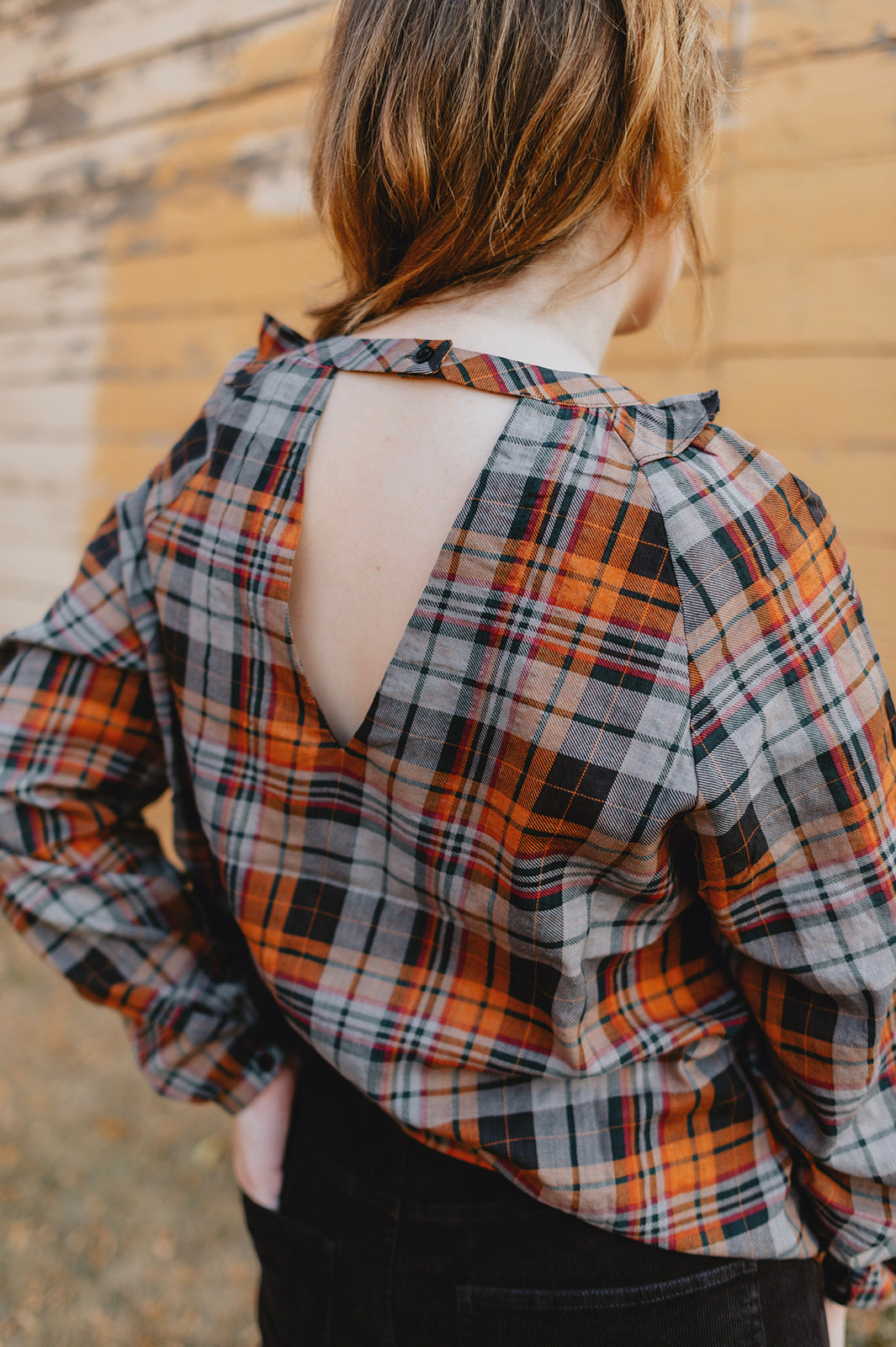 The Amora Plaid Blouse is the prettiest blouse featuring a cut out back, and ruffle details on the front. Tuck her into trousers, or some denim for a more casual look.