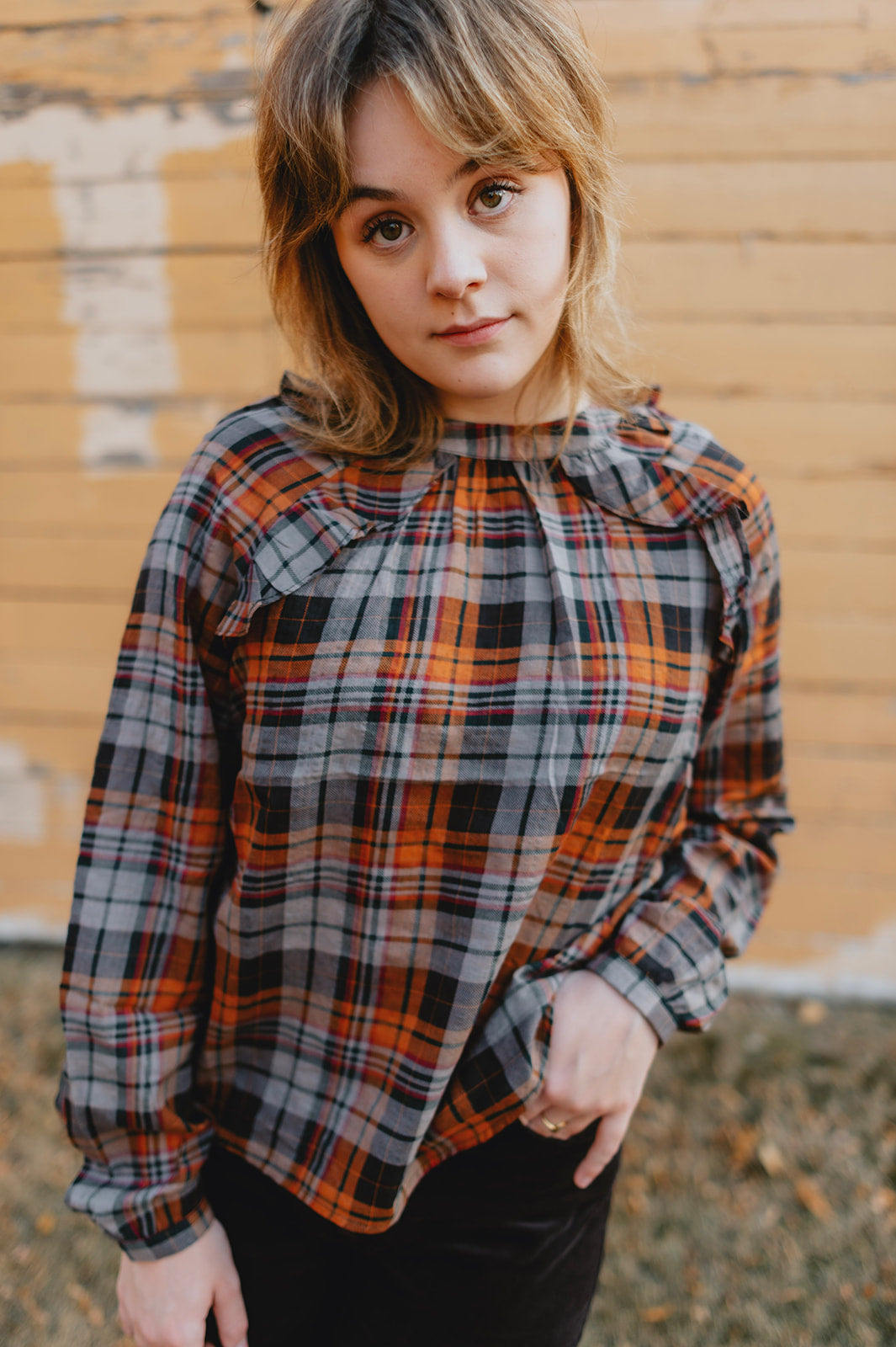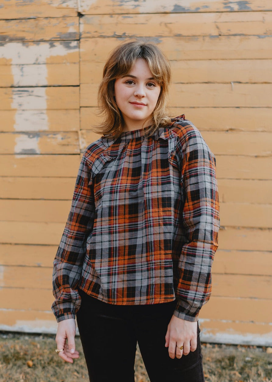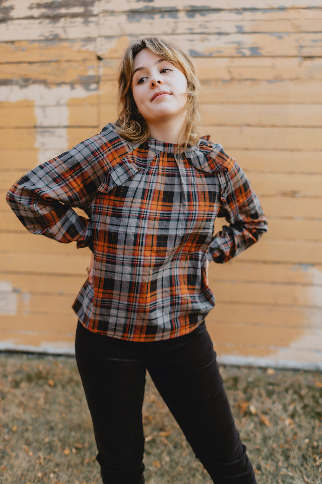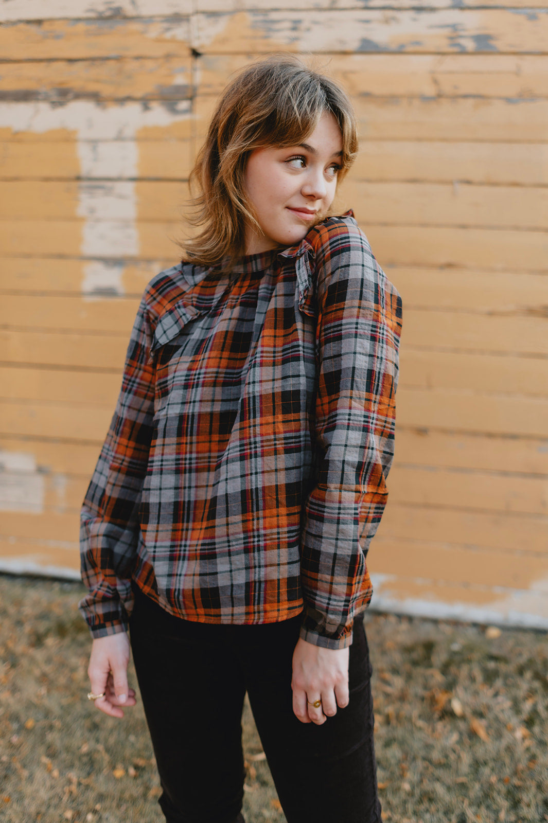The Amora Plaid Blouse is the prettiest blouse featuring a cut out back, and ruffle details on the front. Tuck her into trousers, or some denim for a more casual look.