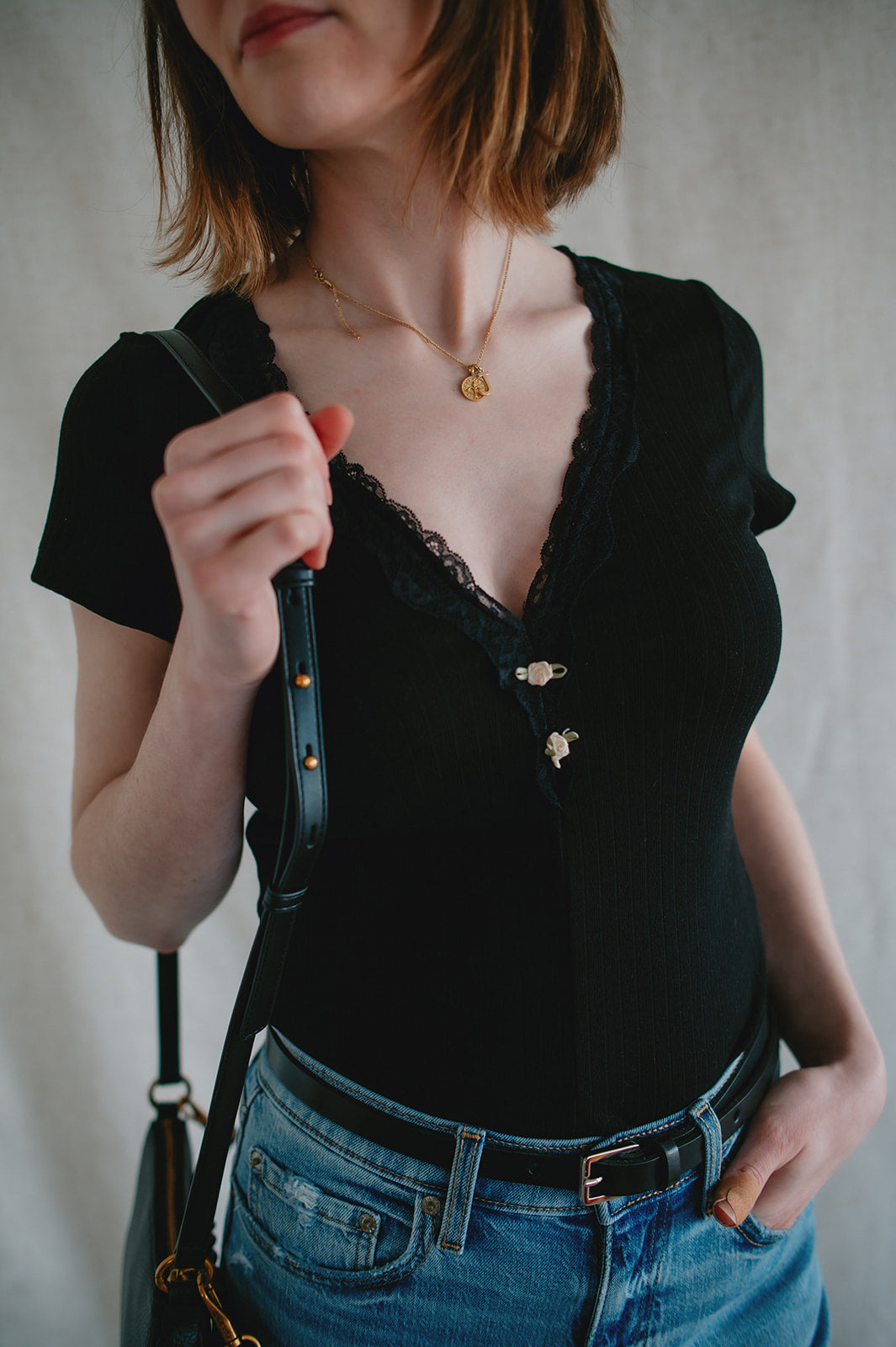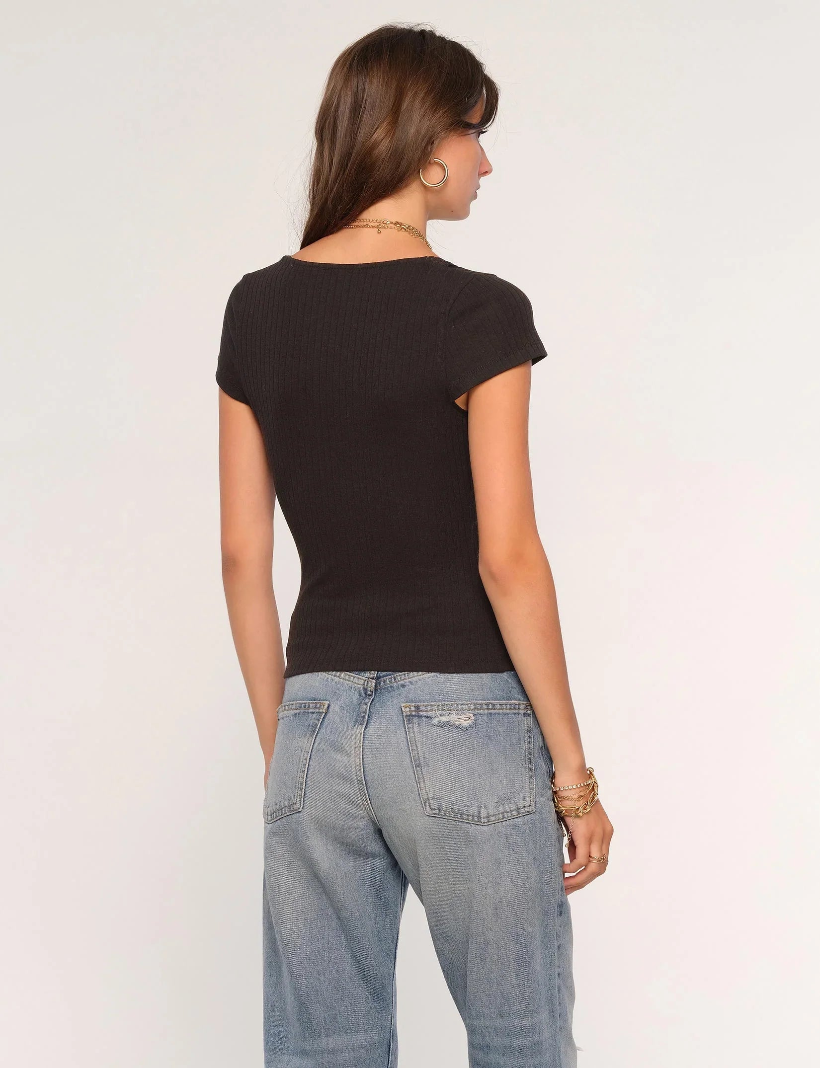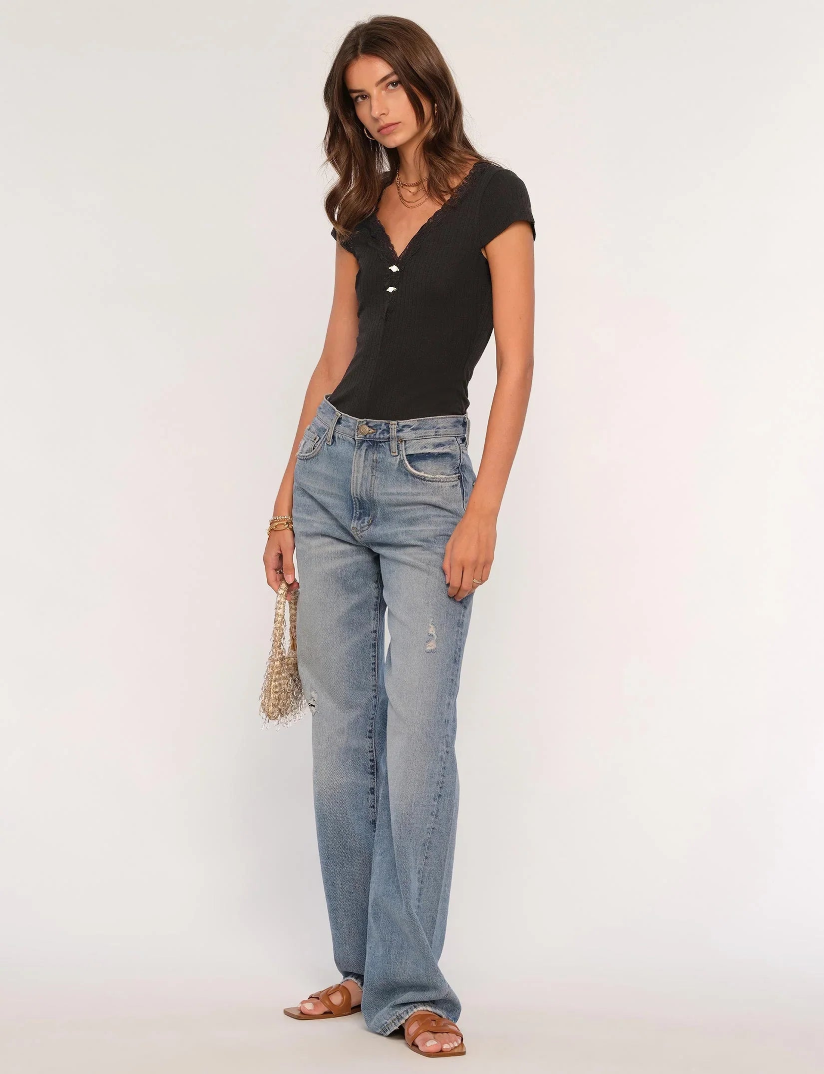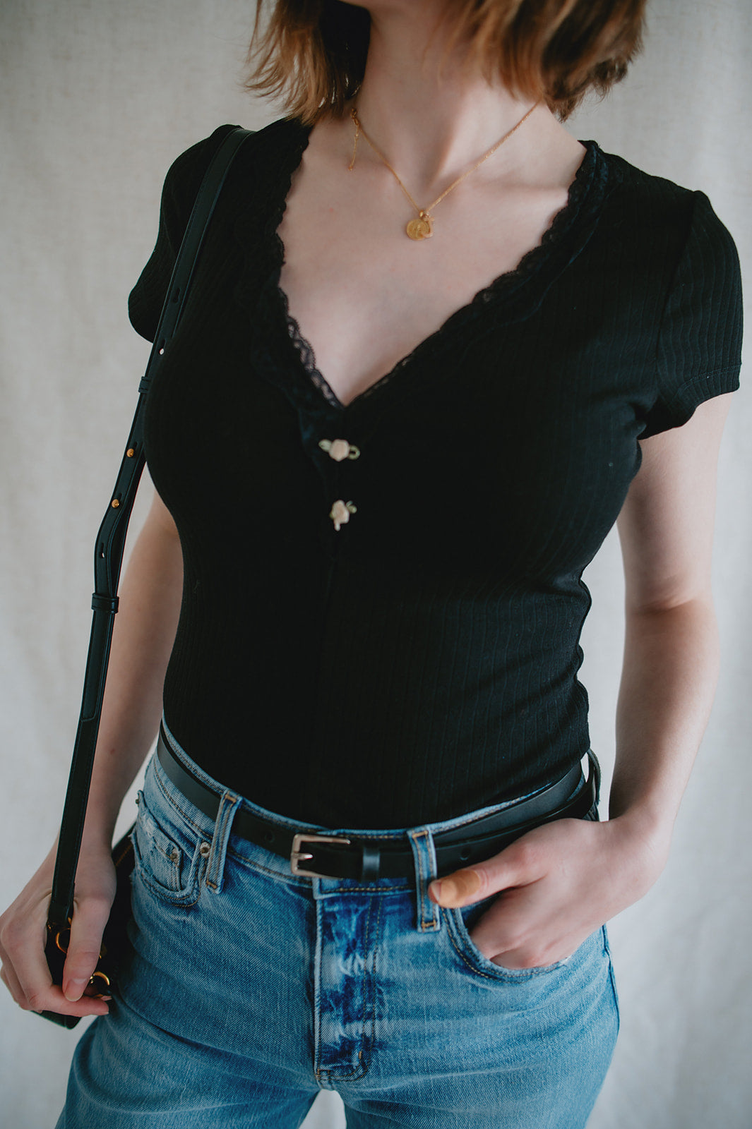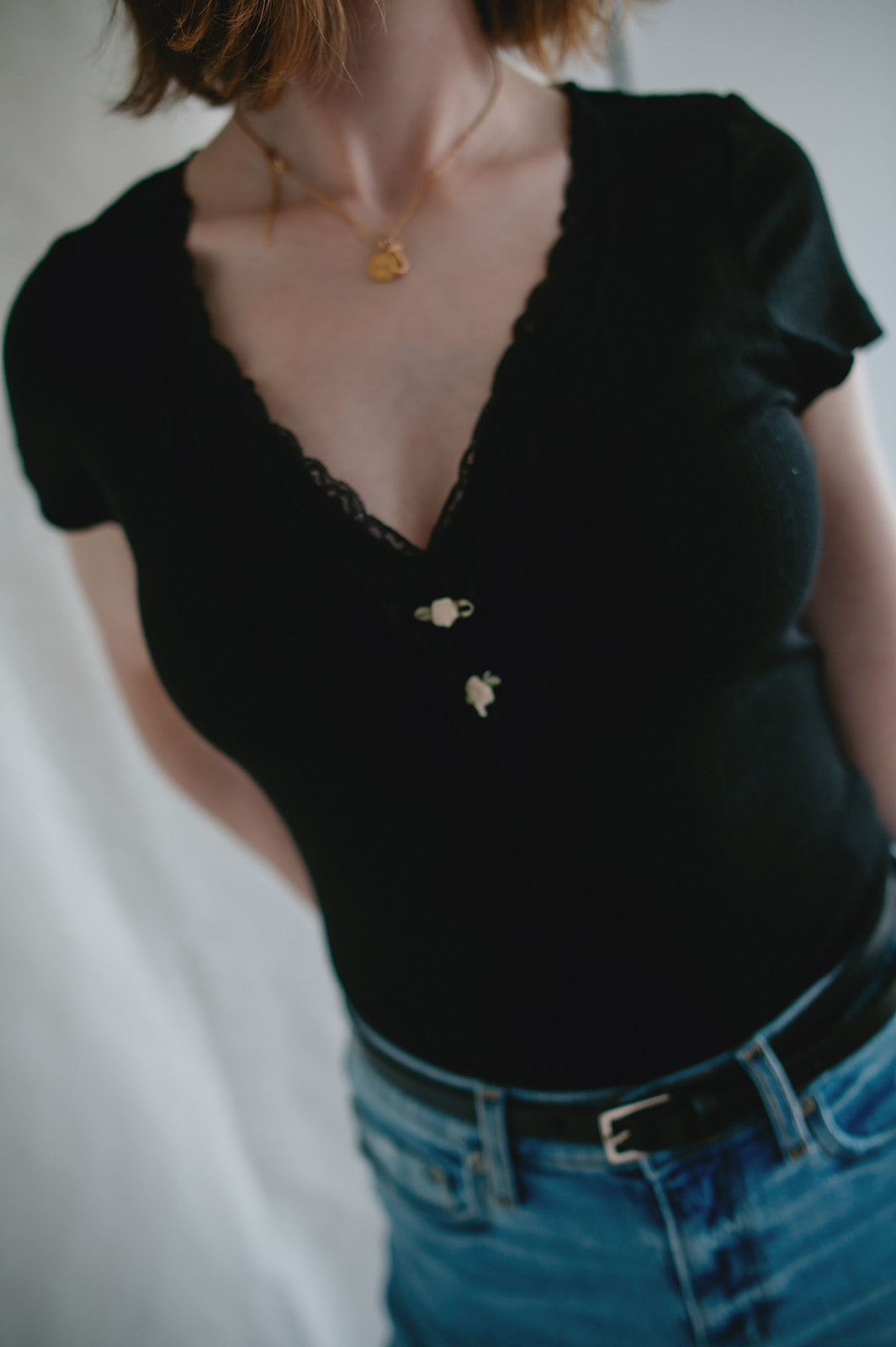 A pretty tee with a twist, The Aranelle Top. Made from a soft ribbed knit, it features lace trim, delicate v-neck and rosette details. Dress it up with a pair of wide leg trousers or dress it down with denim.