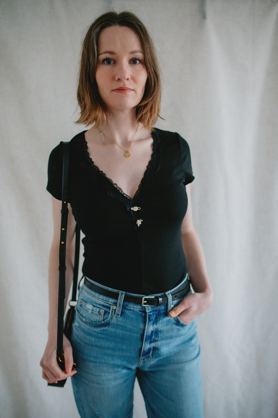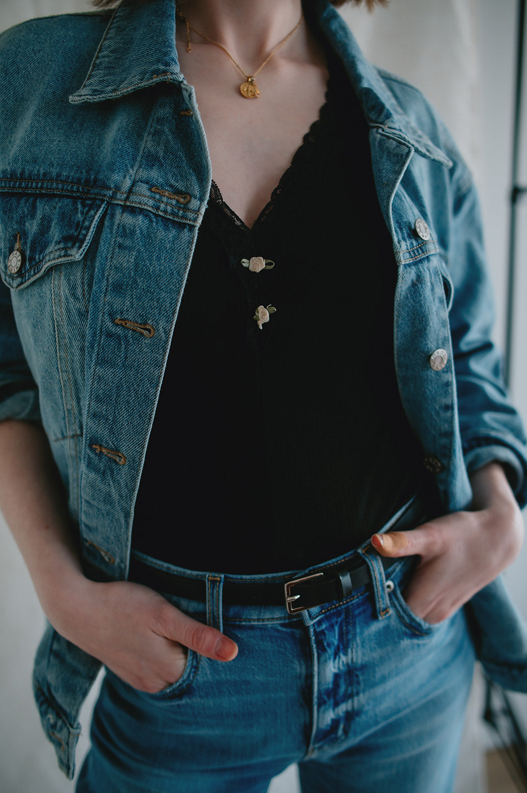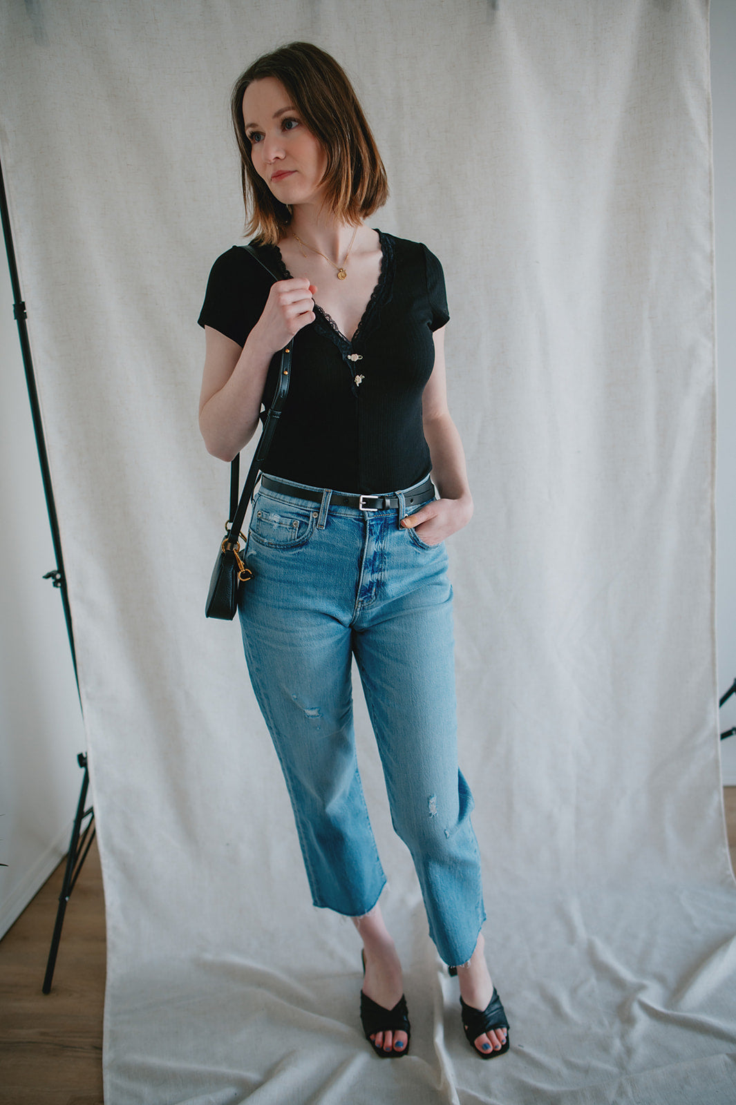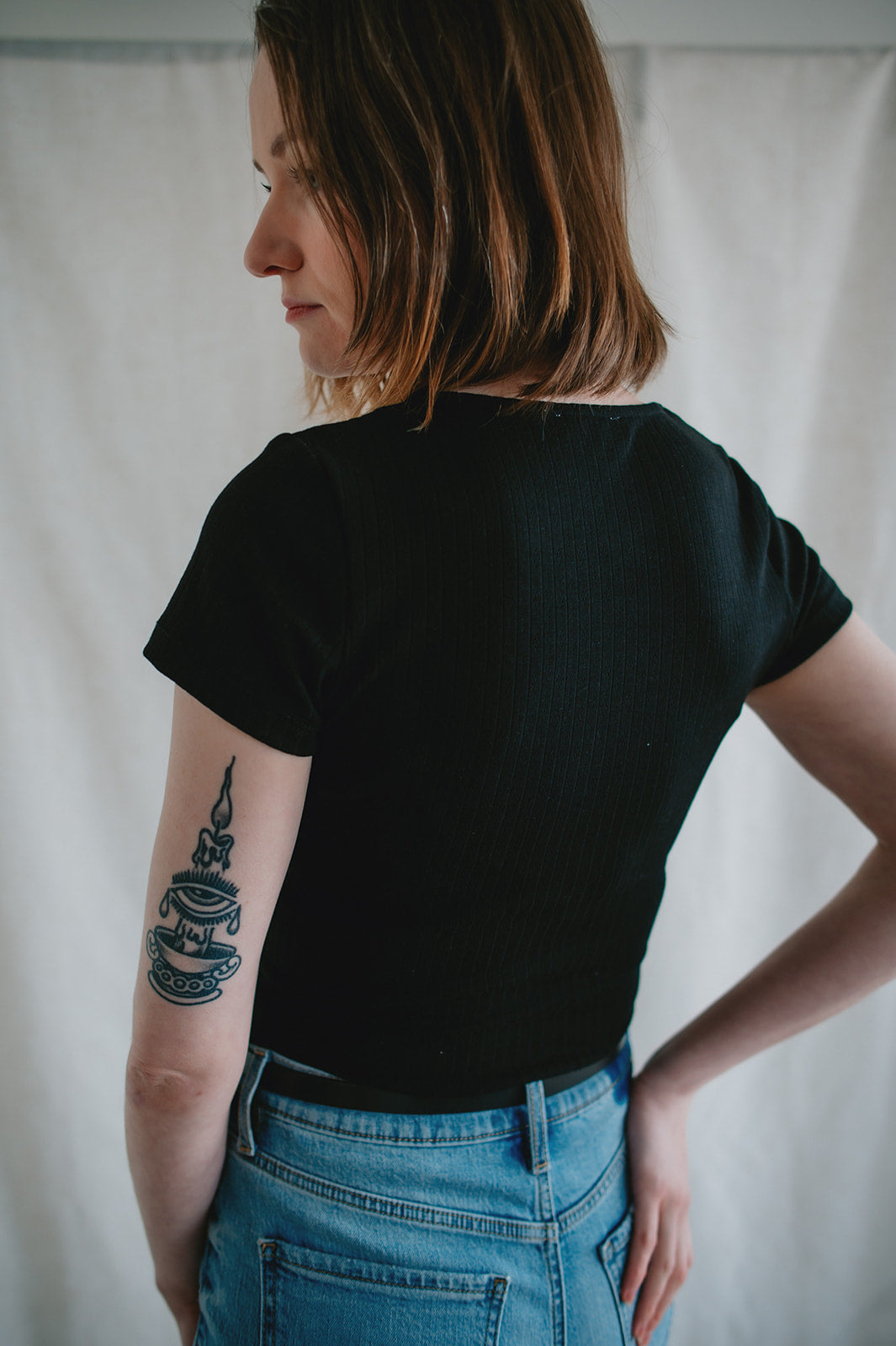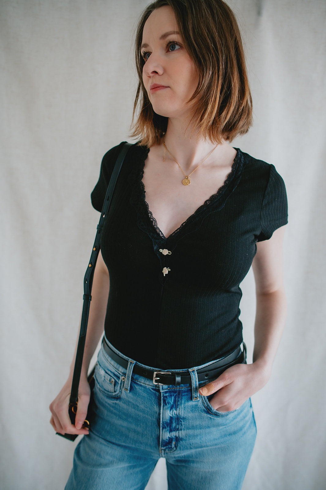 A pretty tee with a twist, The Aranelle Top. Made from a soft ribbed knit, it features lace trim, delicate v-neck and rosette details. Dress it up with a pair of wide leg trousers or dress it down with denim.