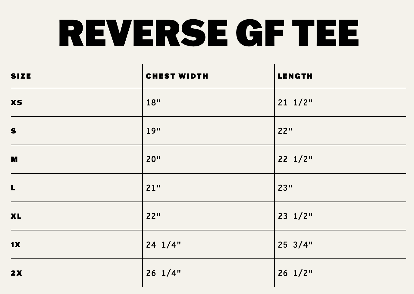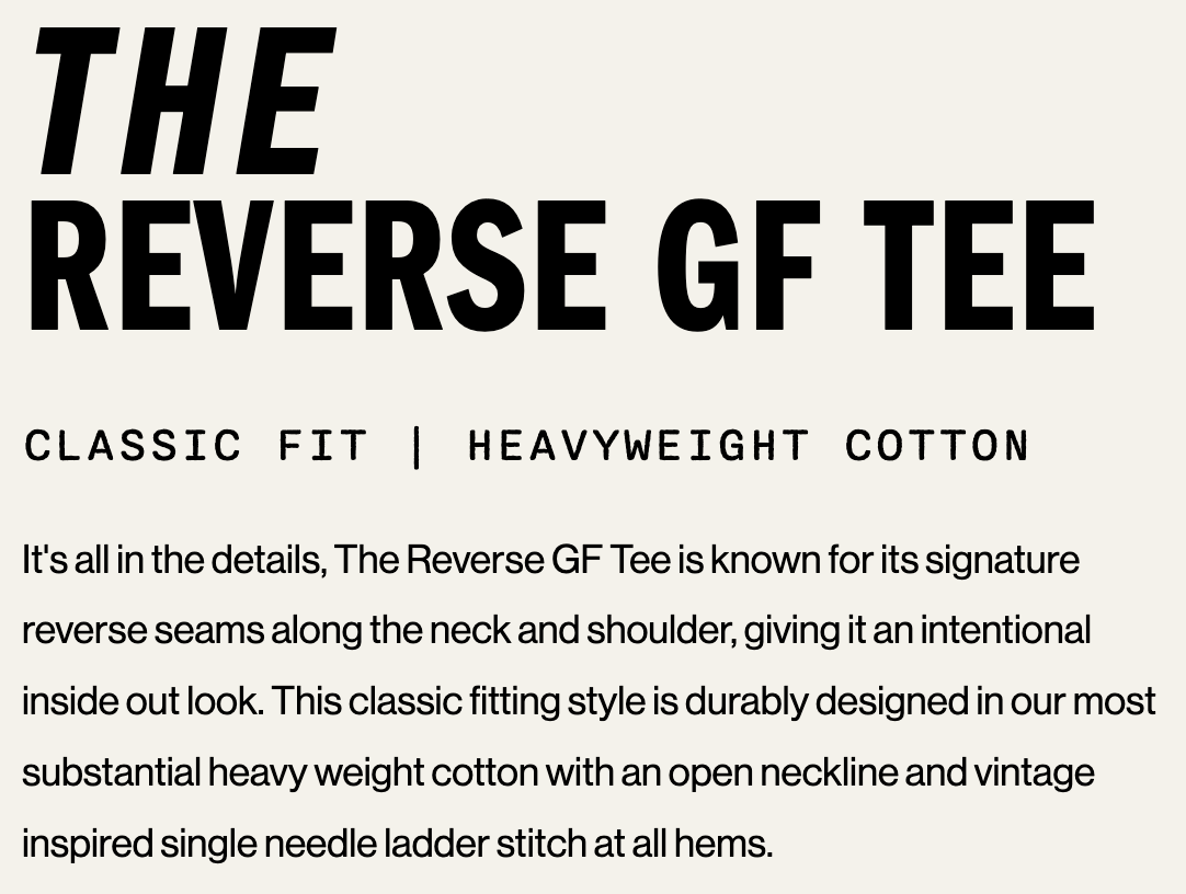 - The Reverse GF Tee is a classic fitting style, durably designed in our most substantial heavy weight cotton with signature reverse seams along the neck and shoulder, giving it an intentional inside out look.