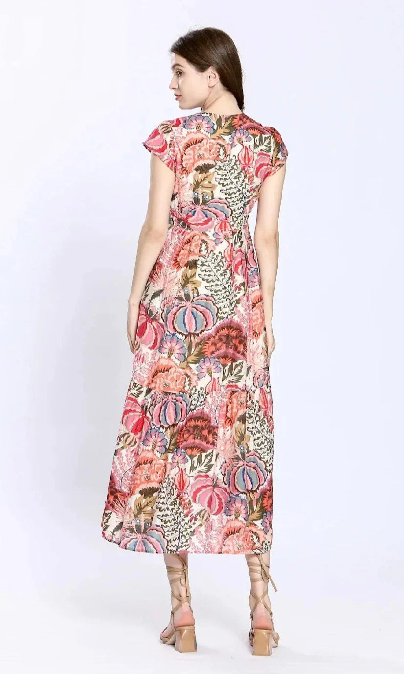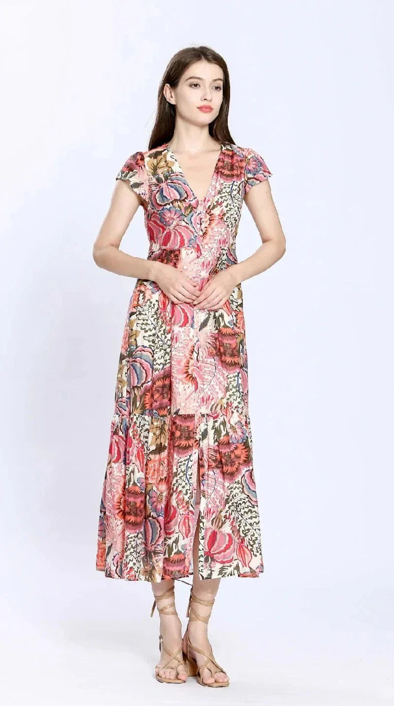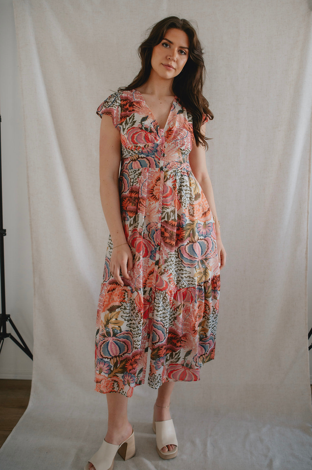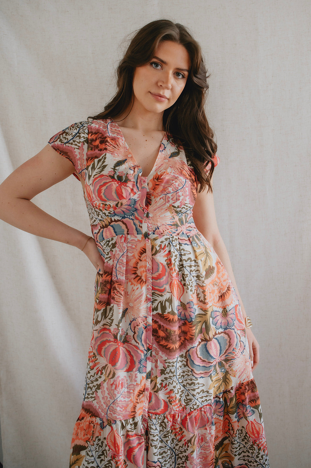 Introducing the Bryony Floral Midi Dress, a romantic and feminine addition to your wardrobe. With a flattering v-neckline and cap sleeves, it offers a delicate silhouette that exudes effortless charm. The front buttons on the bodice add a touch of vintage-inspired flair, while the tiered skirt lends movement and grace. Adorned with a pink multi-floral pattern and fully lined for comfort, it's perfect for any special occasion or sunny day outing.
