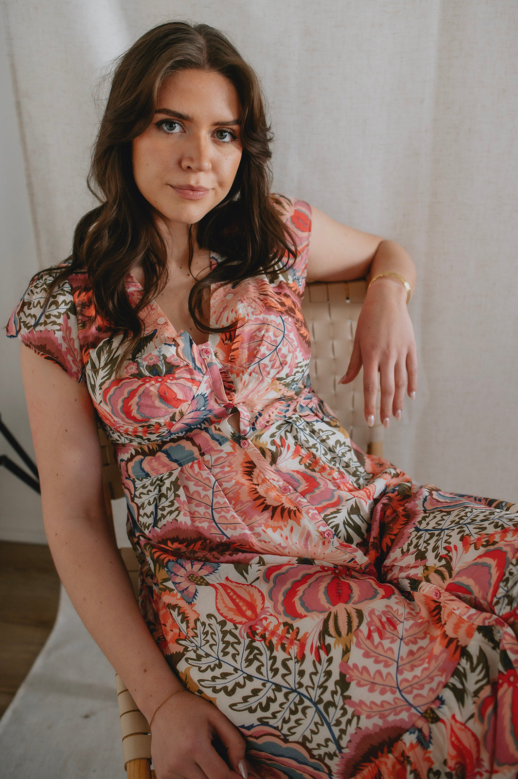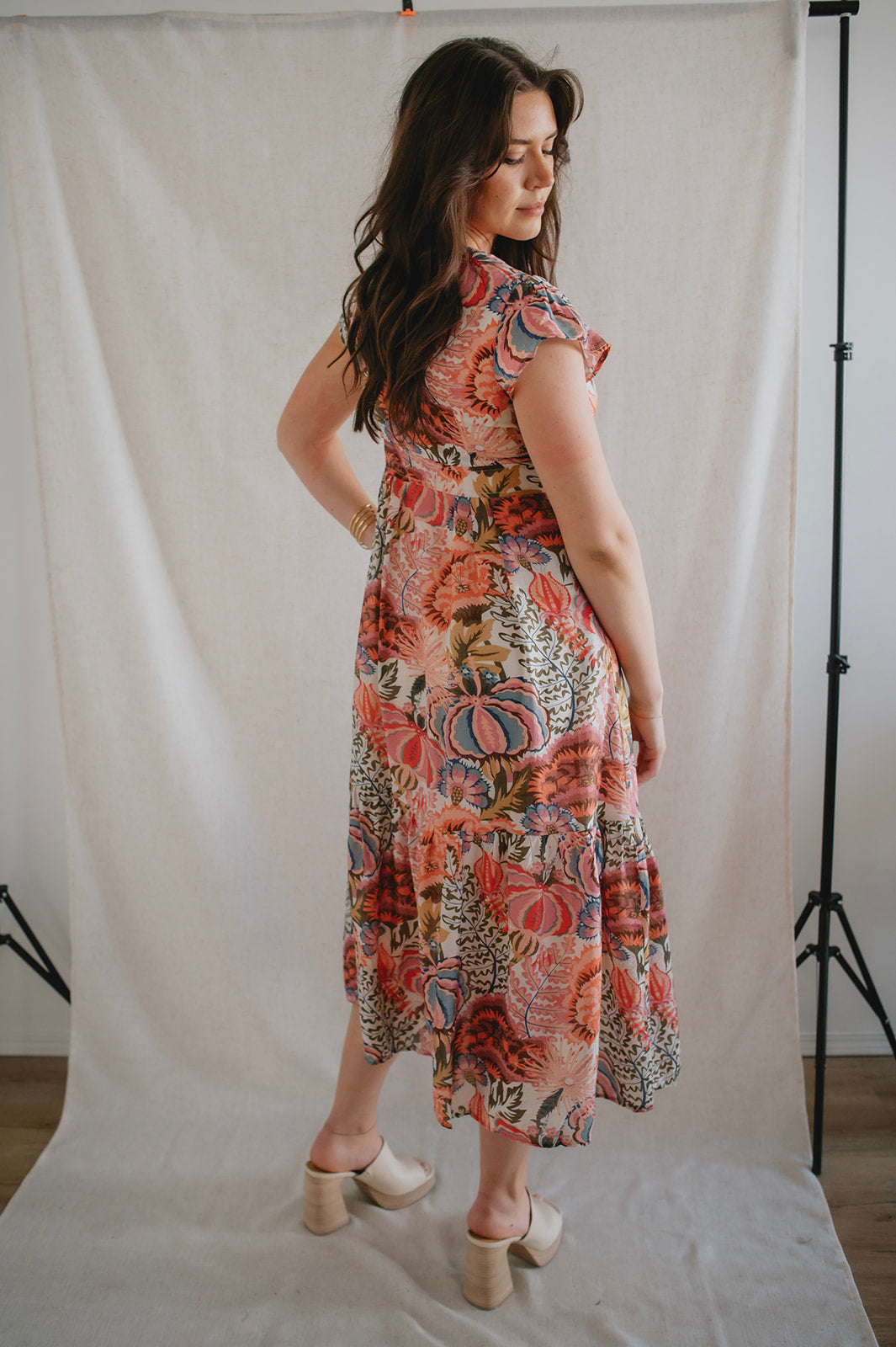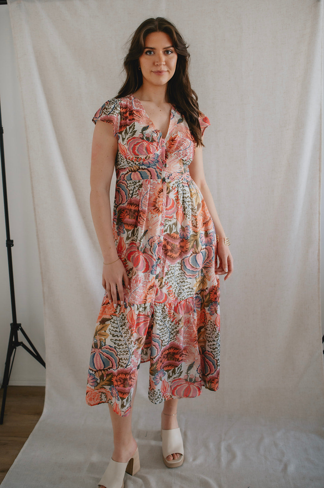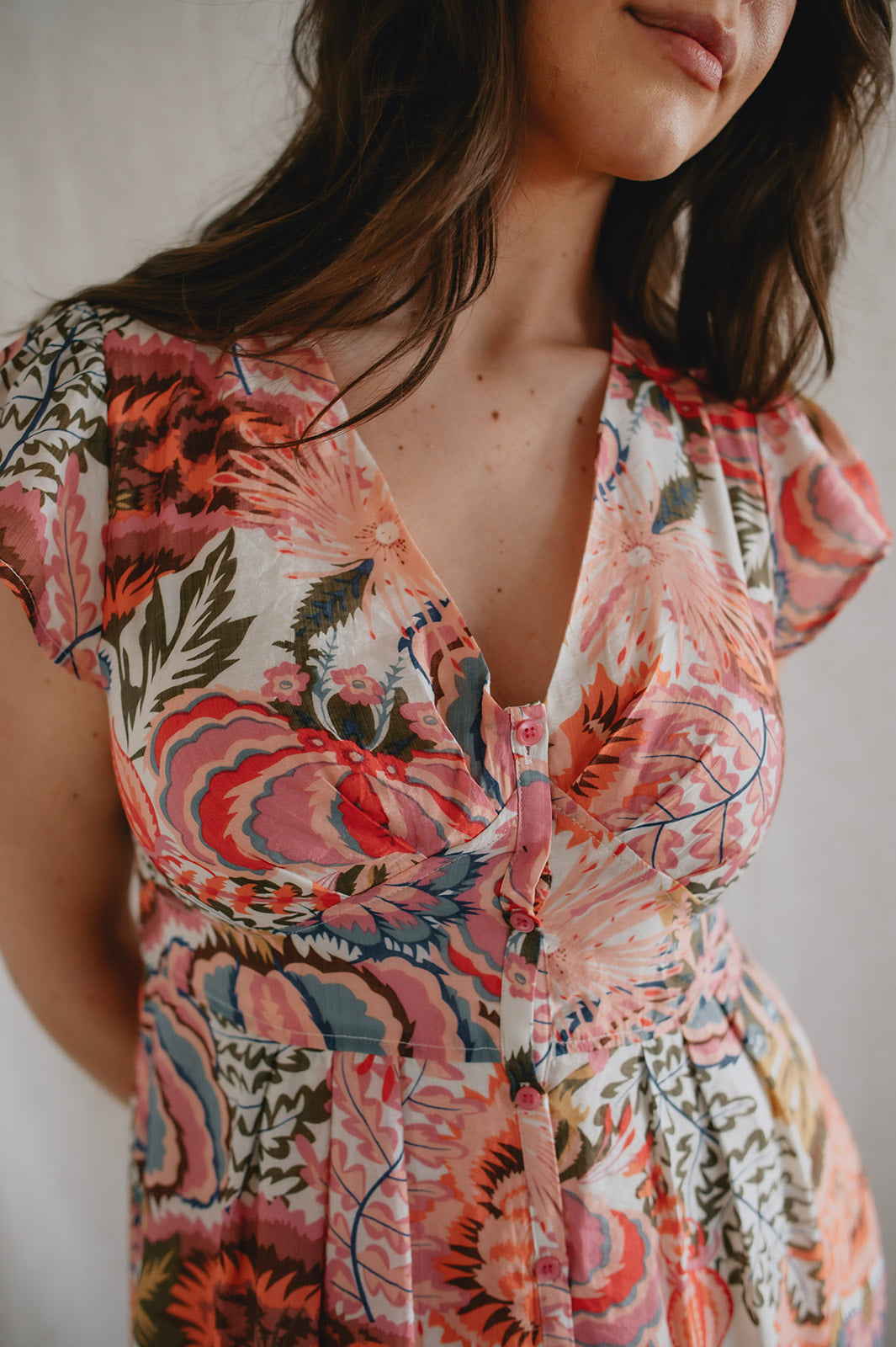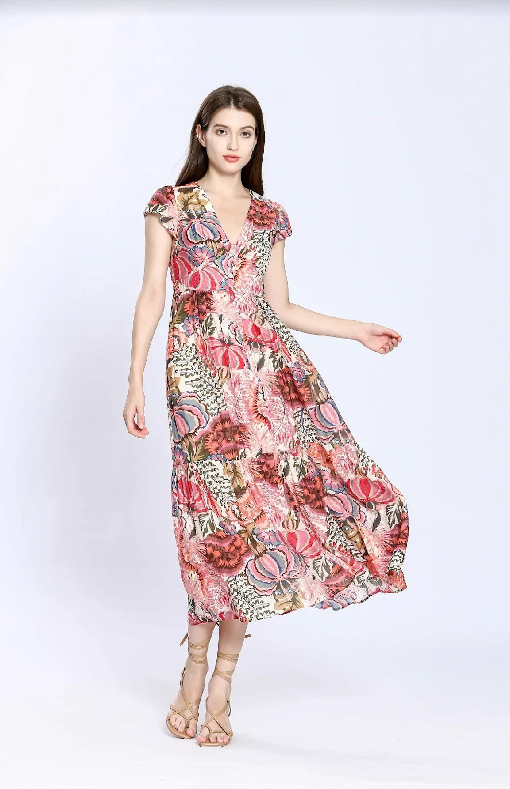 Introducing the Bryony Floral Midi Dress, a romantic and feminine addition to your wardrobe. With a flattering v-neckline and cap sleeves, it offers a delicate silhouette that exudes effortless charm. The front buttons on the bodice add a touch of vintage-inspired flair, while the tiered skirt lends movement and grace. Adorned with a pink multi-floral pattern and fully lined for comfort, it's perfect for any special occasion or sunny day outing.