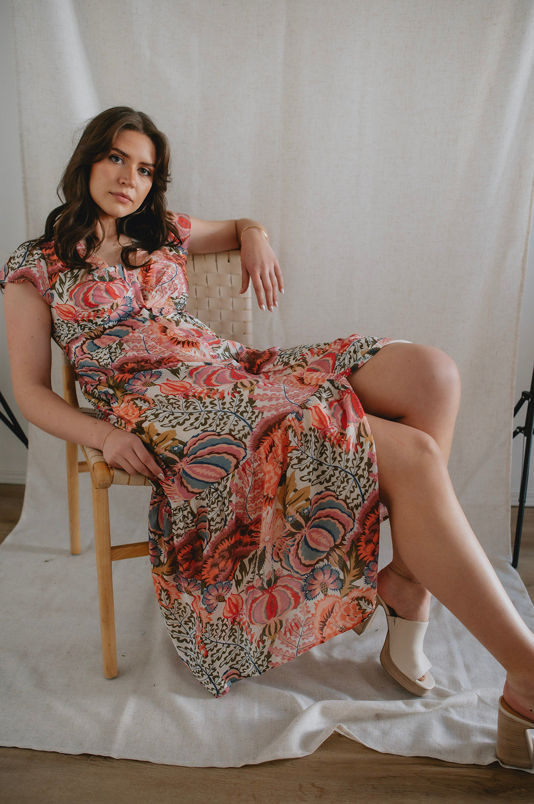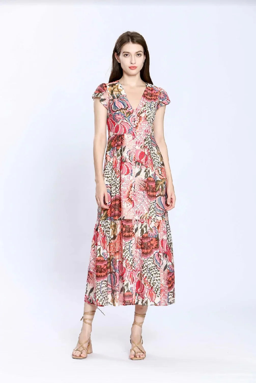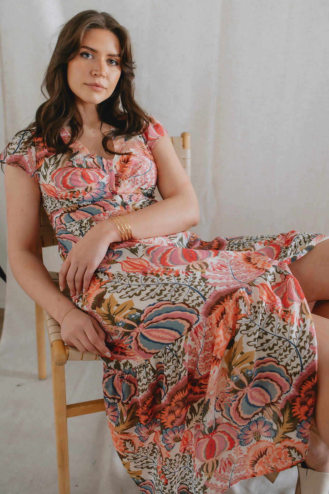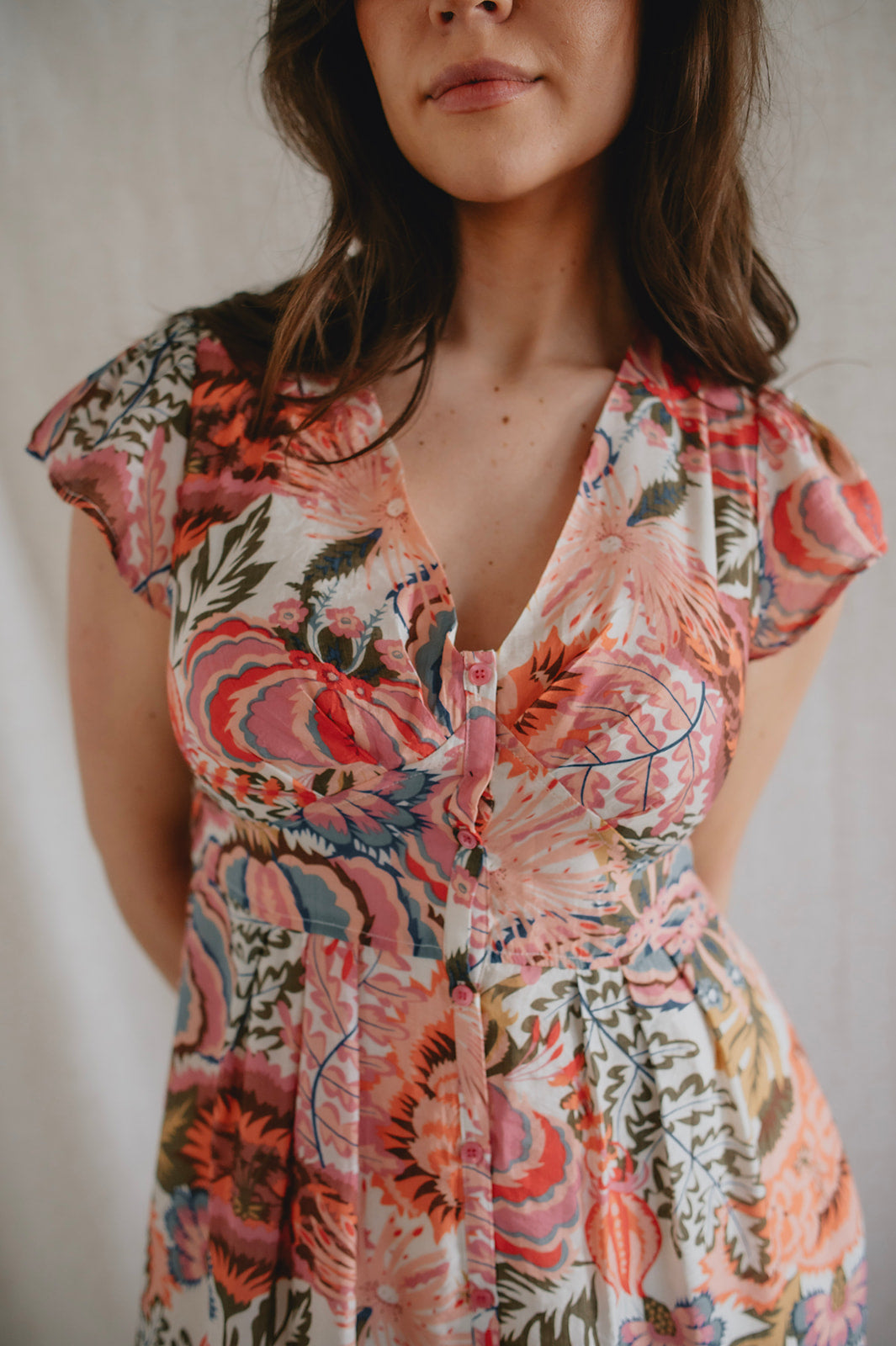 Introducing the Bryony Floral Midi Dress, a romantic and feminine addition to your wardrobe. With a flattering v-neckline and cap sleeves, it offers a delicate silhouette that exudes effortless charm. The front buttons on the bodice add a touch of vintage-inspired flair, while the tiered skirt lends movement and grace. Adorned with a pink multi-floral pattern and fully lined for comfort, it's perfect for any special occasion or sunny day outing.