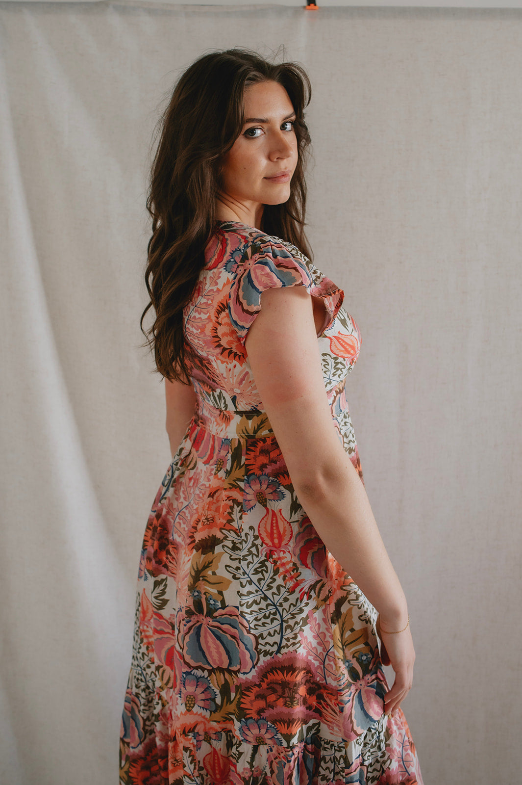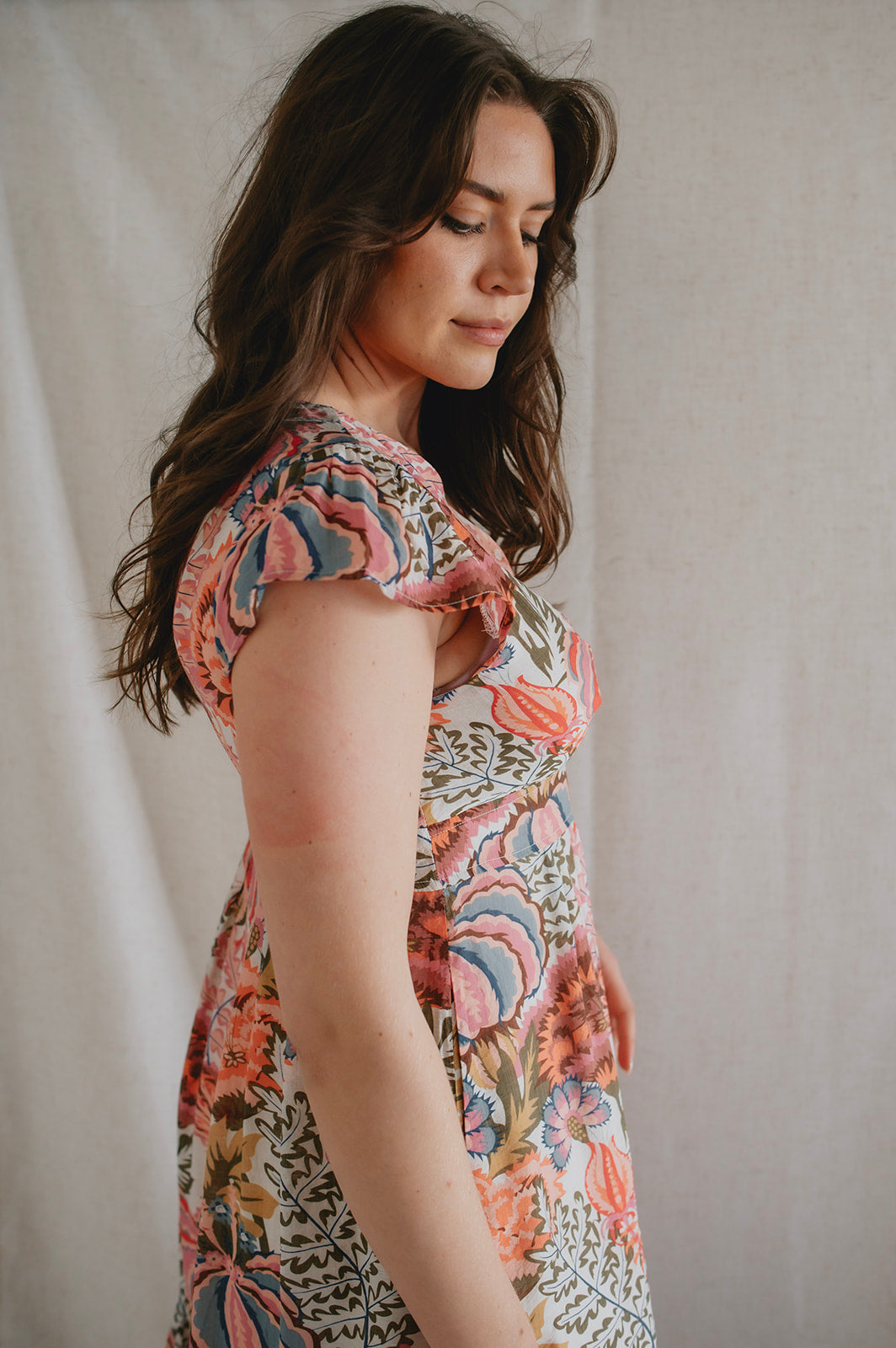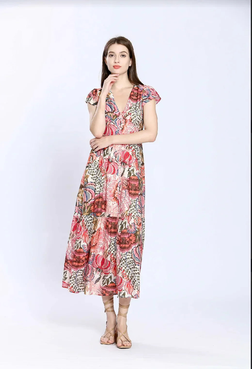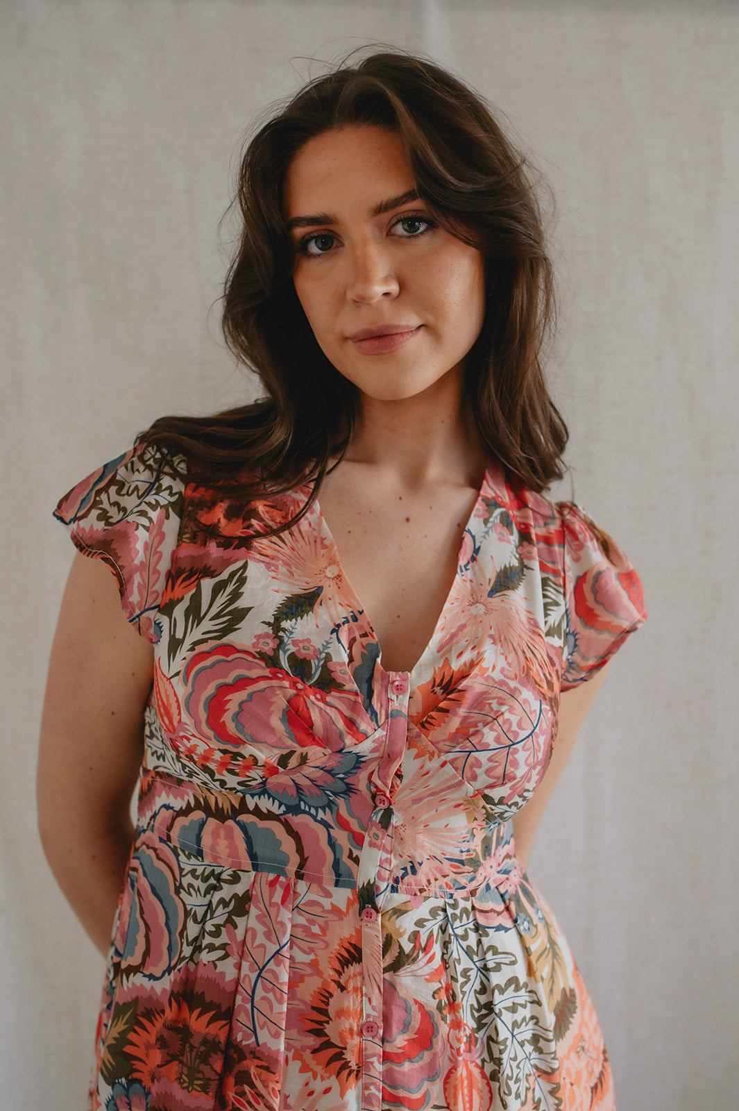 Introducing the Bryony Floral Midi Dress, a romantic and feminine addition to your wardrobe. With a flattering v-neckline and cap sleeves, it offers a delicate silhouette that exudes effortless charm. The front buttons on the bodice add a touch of vintage-inspired flair, while the tiered skirt lends movement and grace. Adorned with a pink multi-floral pattern and fully lined for comfort, it's perfect for any special occasion or sunny day outing.