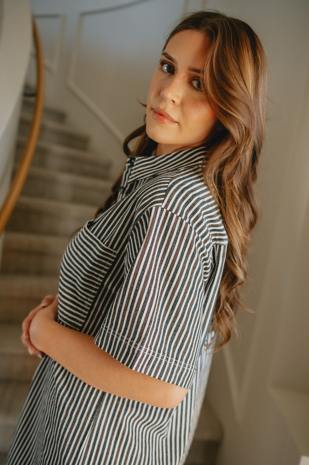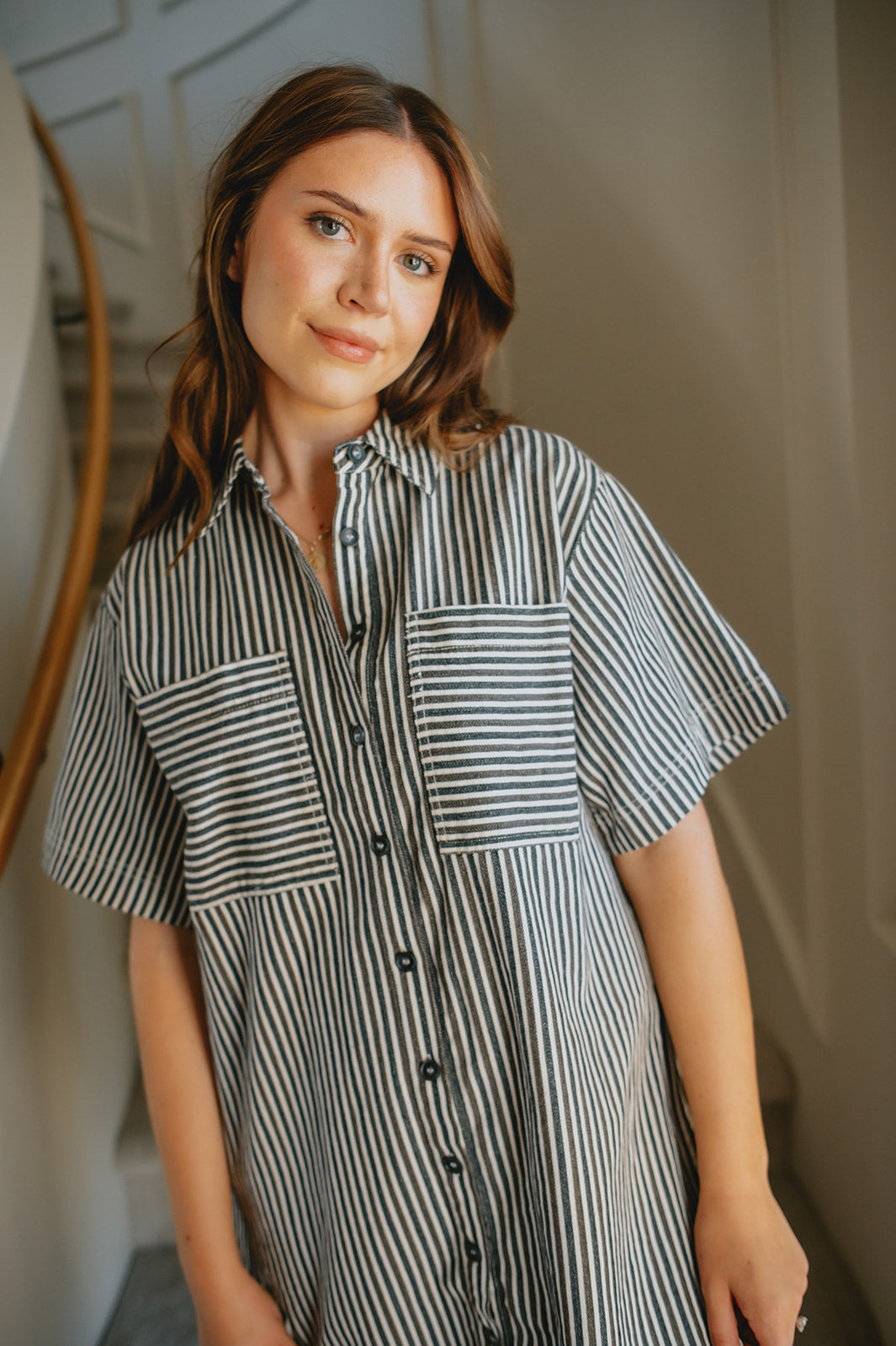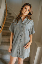 Experience effortless style with the FRNCH Dalva Dress! The short shirt dress features a fluid, textured fabric that adds a touch of elegance. The shirt collar and two chest pockets offer a classic look, while the short sleeves provide comfort in warmer weather. Elevate your wardrobe with this versatile and chic dress!