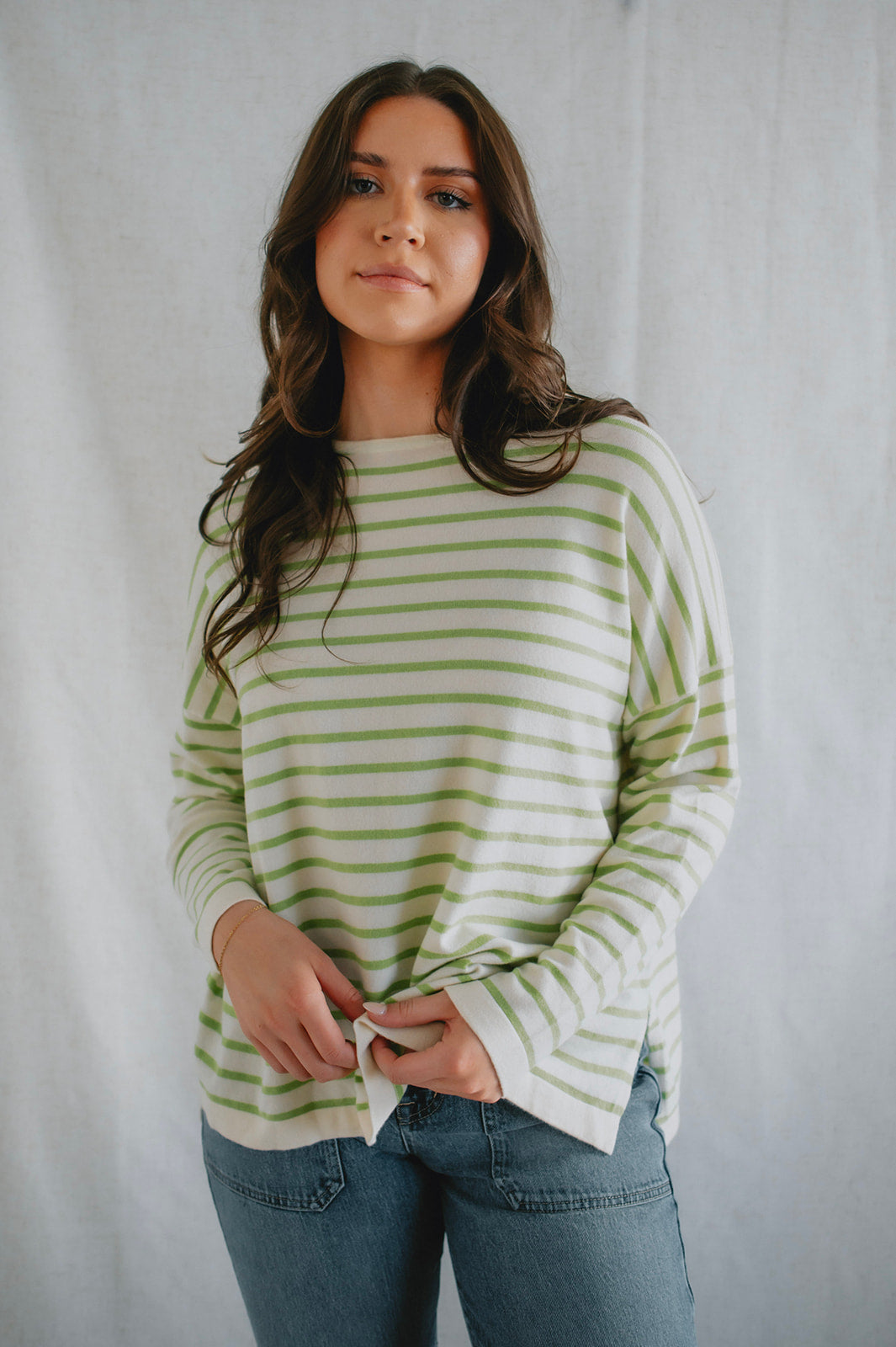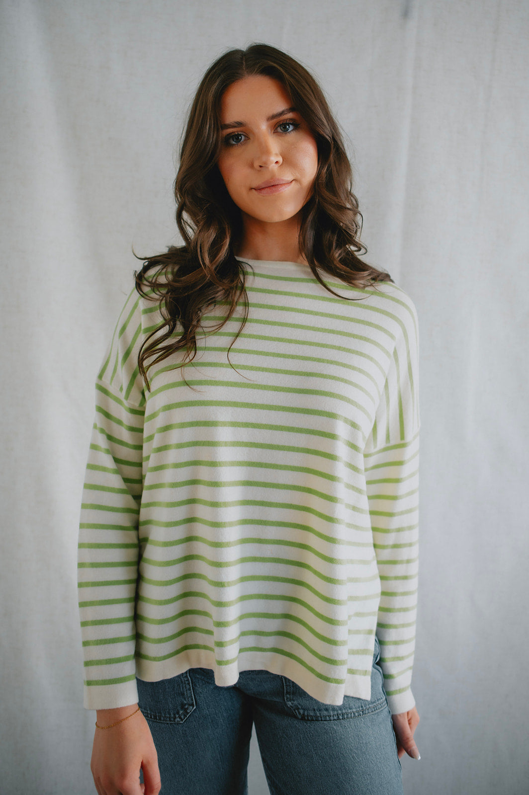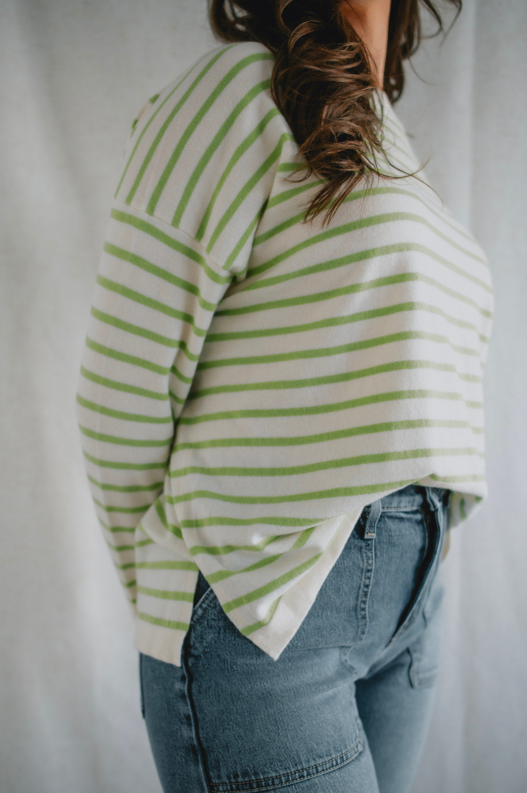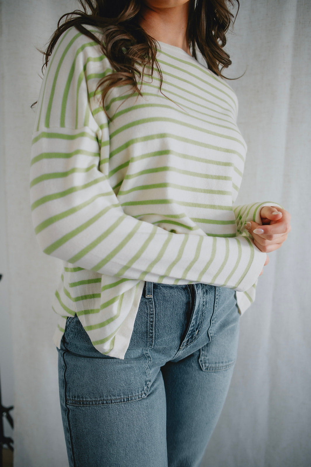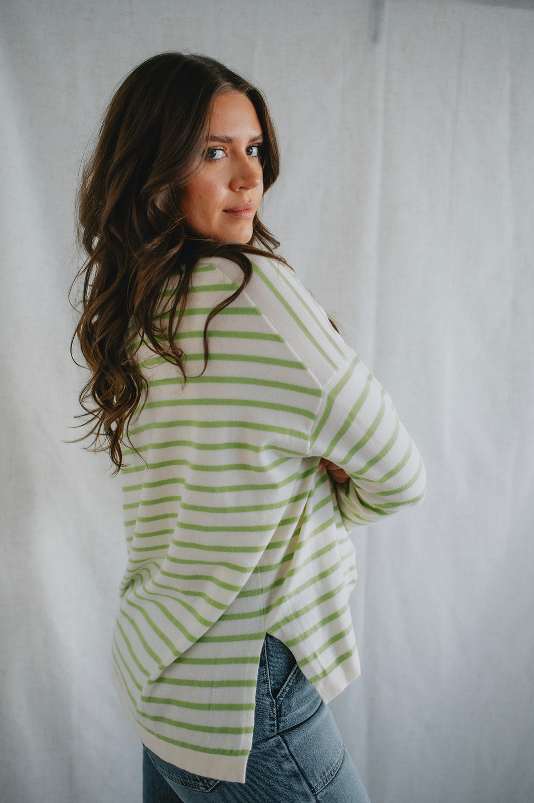 The Eileen sweater is the perfect sweater for spring and summer. The dropped shoulder and boxy body gives an updated shape to a classic item and the green stripes stay on trend for the season. The fabric is so light and so soft but still offers coverage.