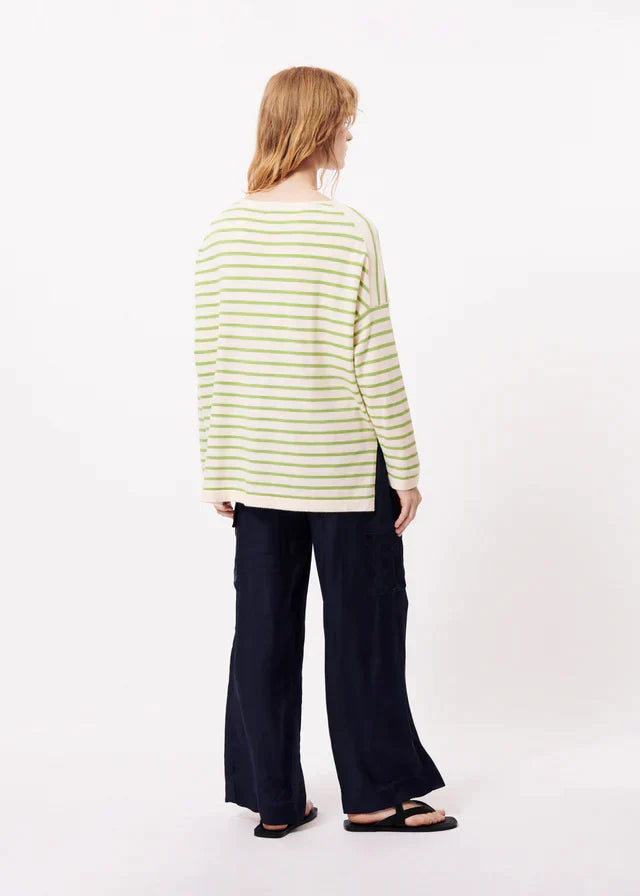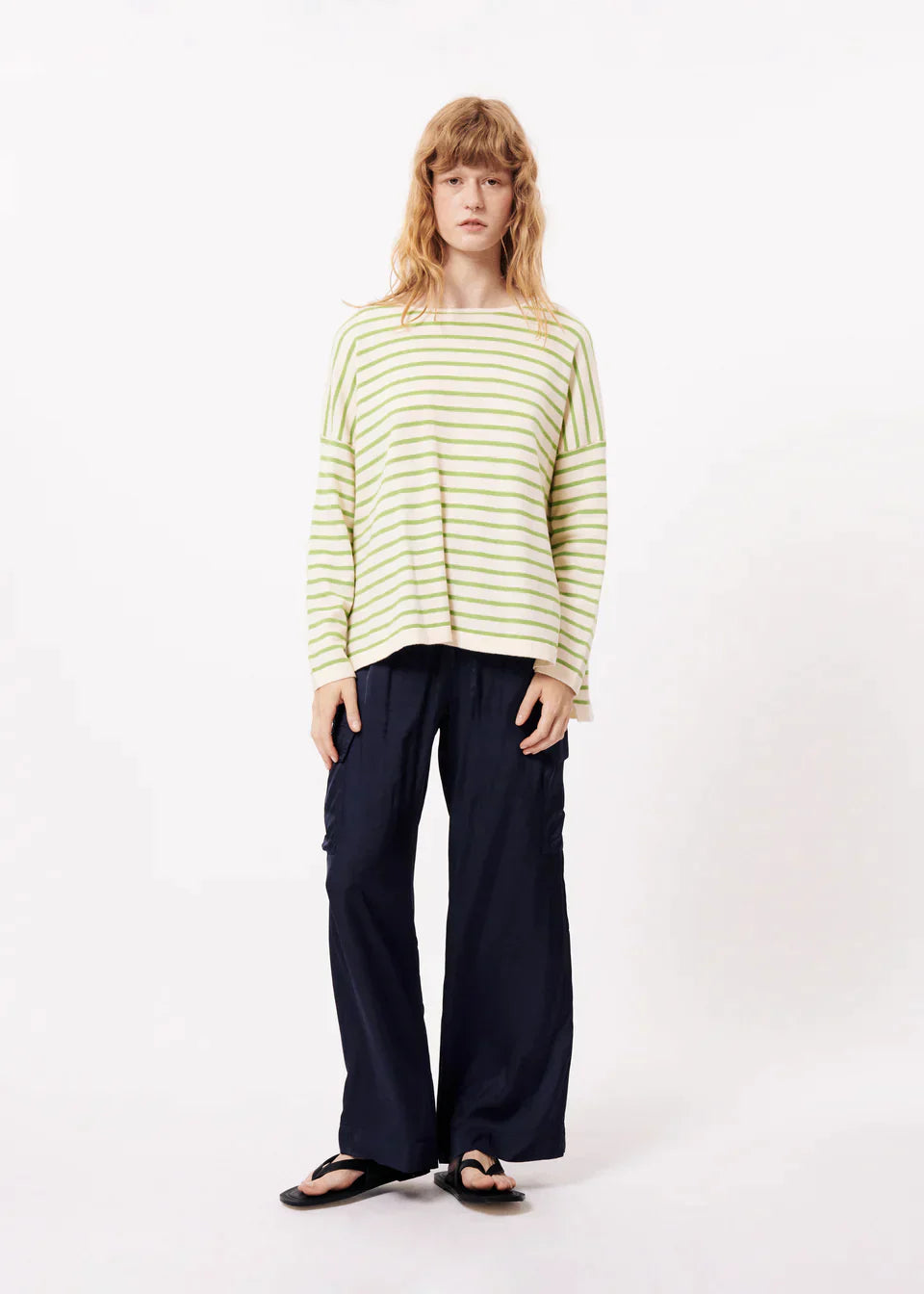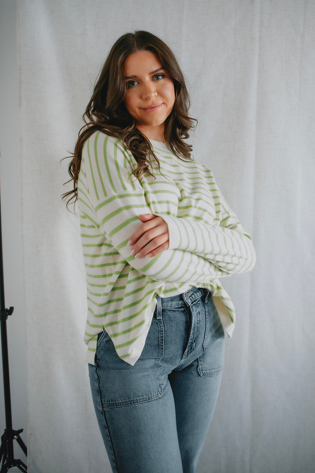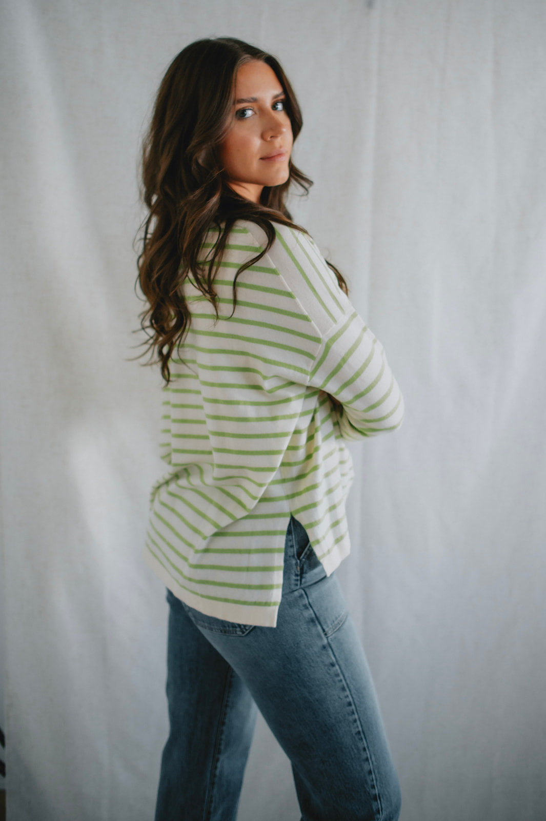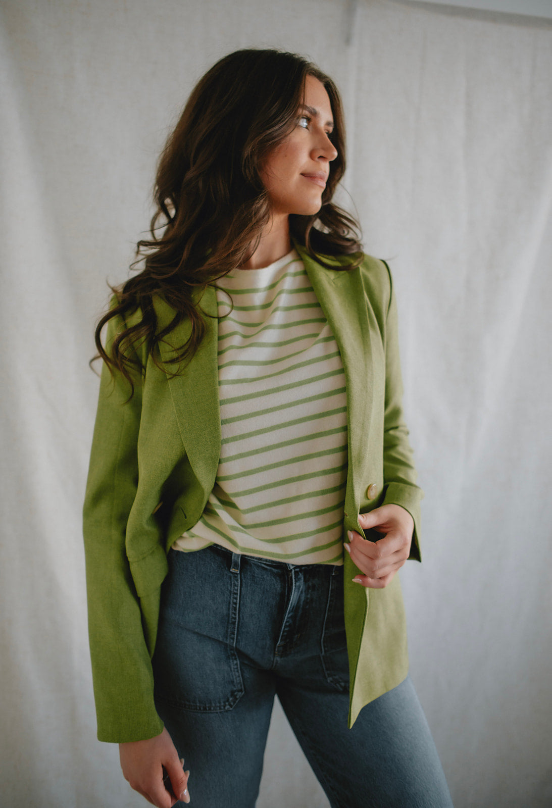 The Eileen sweater is the perfect sweater for spring and summer. The dropped shoulder and boxy body gives an updated shape to a classic item and the green stripes stay on trend for the season. The fabric is so light and so soft but still offers coverage.