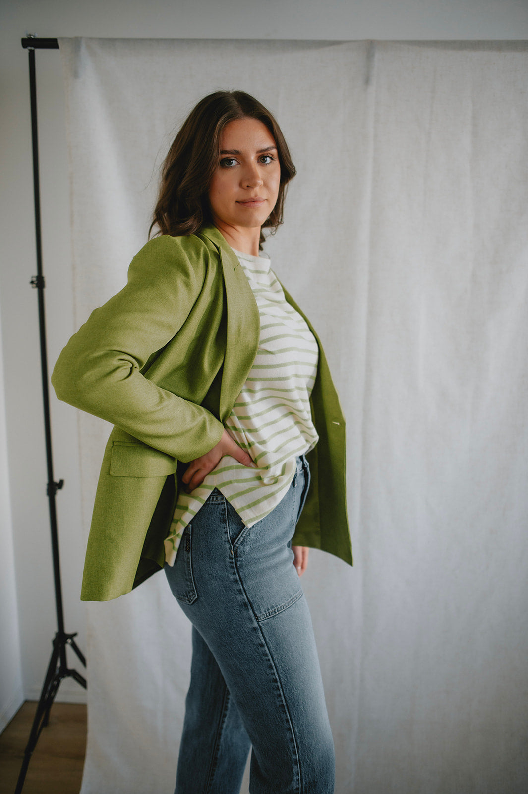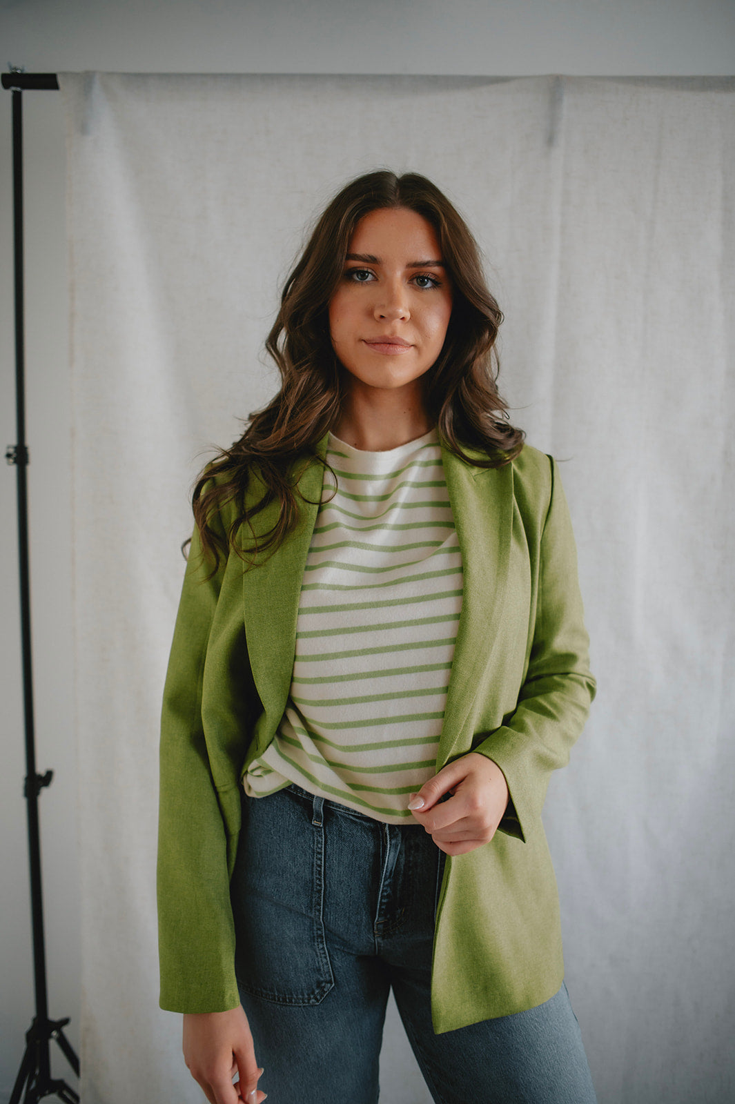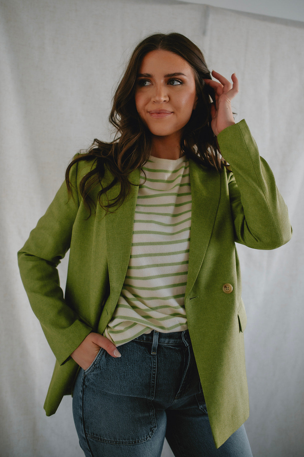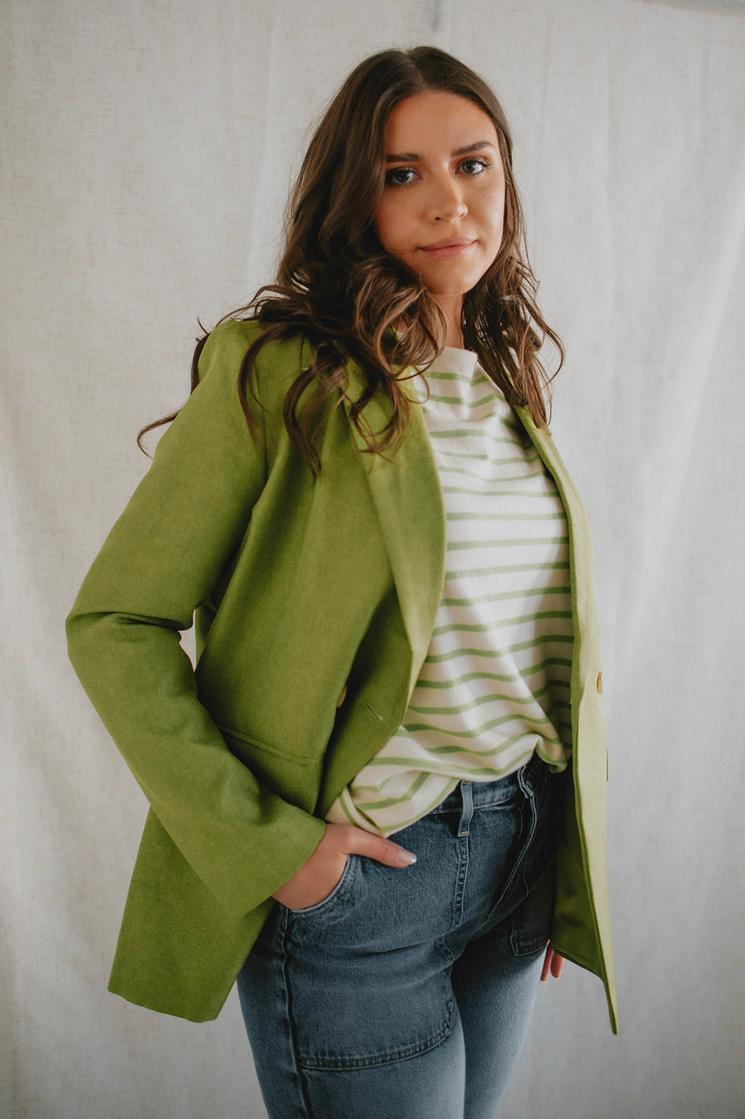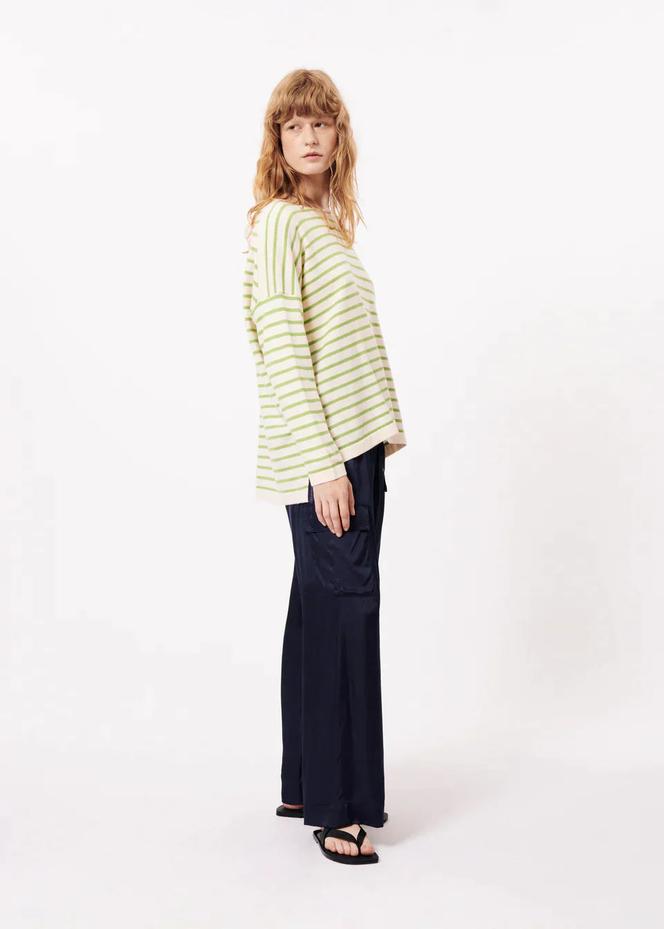 The Eileen sweater is the perfect sweater for spring and summer. The dropped shoulder and boxy body gives an updated shape to a classic item and the green stripes stay on trend for the season. The fabric is so light and so soft but still offers coverage.