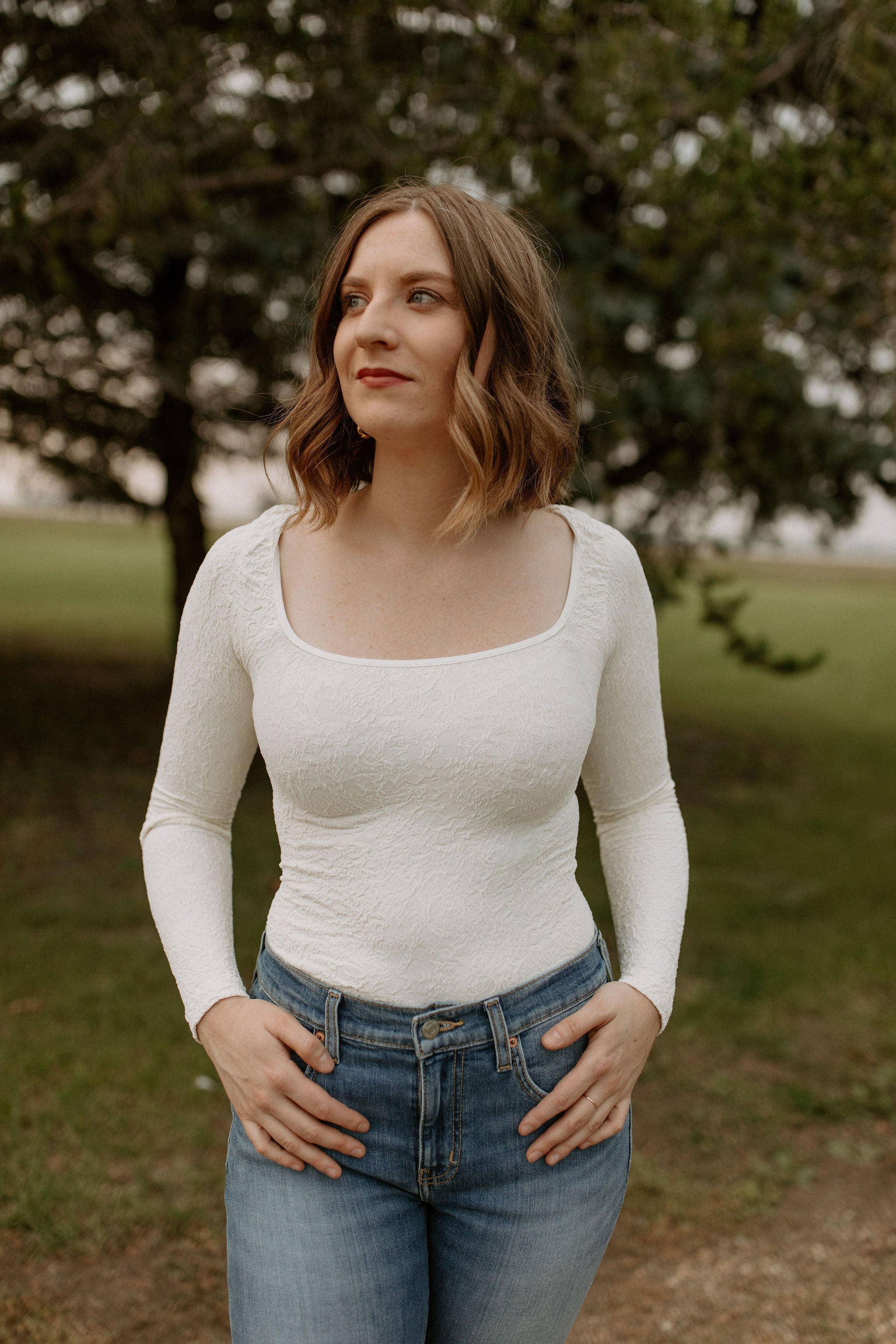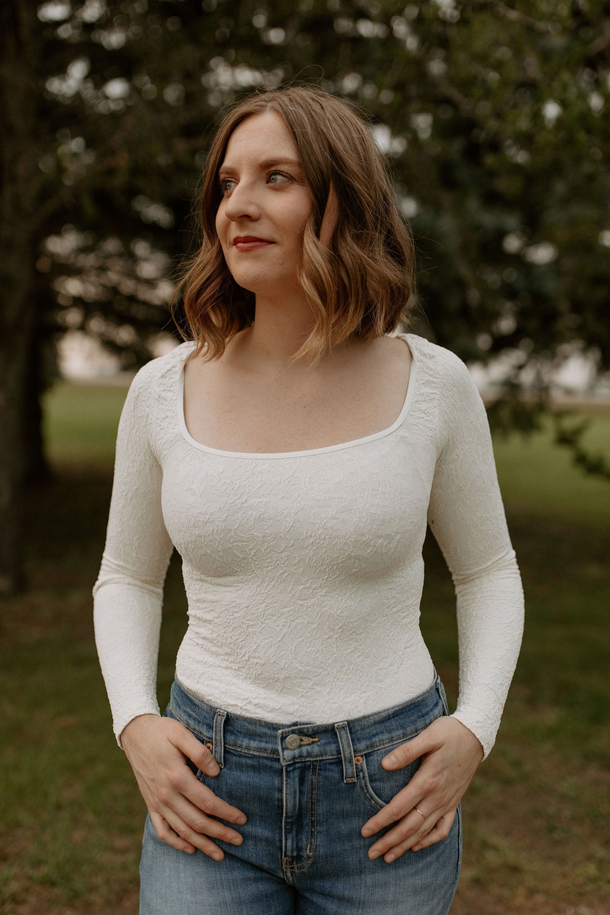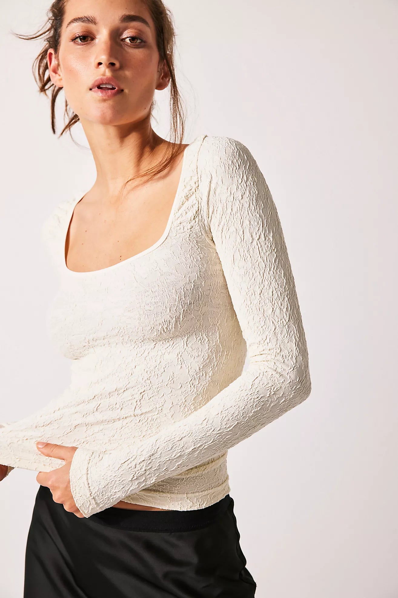 Features: Soft and stretchy, textured fabrication, scoop neckline, fitted long-sleeves