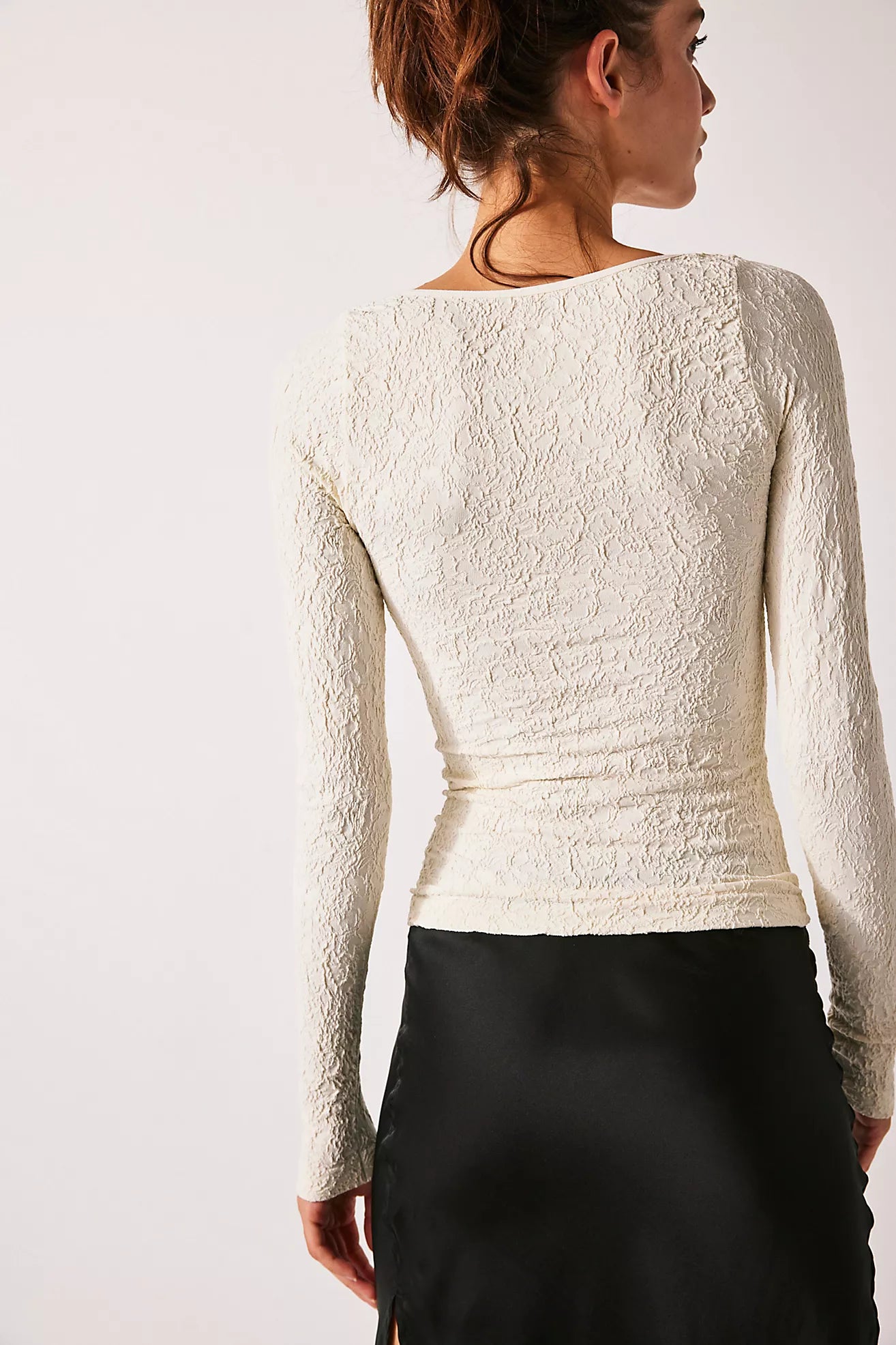 So sleek long-sleeve featured in a textured fabrication and slim-fitting silhouette with a chic scoop neckline.