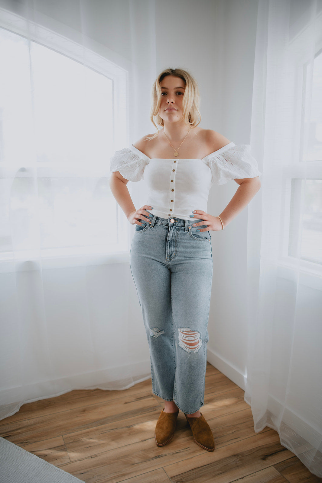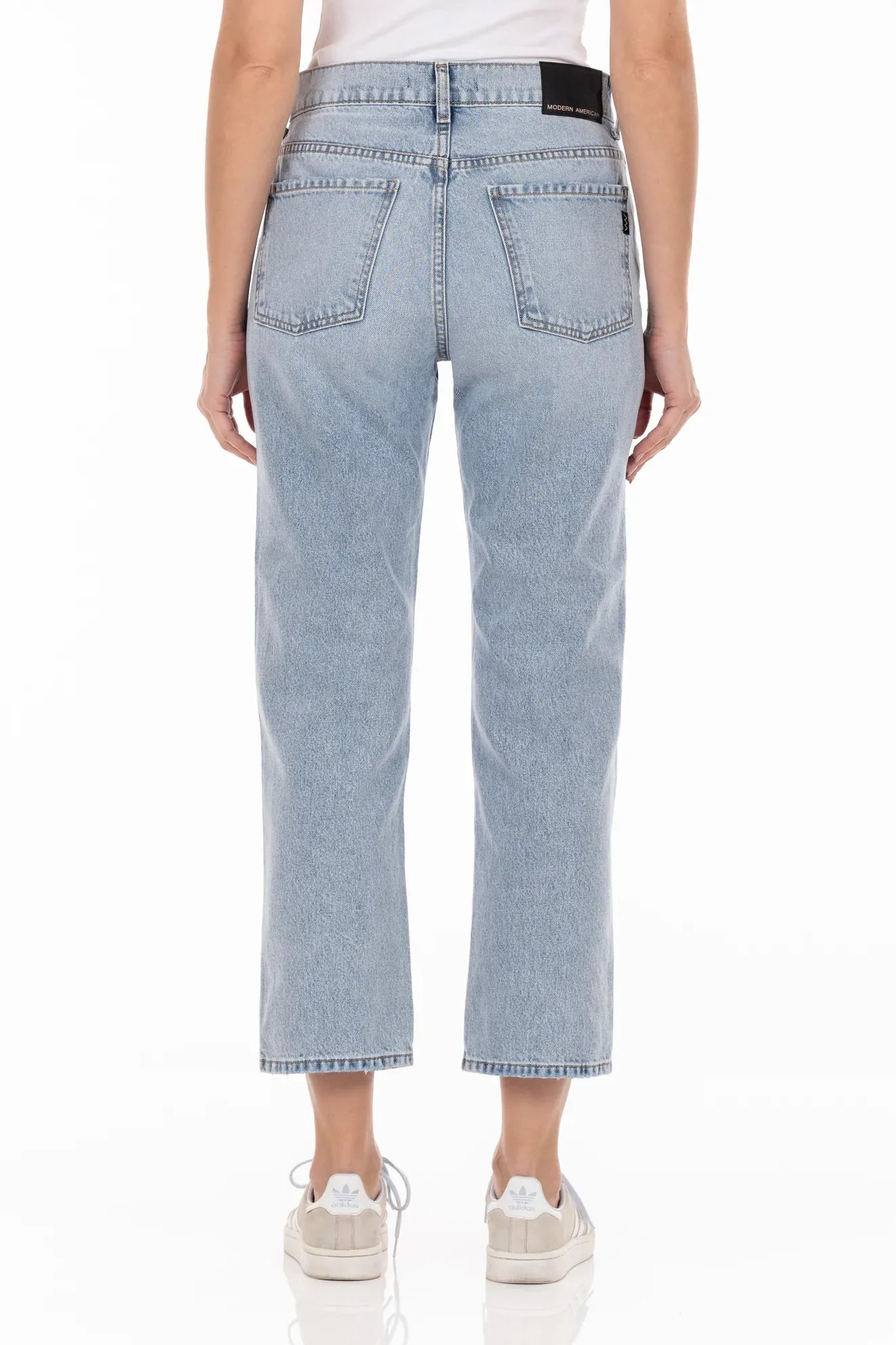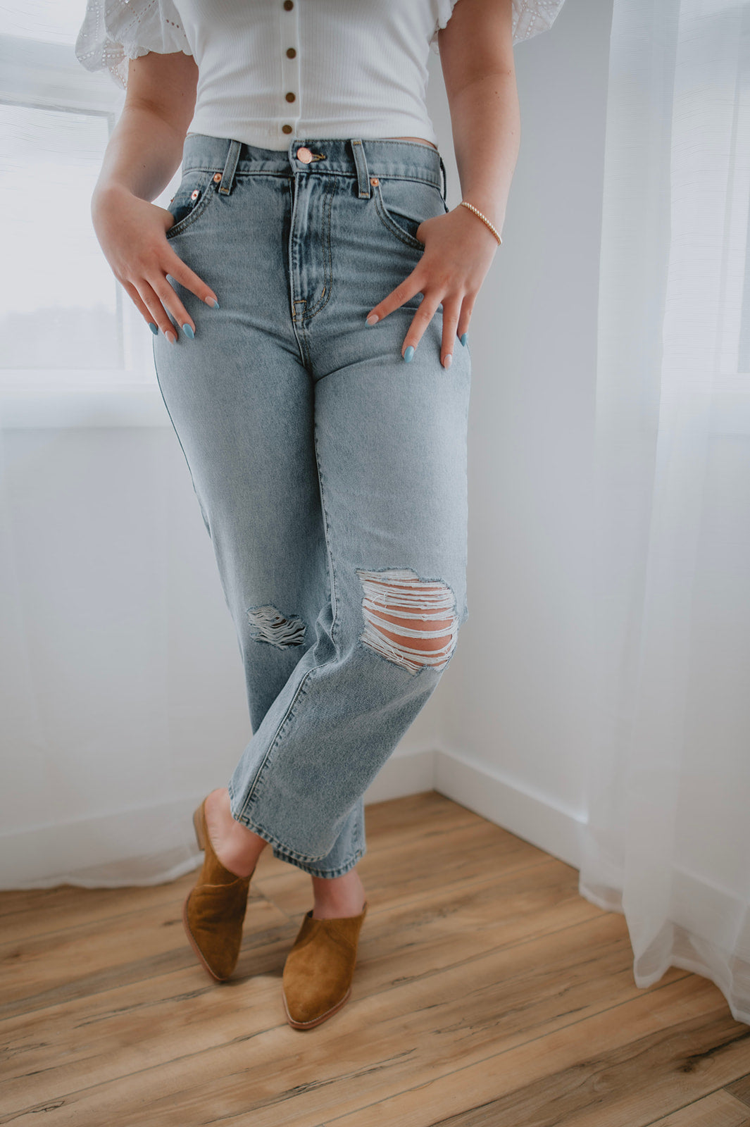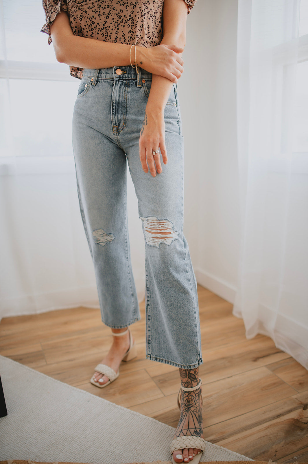 The high-rise straight, AKA your old boyfriend fit. This wash is a rad washed down light blue and has a rose gold buttons fly. Made from our Crazy Horse fabric so not a ton of stretch so take that into consideration as you select size.