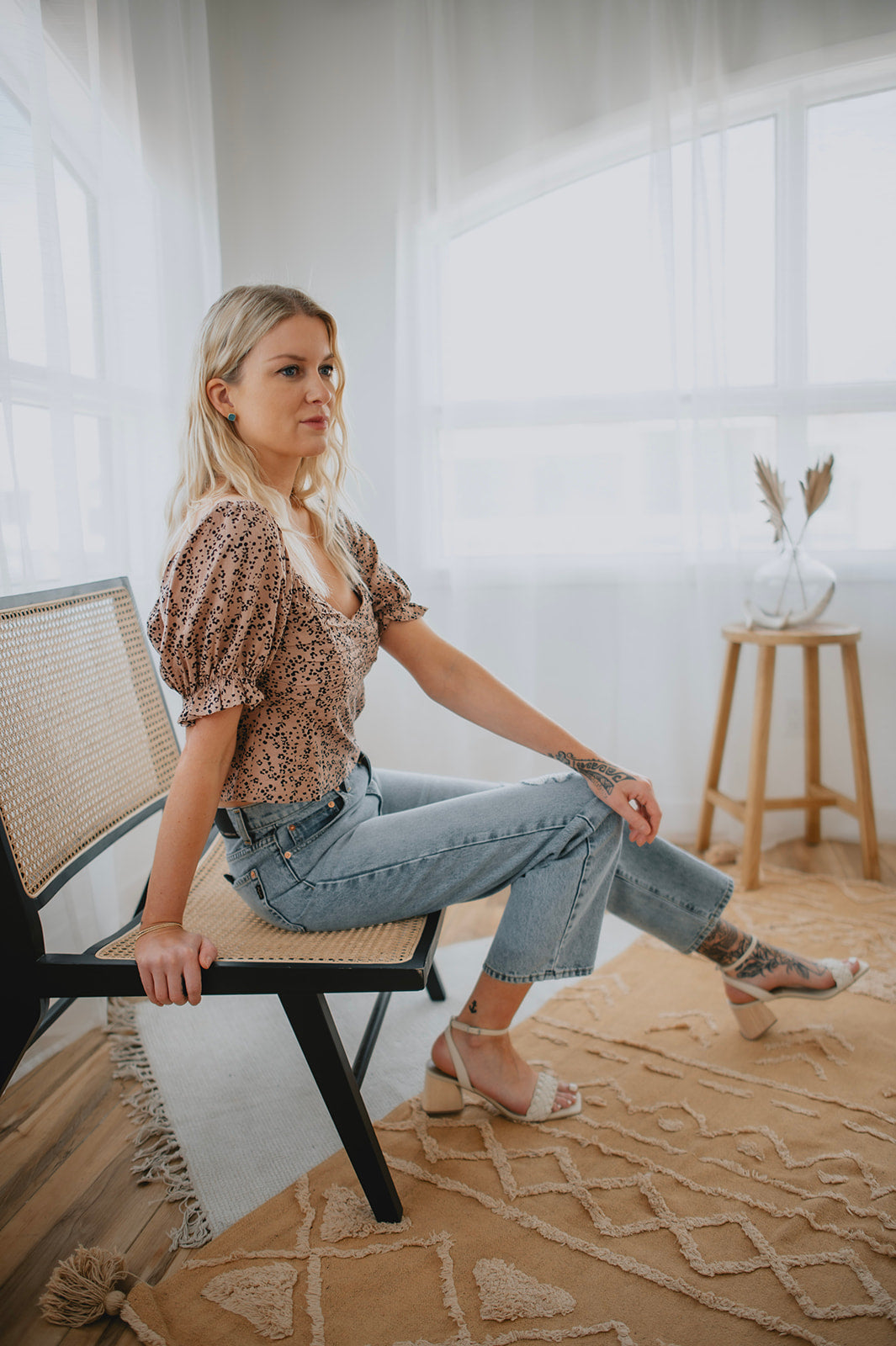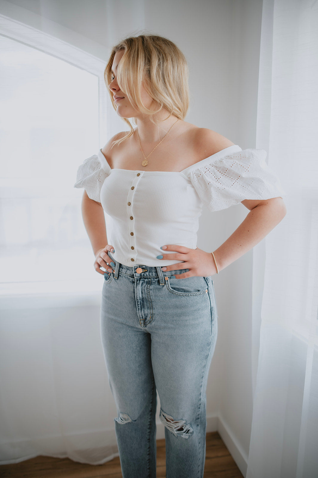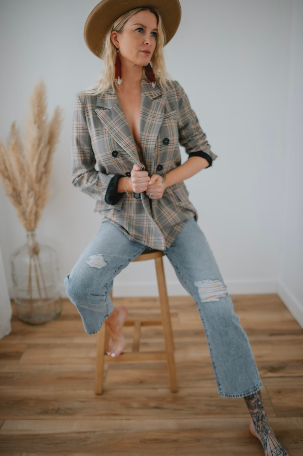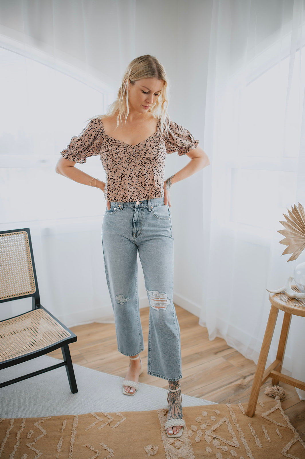 The high-rise straight, AKA your old boyfriend fit. This wash is a rad washed down light blue and has a rose gold buttons fly. Made from our Crazy Horse fabric so not a ton of stretch so take that into consideration as you select size.