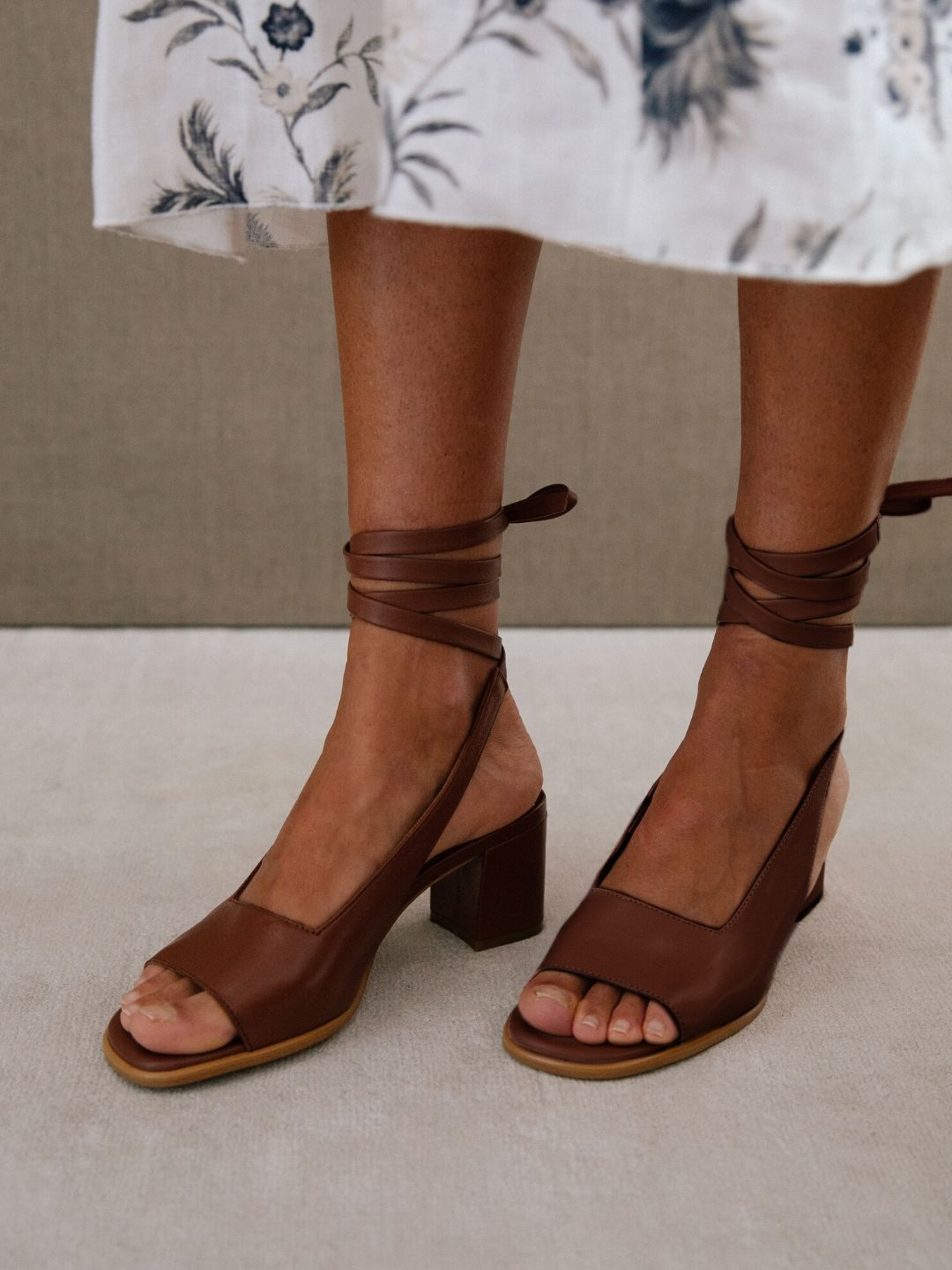 The best block heel sandals are brown. The Lille Brown are all chic and no pain. These leather block heels feature an open toe and a square leather instep shape that evokes a square ballerina flat. Their open back is supported by a sleek and minimalistic strap from the instep to slightly above ankle height.