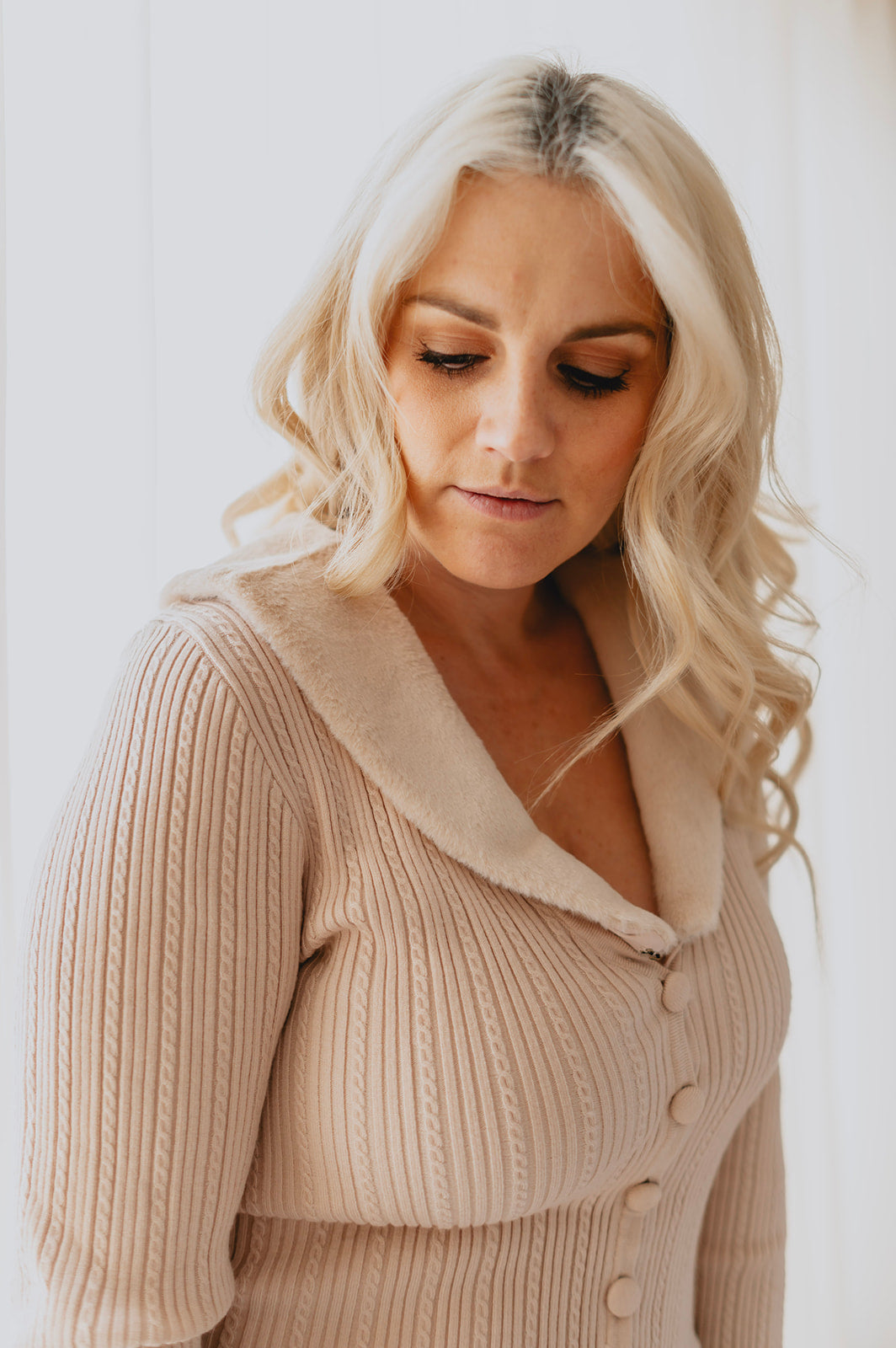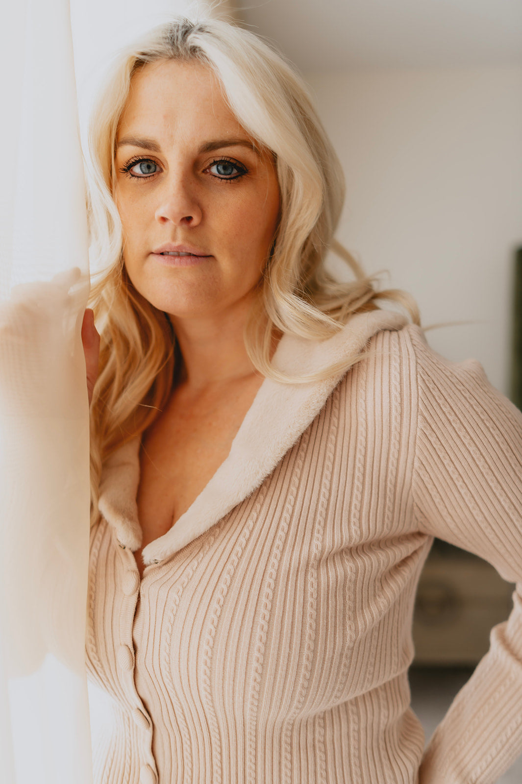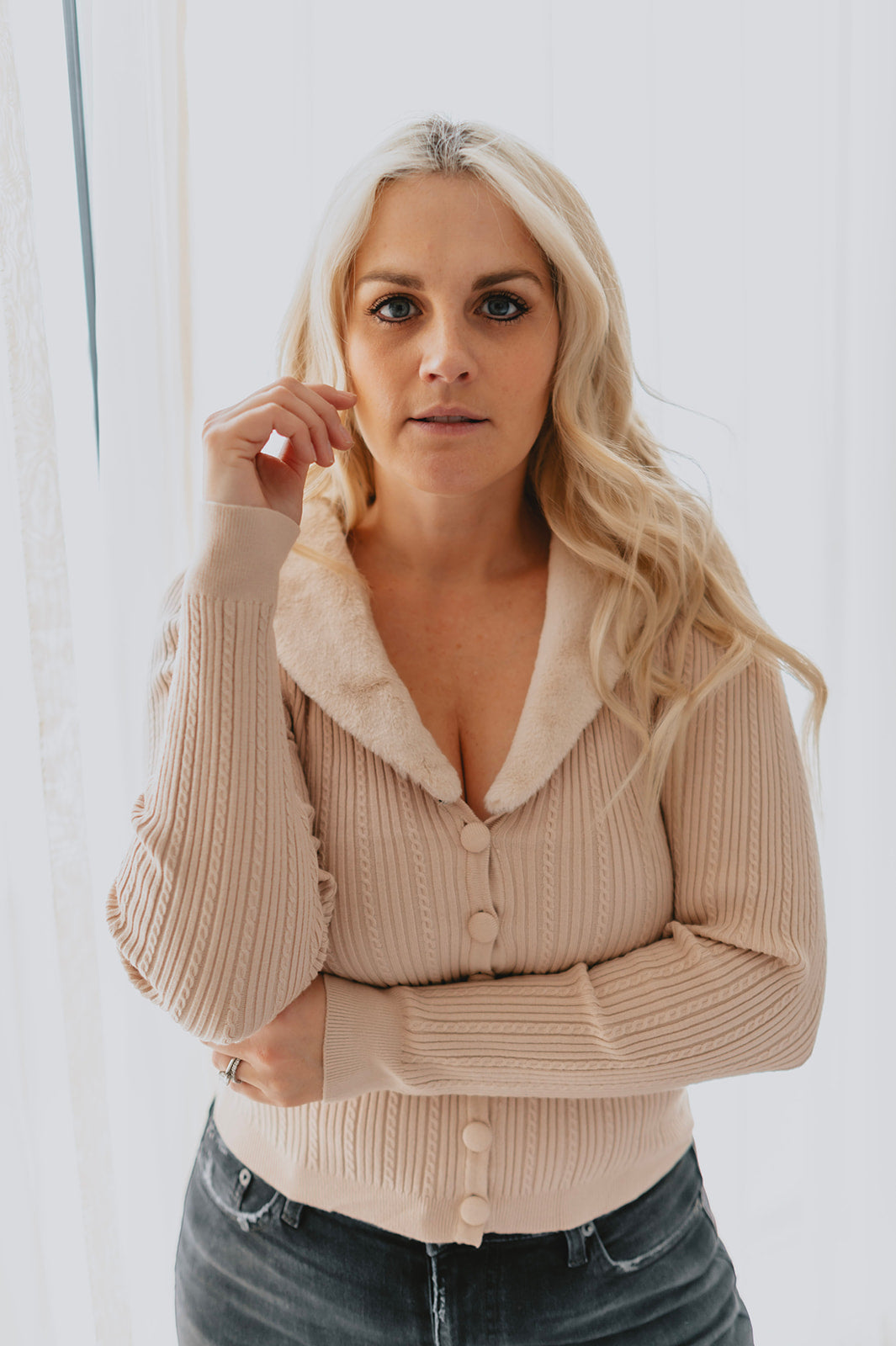 The Lisbon Sweater Cardi is a must have for your closet. Knitted in a delicate cable pattern with faux fur trim at the neck, you can pair with satin joggers or jeans for a polished look.