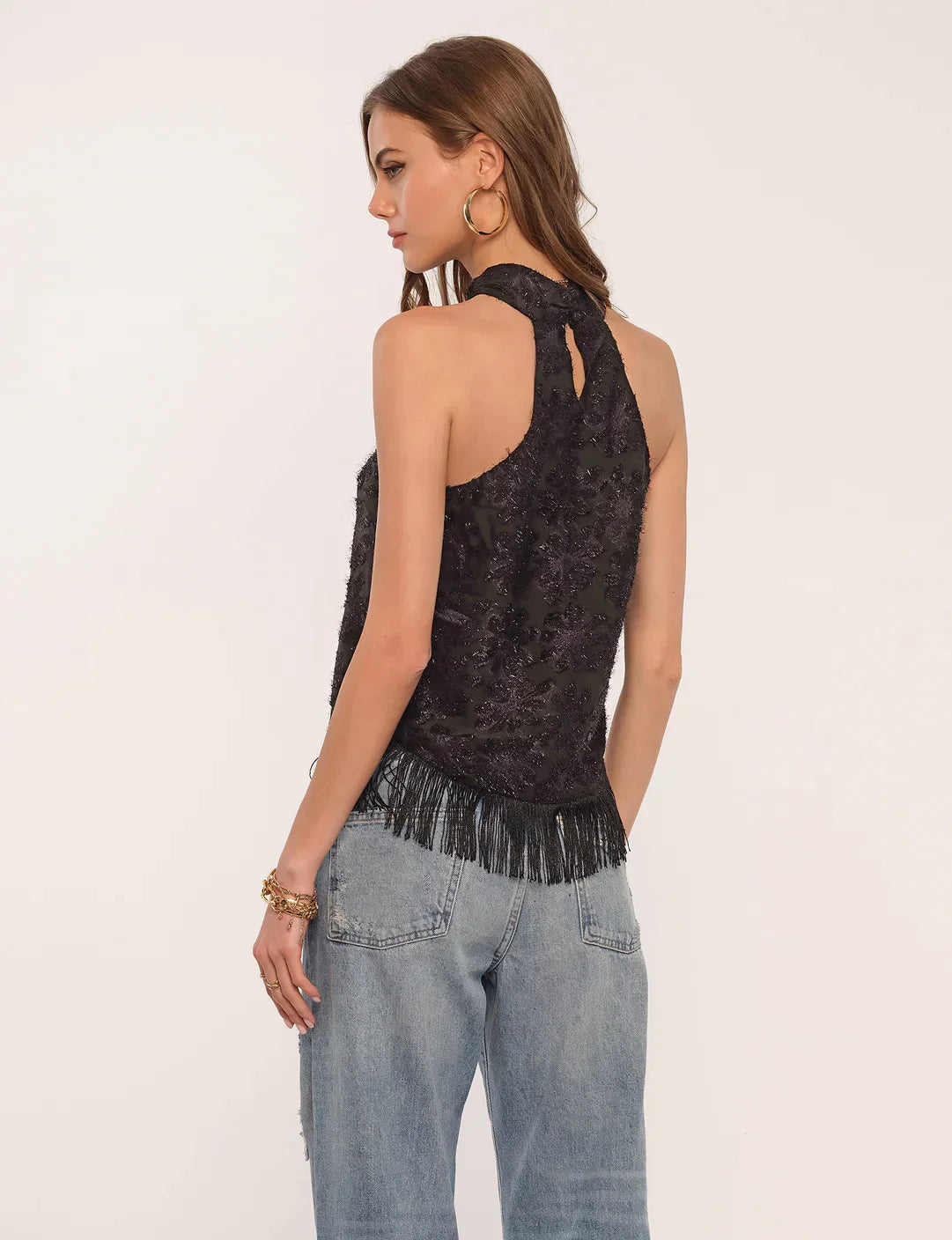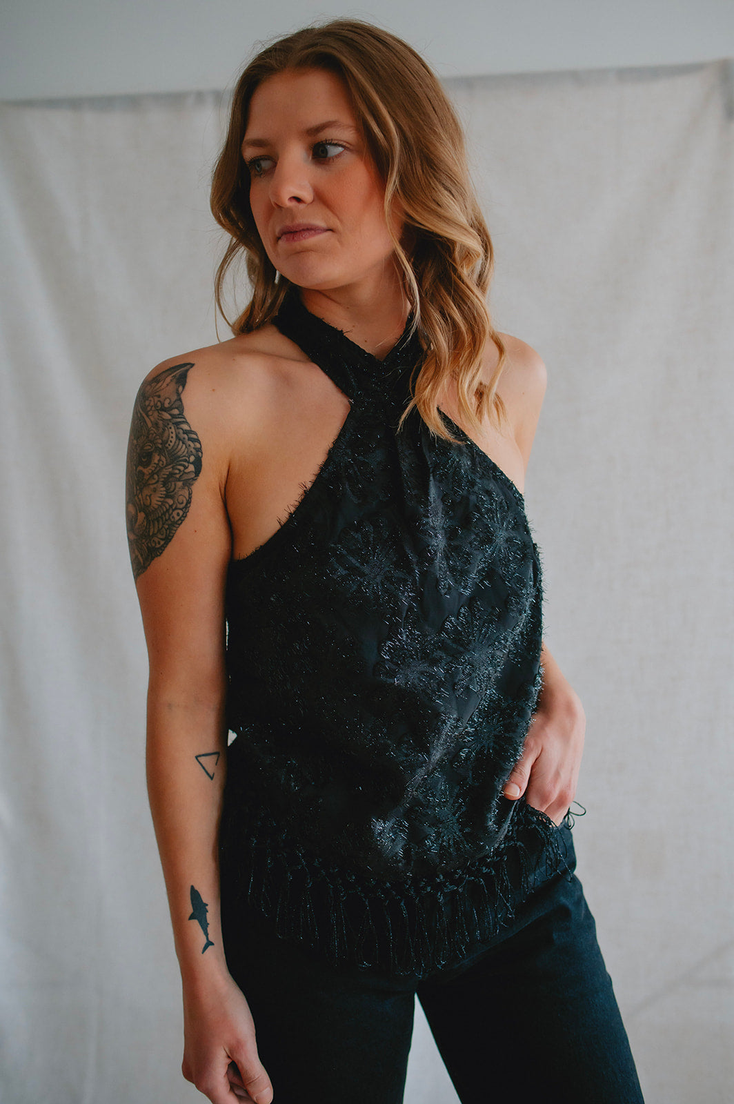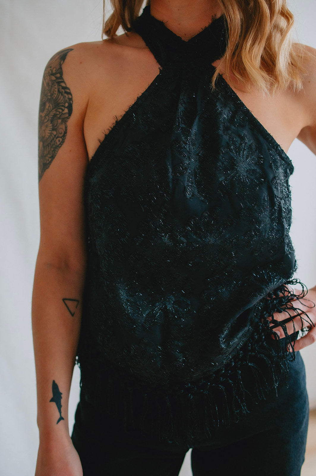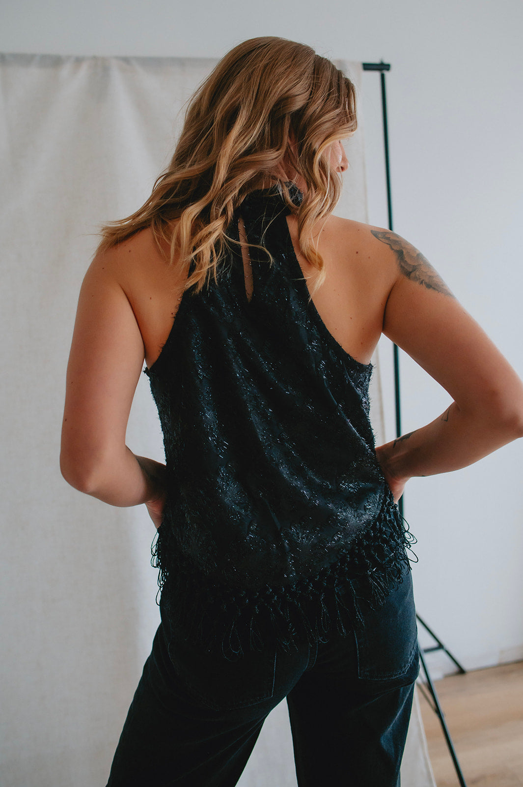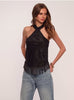 The Merritt Top is a sparkling stunner that will draw in attention and compliments. This halter neck top features shimmering details and a fringed hem.
