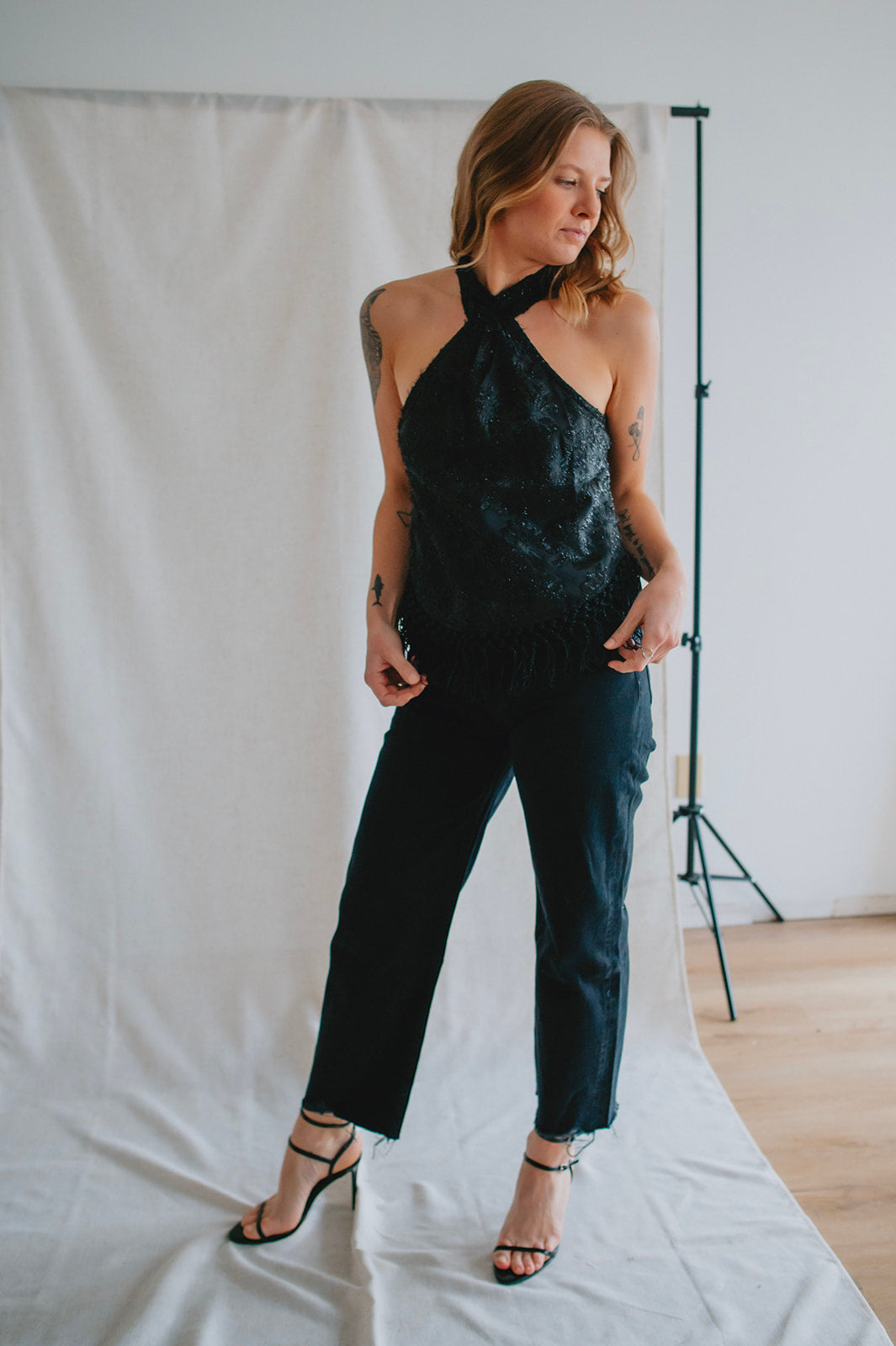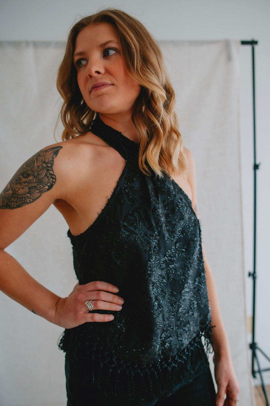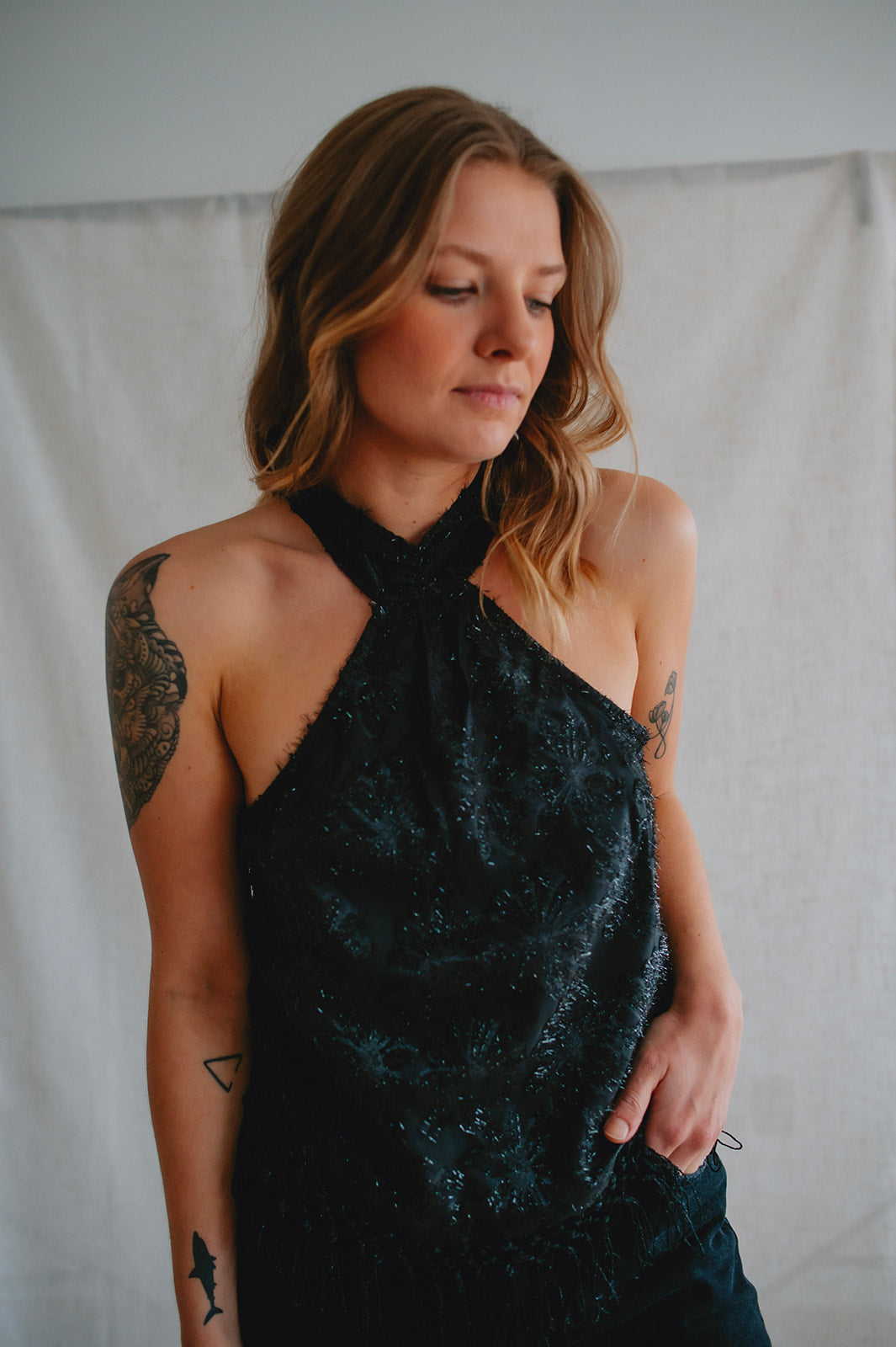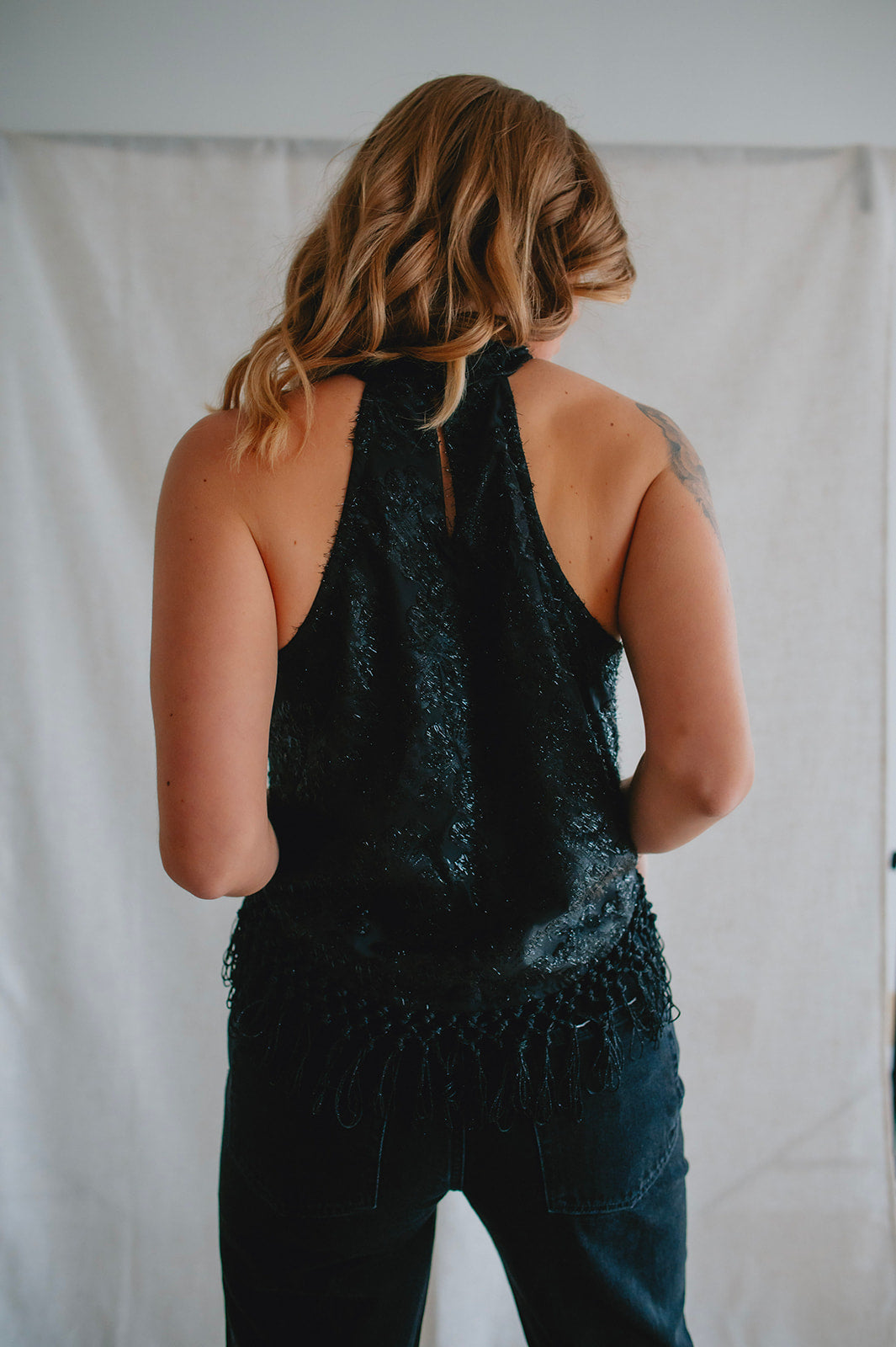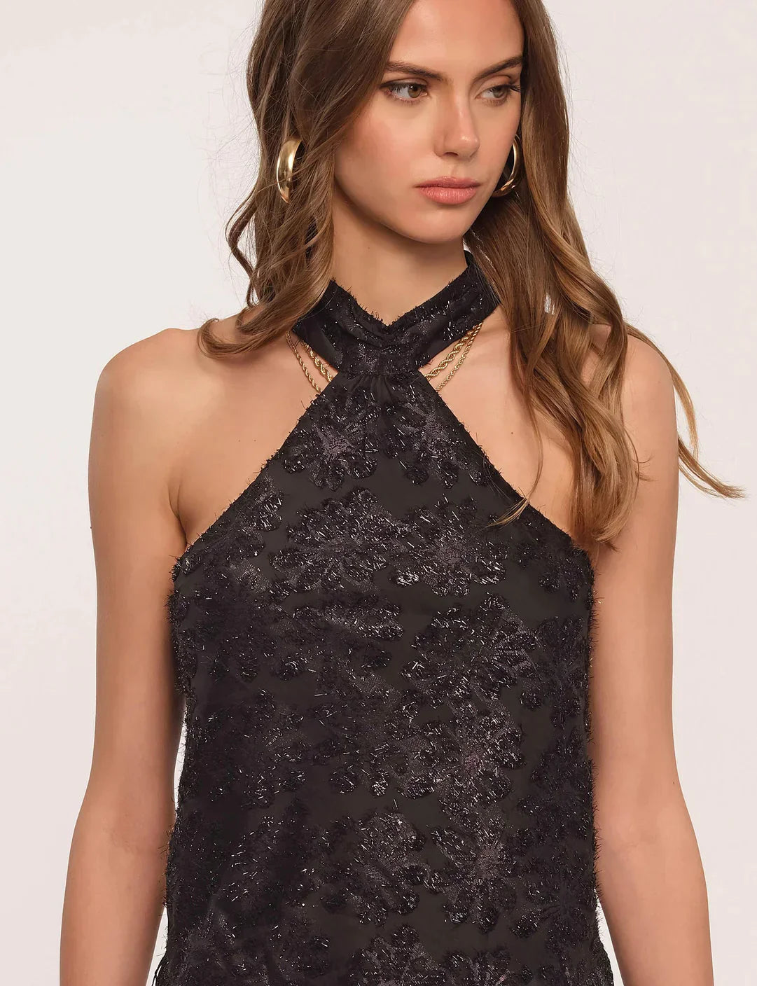 The Merritt Top is a sparkling stunner that will draw in attention and compliments. This halter neck top features shimmering details and a fringed hem.