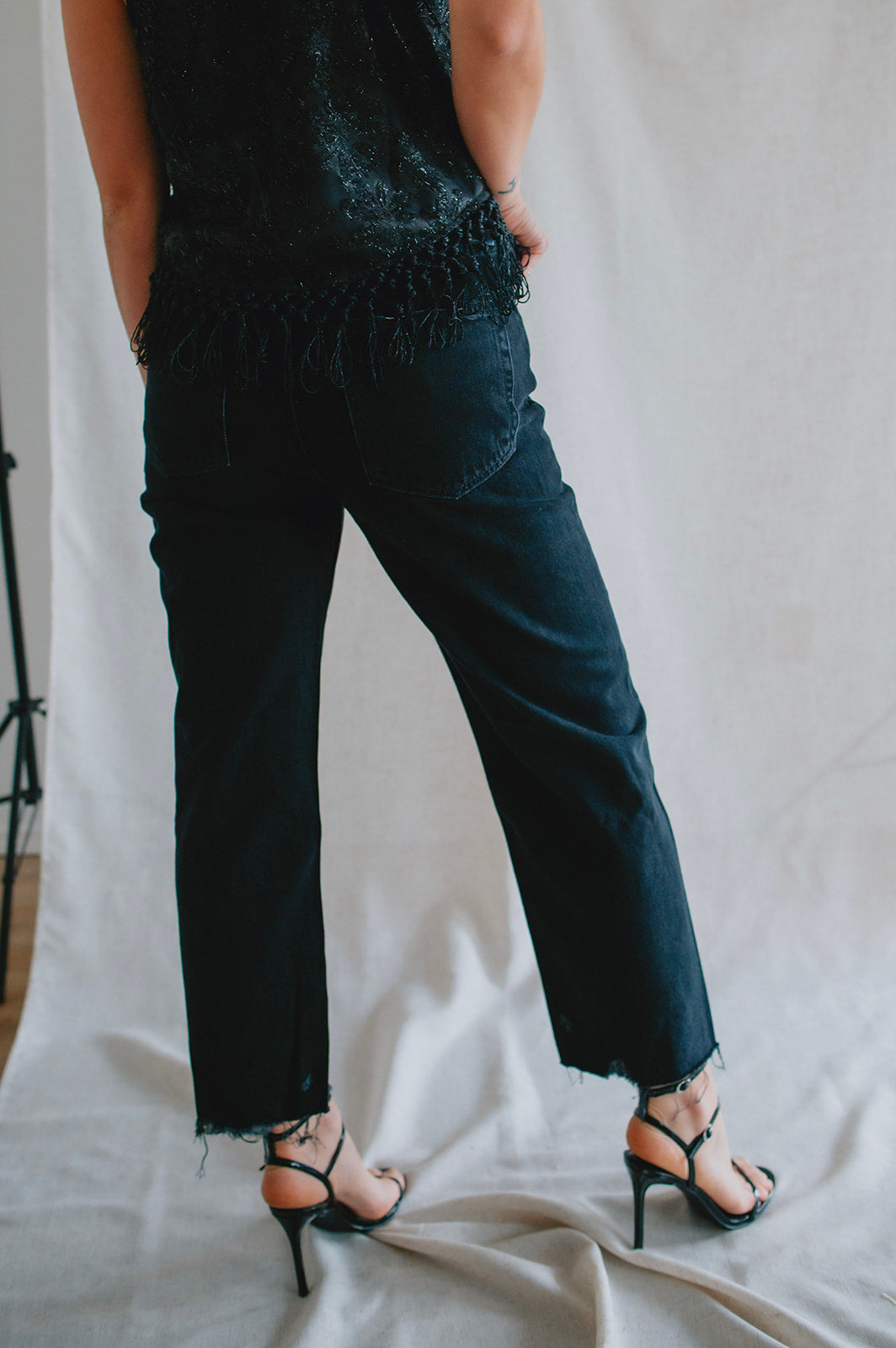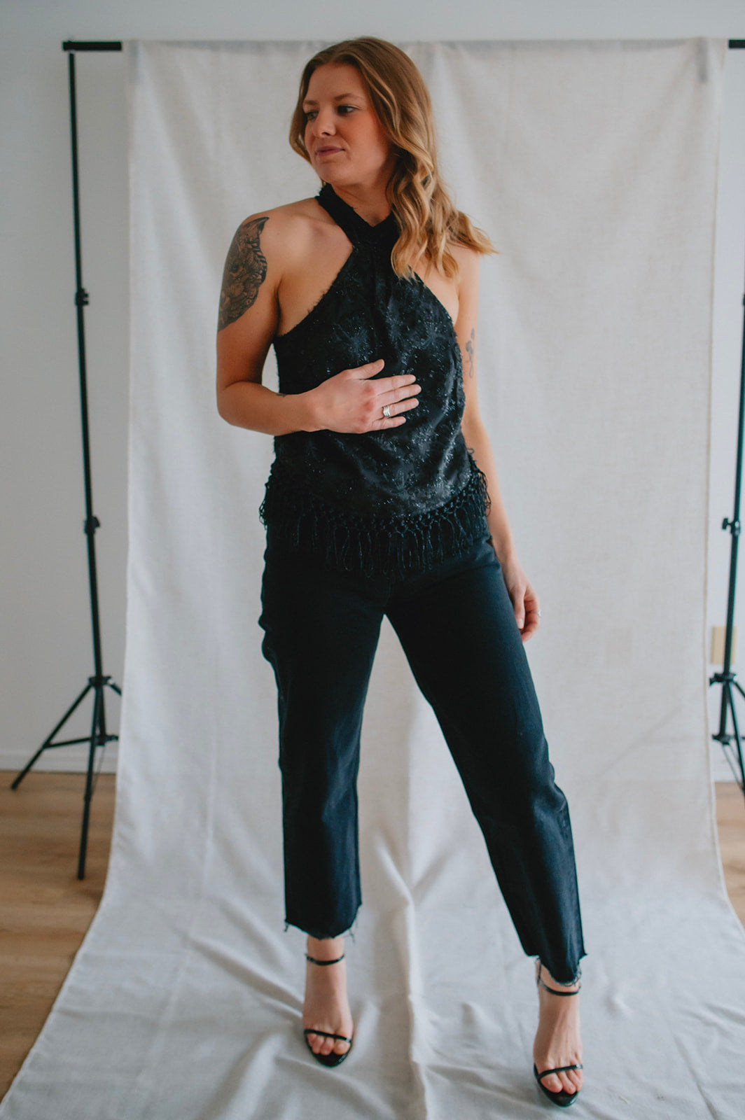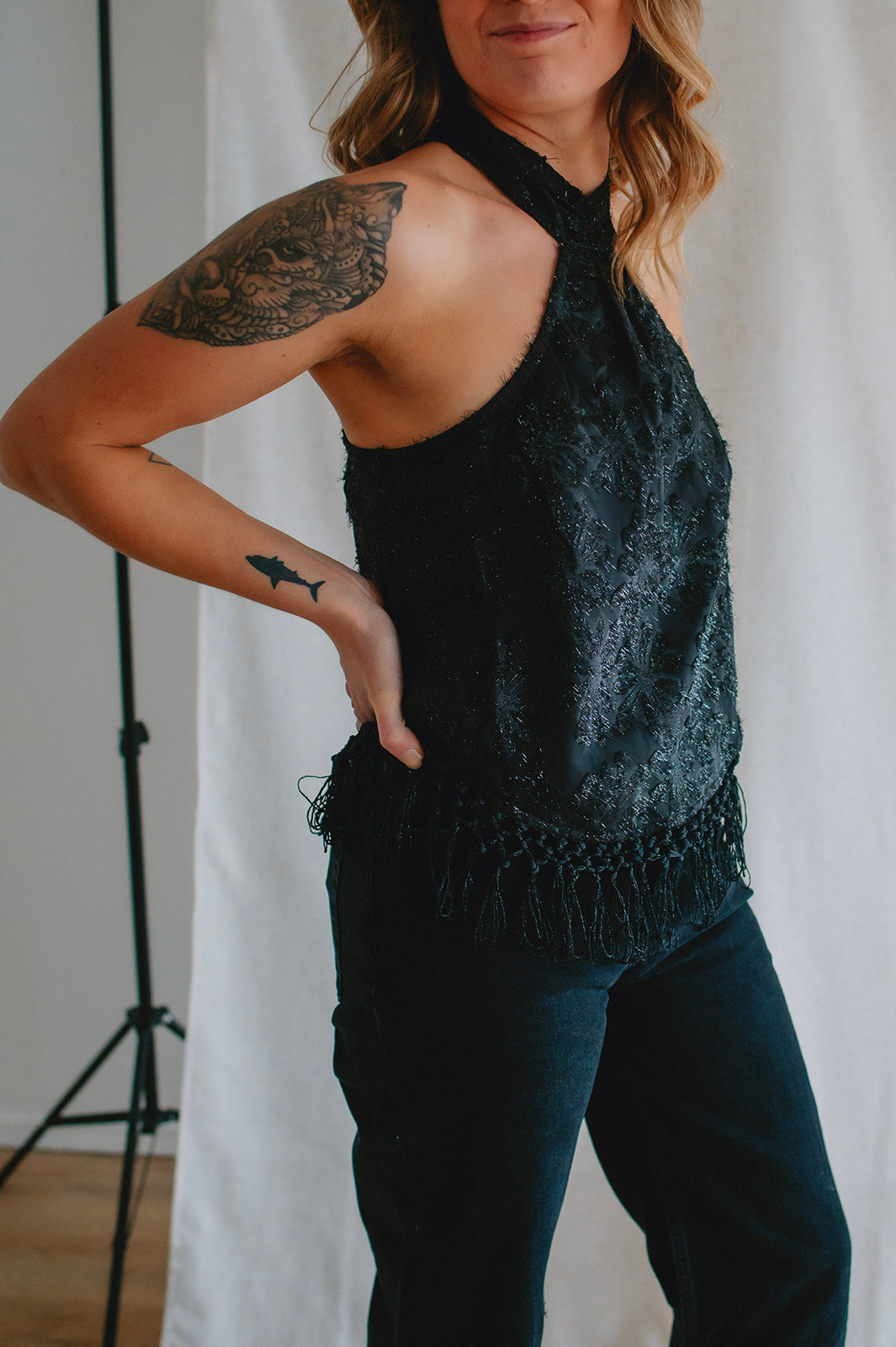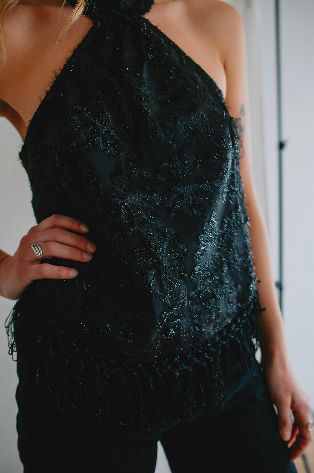The Merritt Top is a sparkling stunner that will draw in attention and compliments. This halter neck top features shimmering details and a fringed hem.