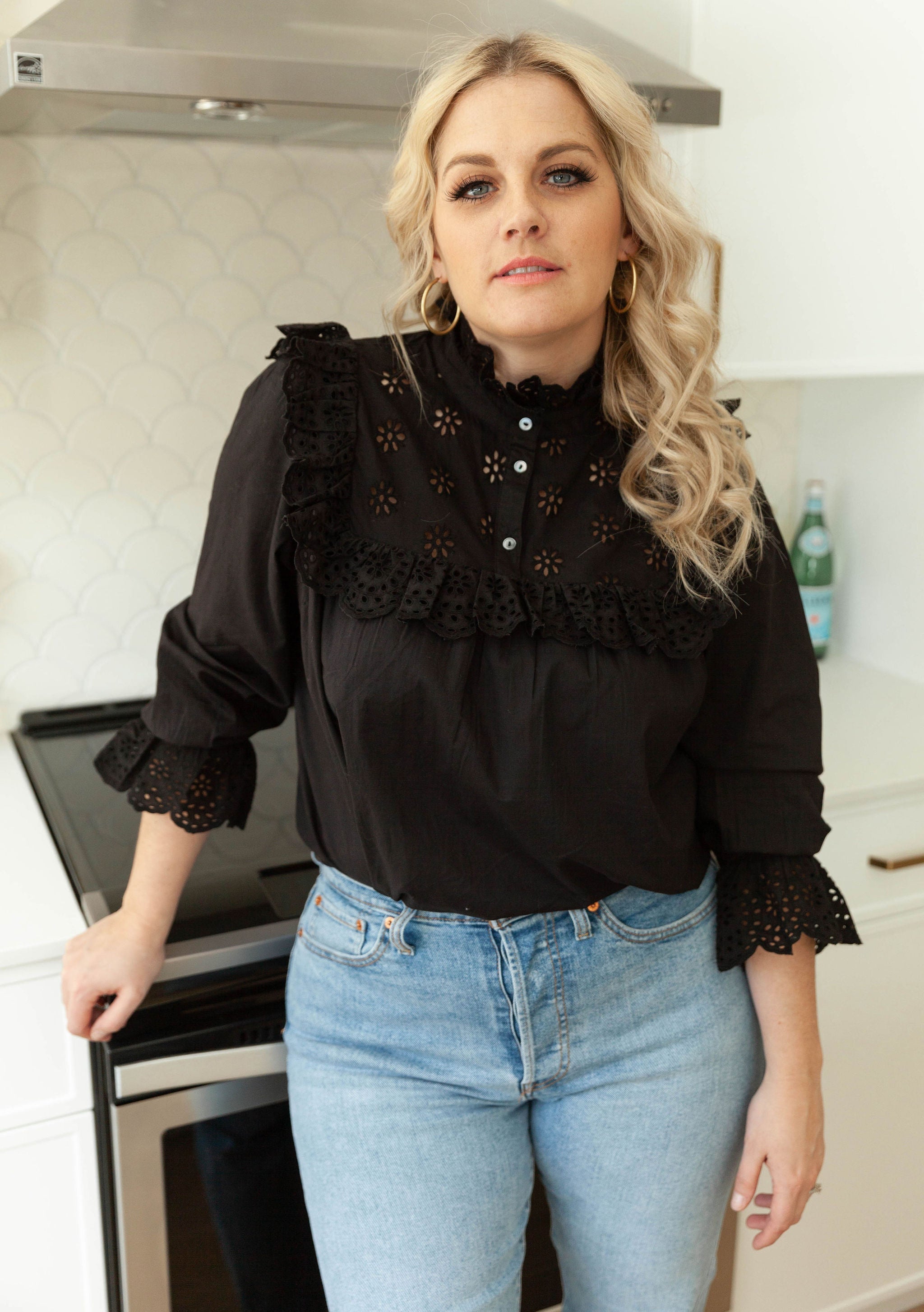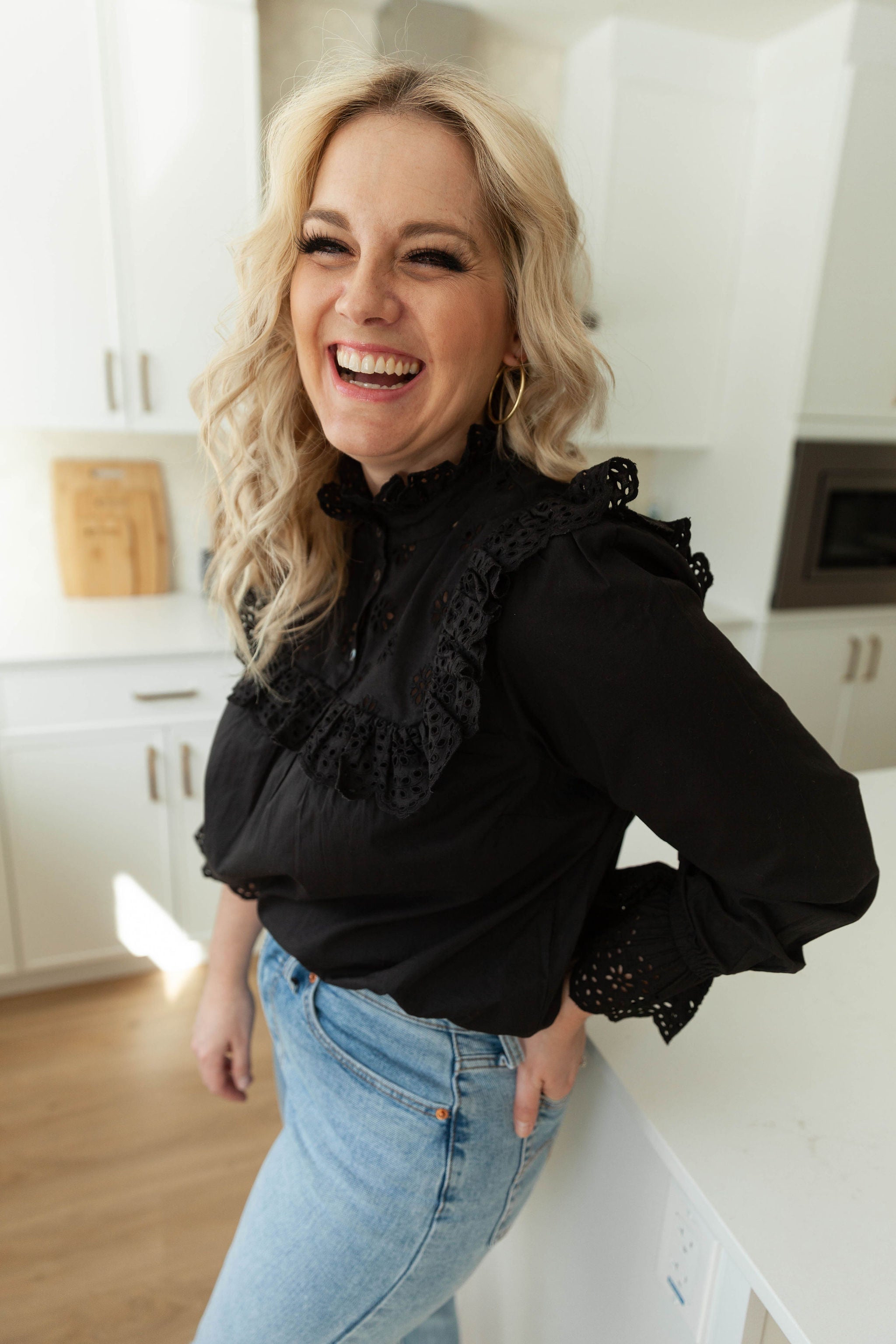 This beautiful long sleeve blouse is the perfect addition to any wardrobe. Dress is it up or down, with denim or tuck it into a skirt. Go from the office, to a date, to a brunch with the girls. The ruffle detailing on this one cannot be matched.