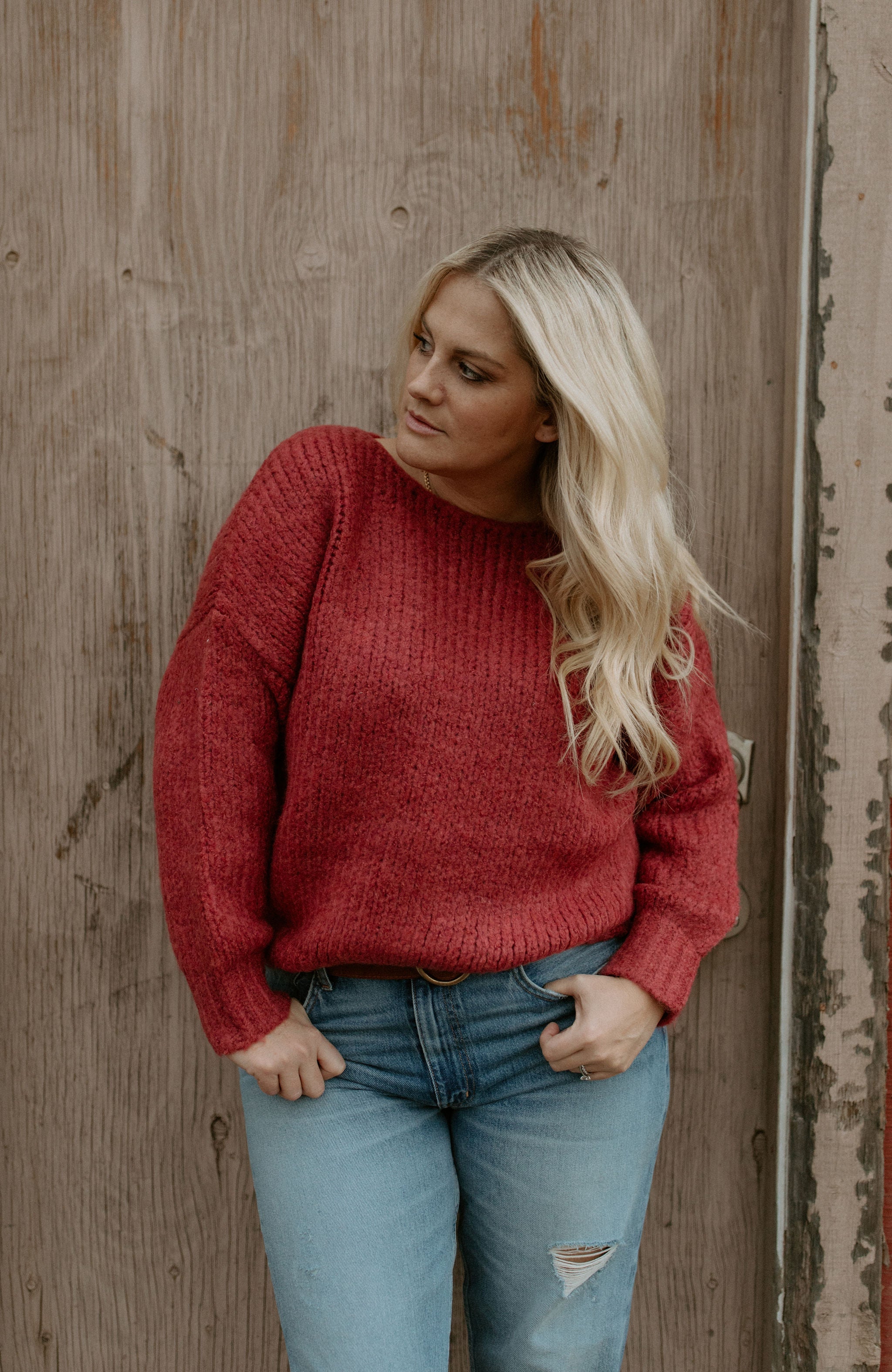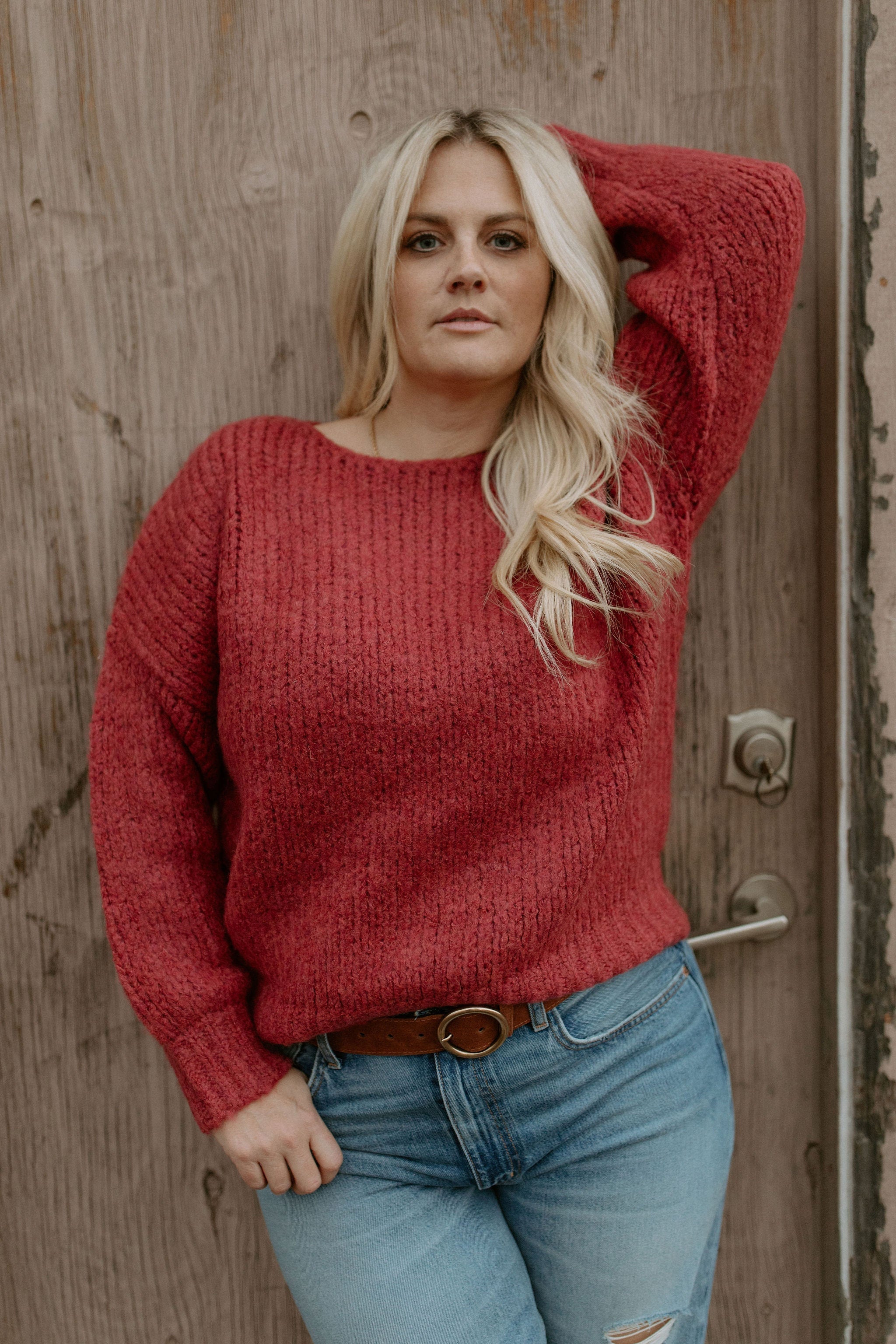 Feminine neckline for this simple knit sweater, slightly oversized for a modern look.