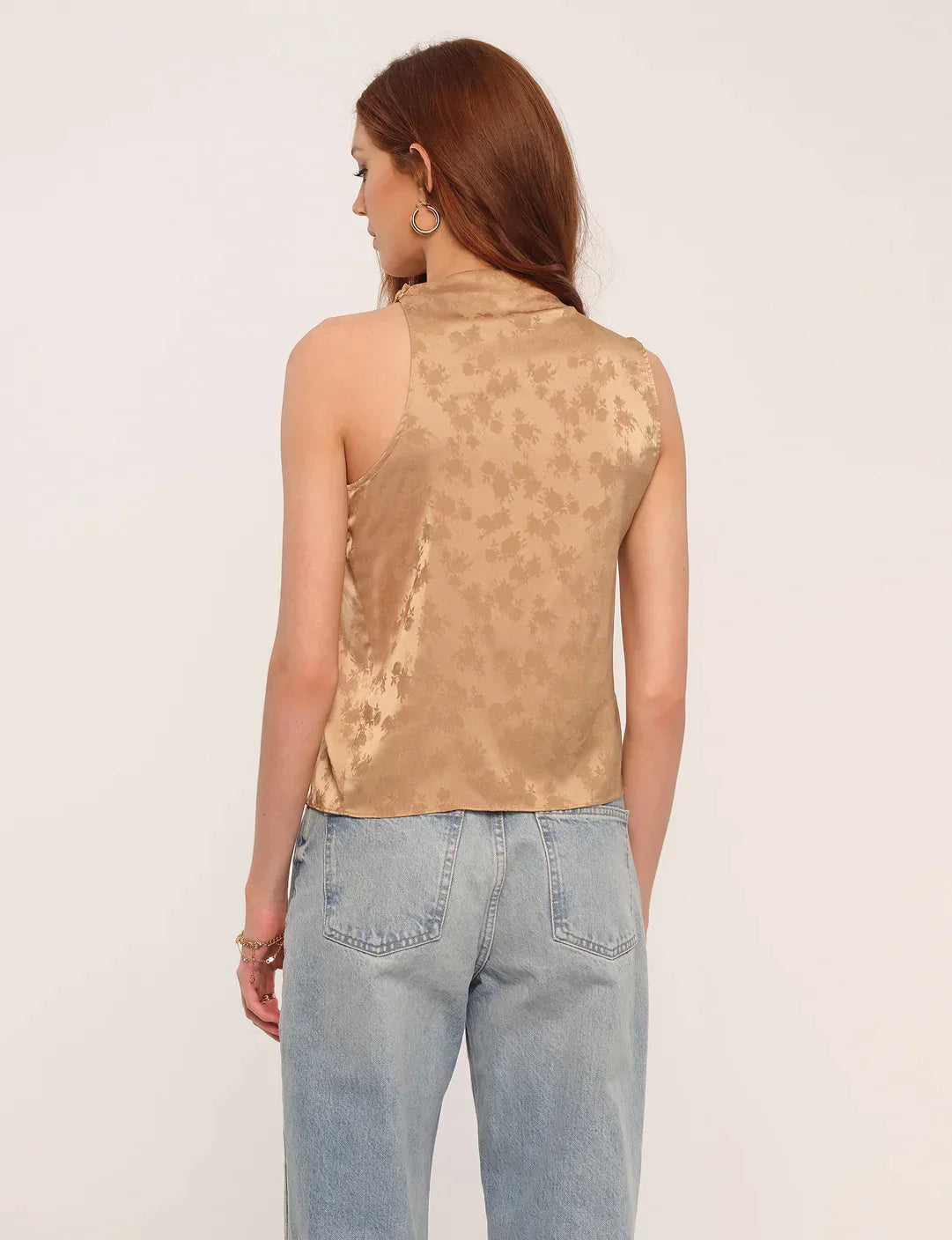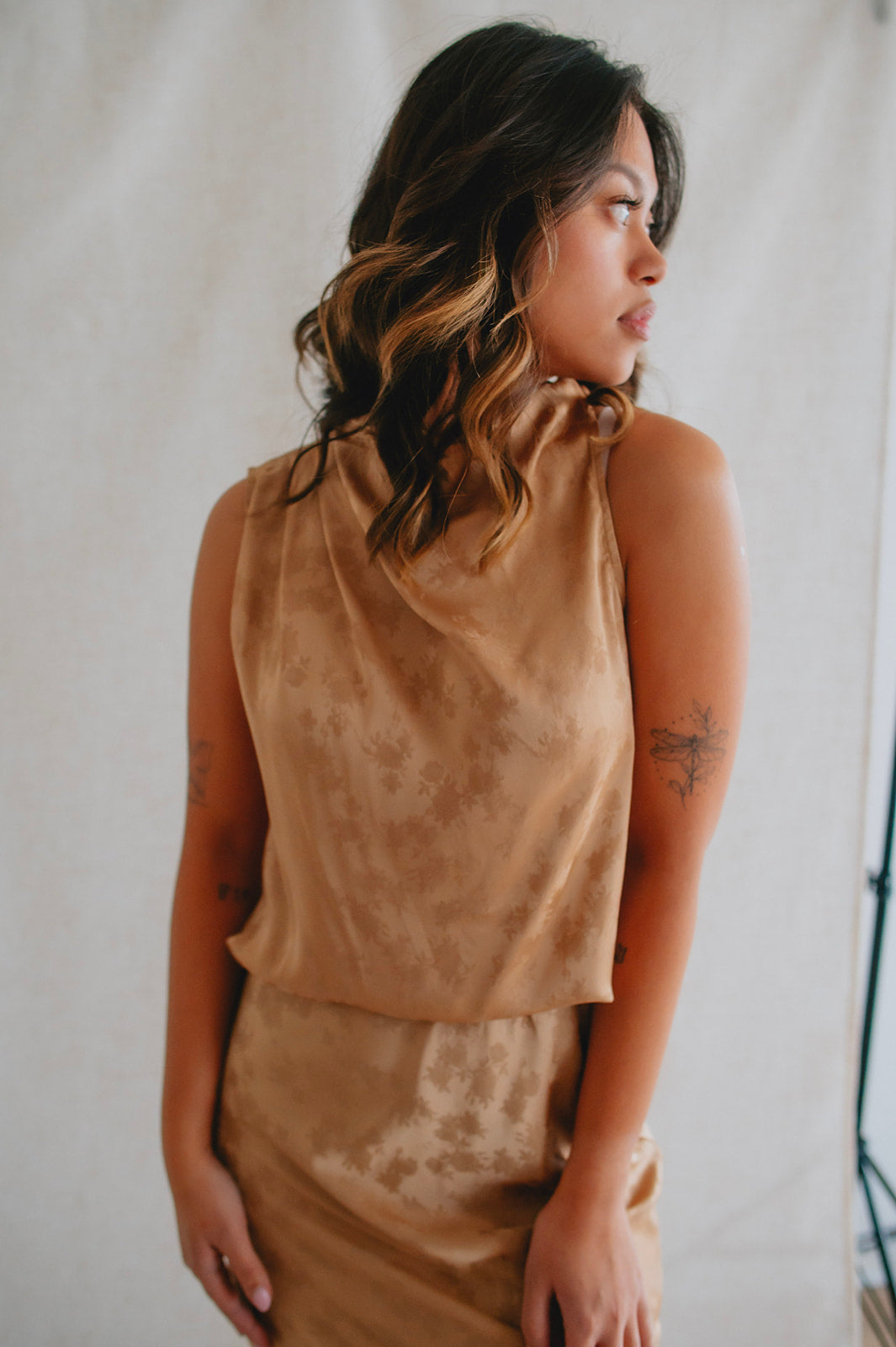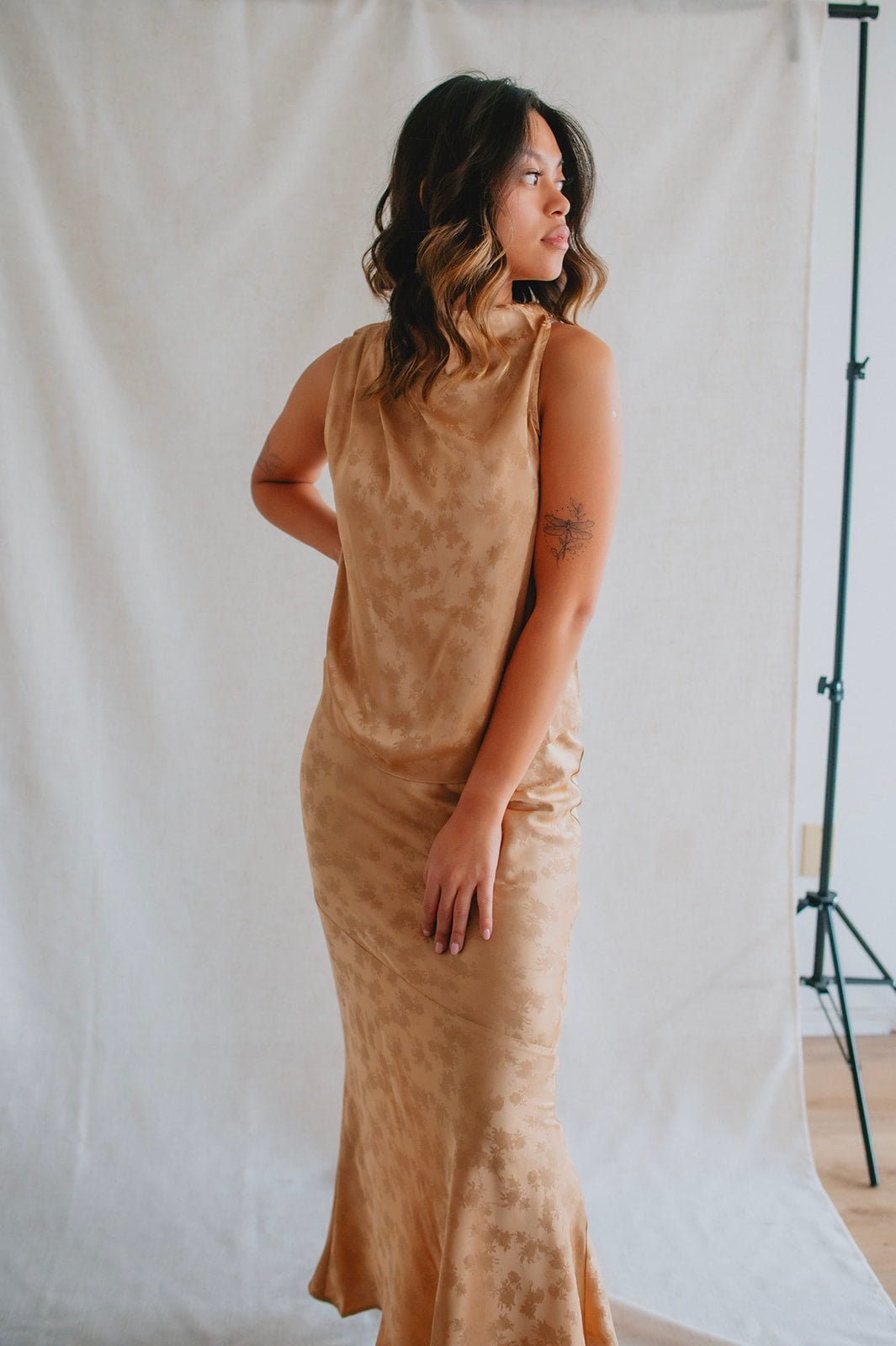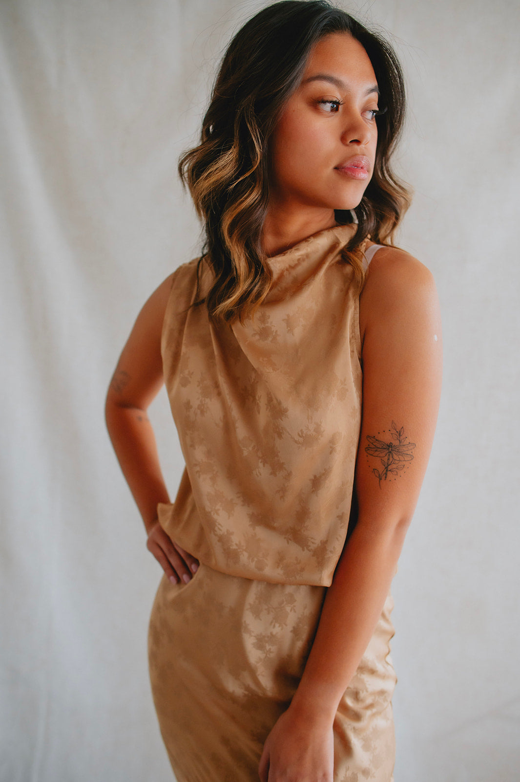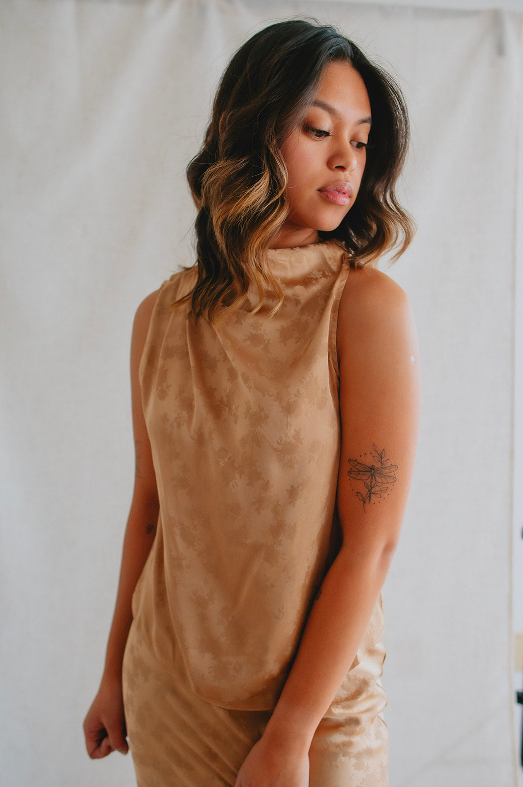 The Soleil Top is made of our soft jacquard satin and has an elegant cowl neckline. It has a button closure along the neckline for a soft draped bodice. Versatile and easy, wear solo or layer under a blazer for instant polish.