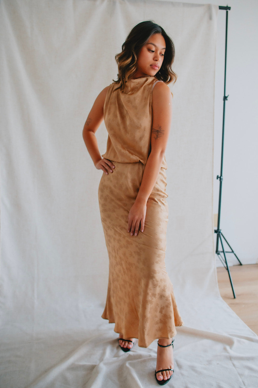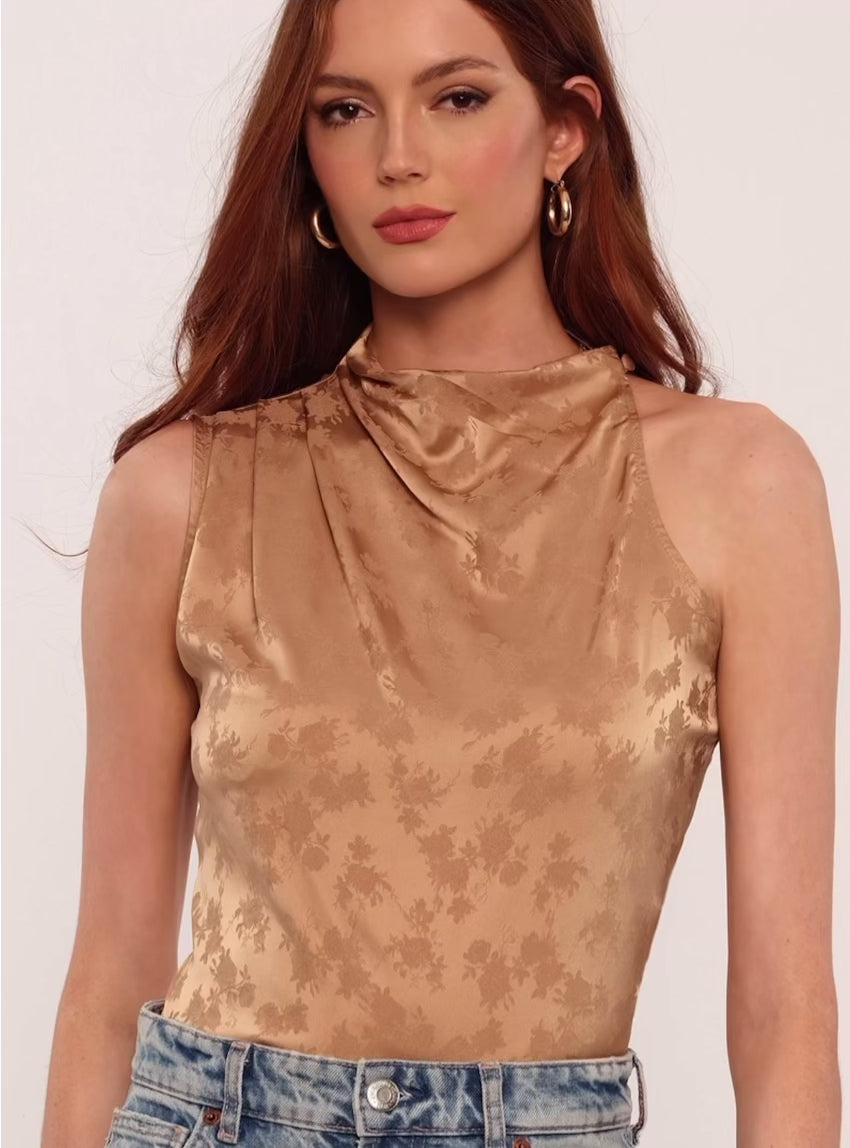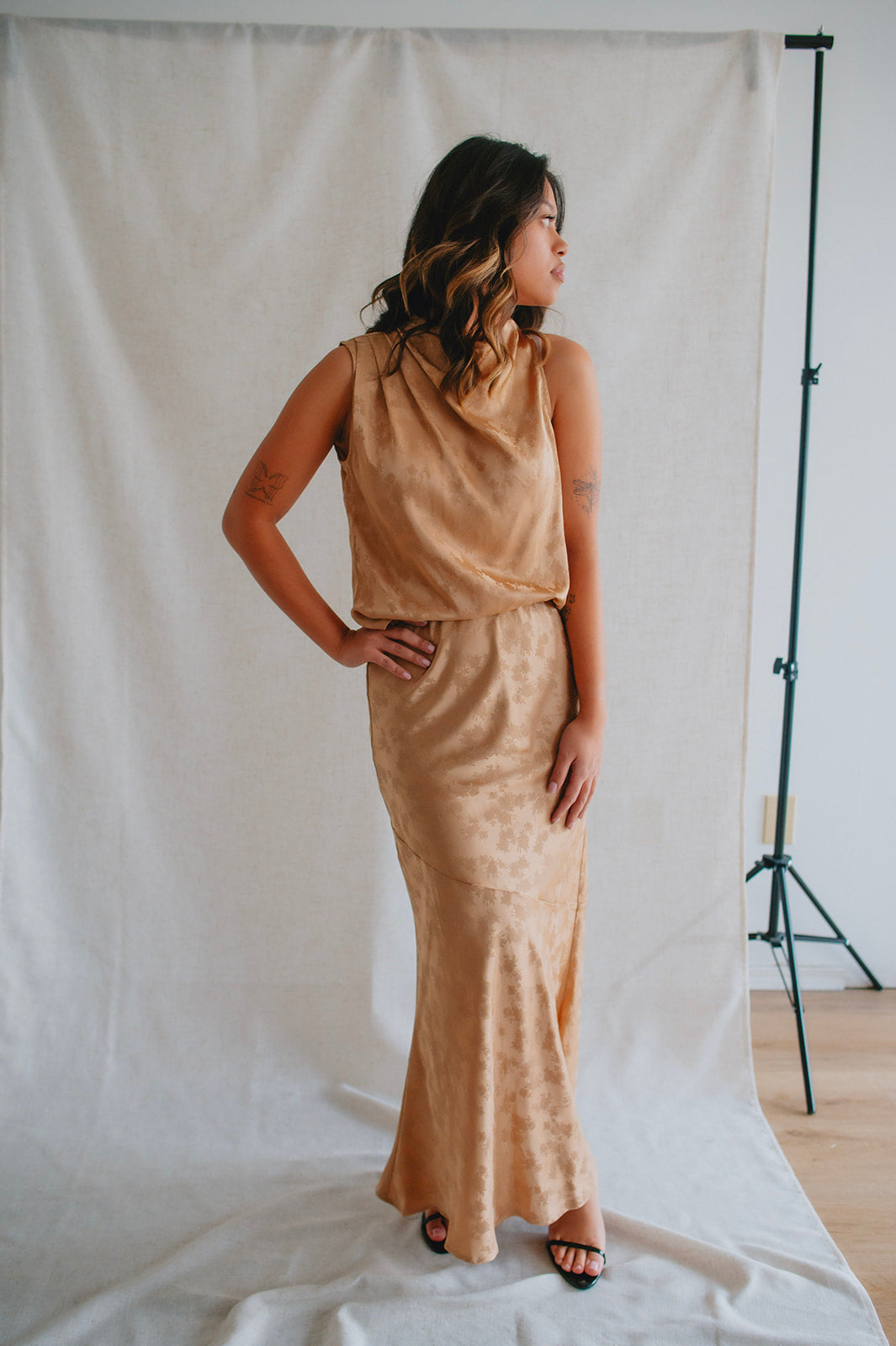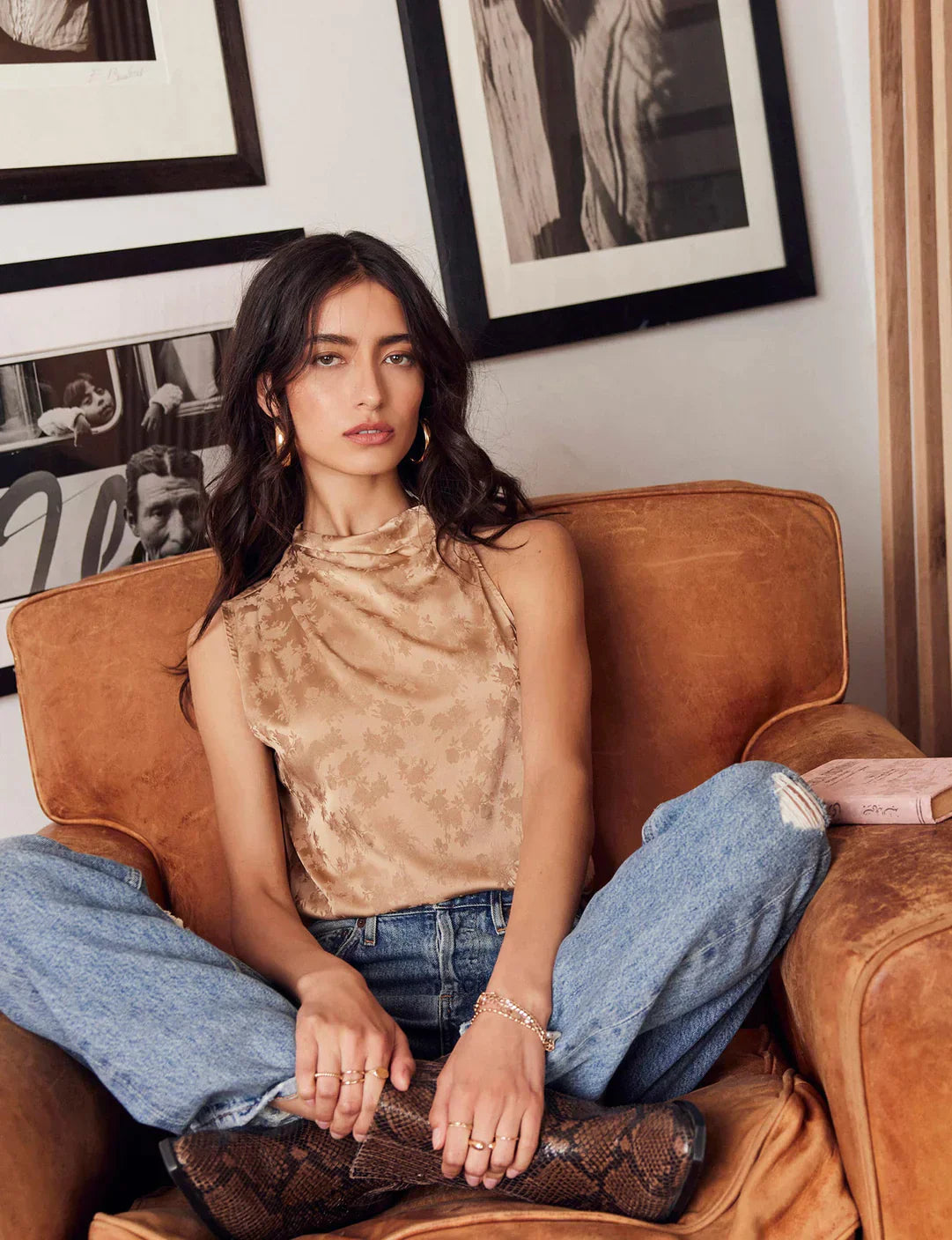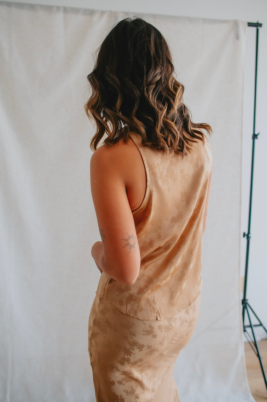 The Soleil Top is made of our soft jacquard satin and has an elegant cowl neckline. It has a button closure along the neckline for a soft draped bodice. Versatile and easy, wear solo or layer under a blazer for instant polish.