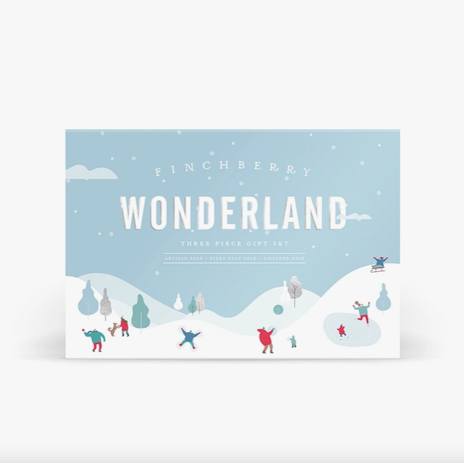 This perfectly giftable 3-piece holiday gift set includes a bar of Wonderland soap, a bottle of Wonderland Fizzy Salt Soak and a lilac blue Silicone Soap Dish.