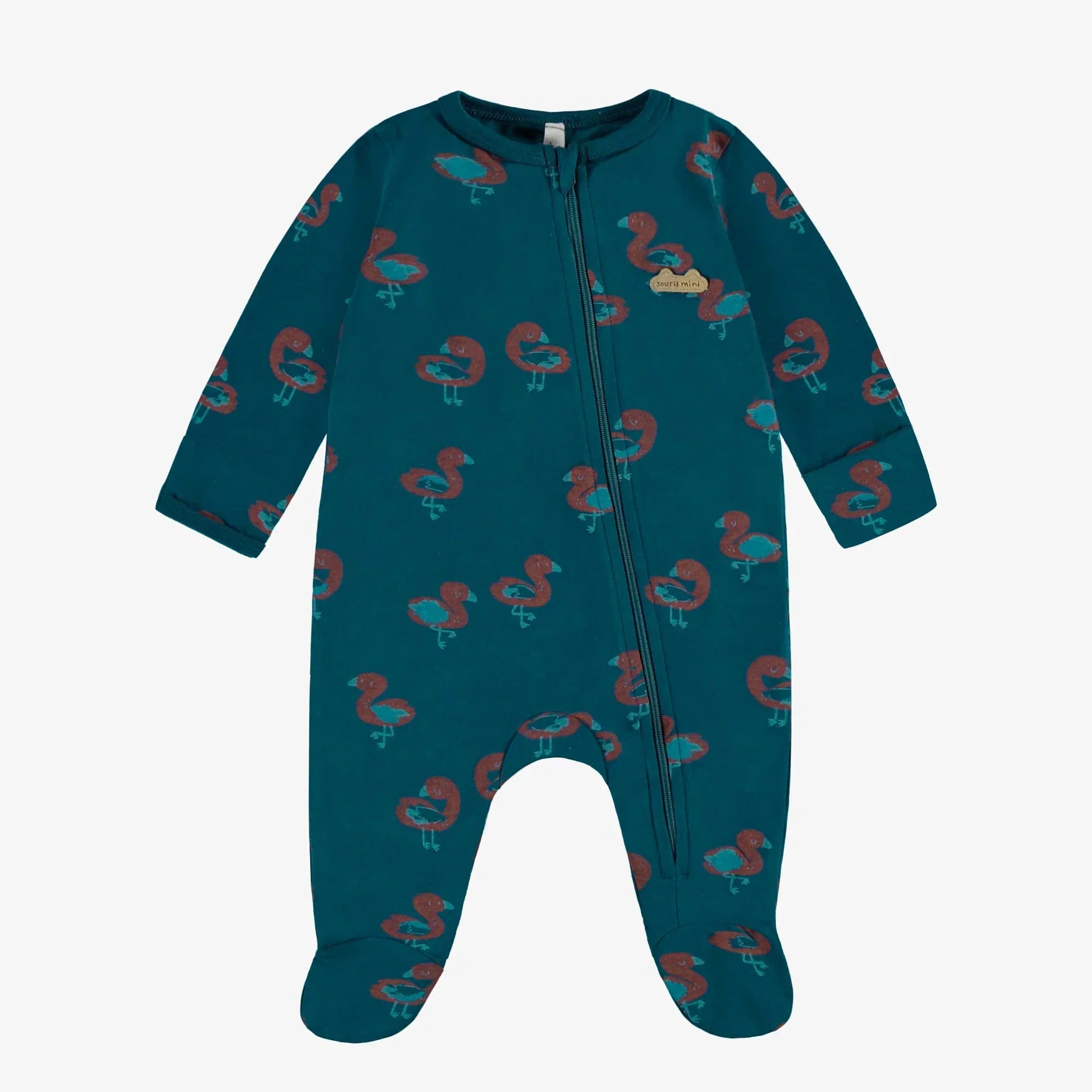 Long-sleeved deep blue-turquoise pajamas, round neck, with a full-height front zipper with orange flamingo all over print, in soft stretch cotton jersey.