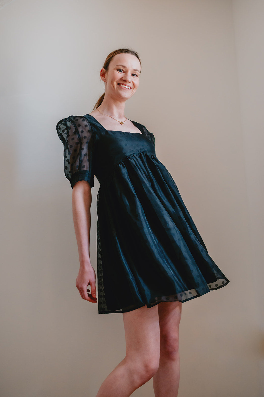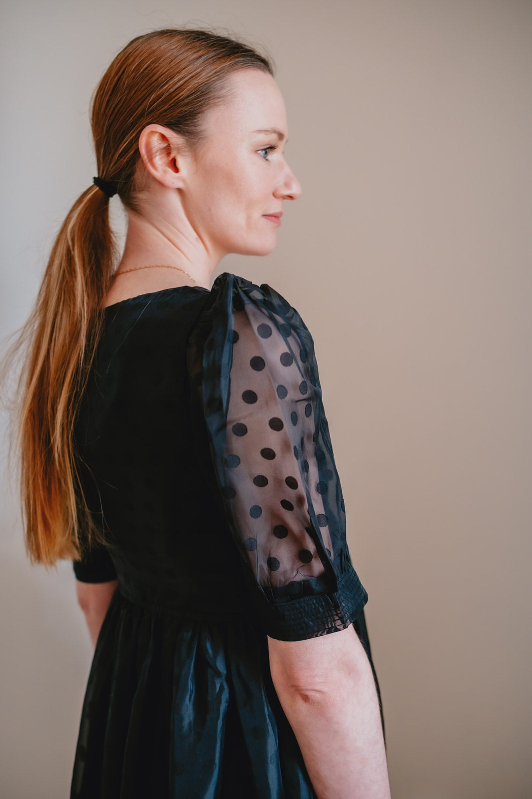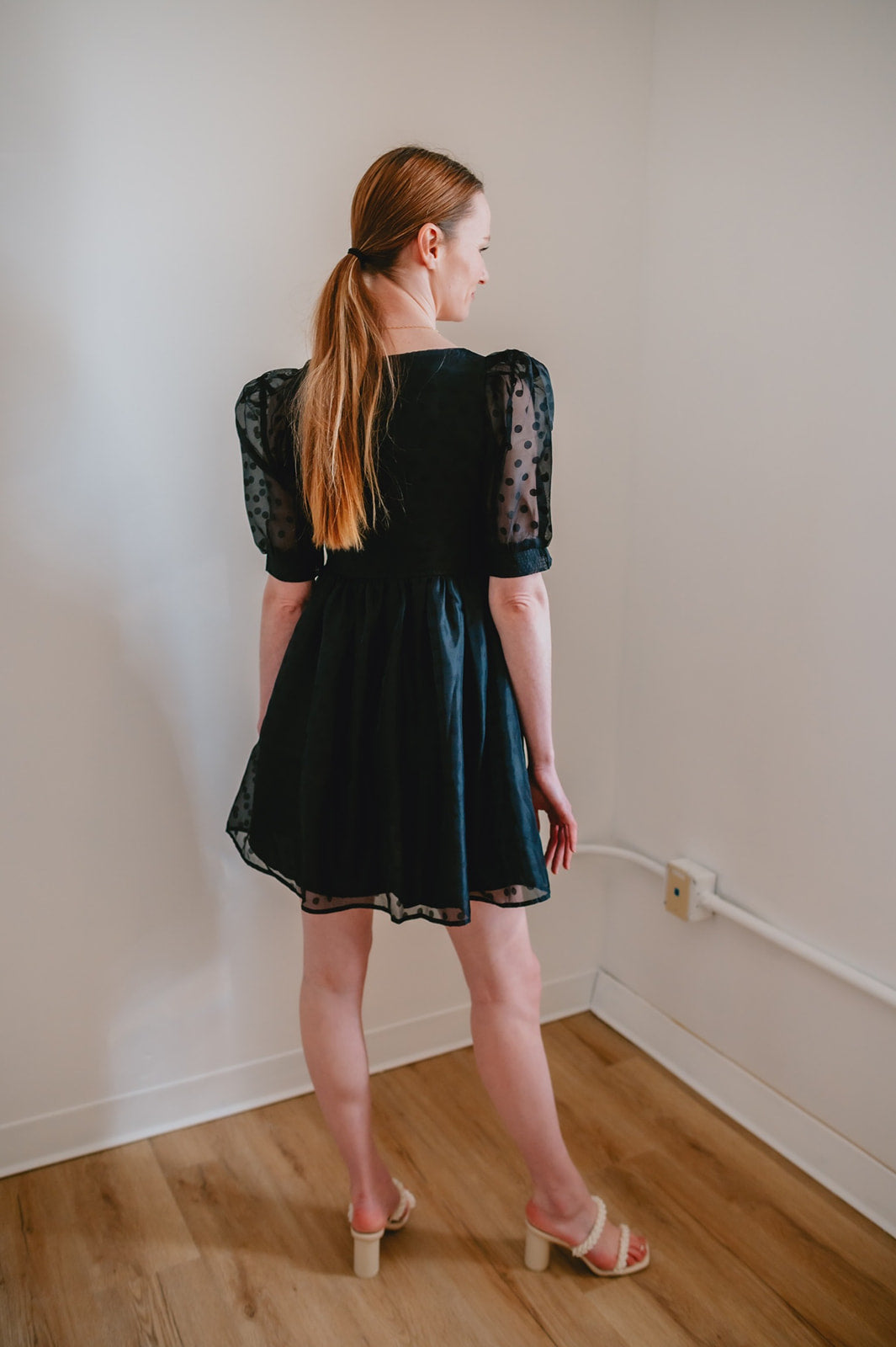The Sofia is such a cute twist on a little black dress. The simple silhouette keeps it easy to wear while the puff sleeve and polka dot organza keep things fancy. Fully lined but still light and airy, this dress is perfect for a wedding, graduation, or Mother's Day brunch.
