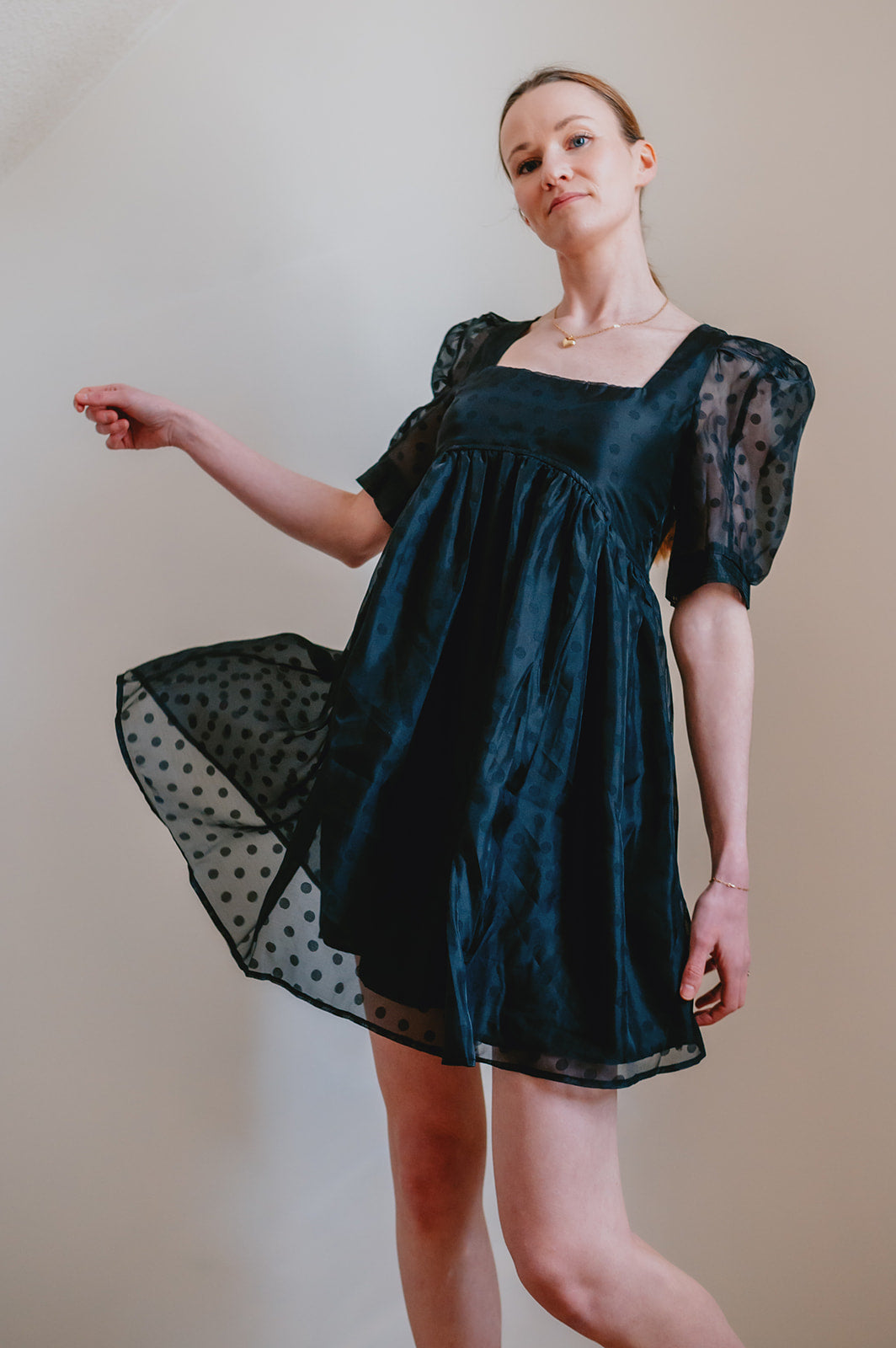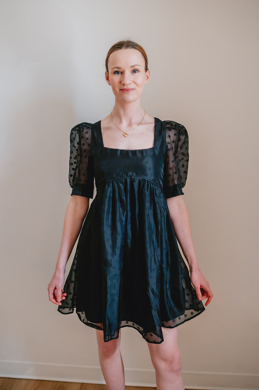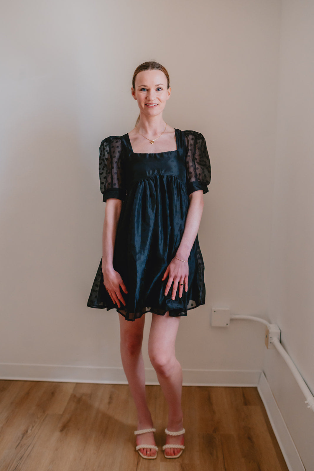 The Sofia is such a cute twist on a little black dress. The simple silhouette keeps it easy to wear while the puff sleeve and polka dot organza keep things fancy. Fully lined but still light and airy, this dress is perfect for a wedding, graduation, or Mother's Day brunch.