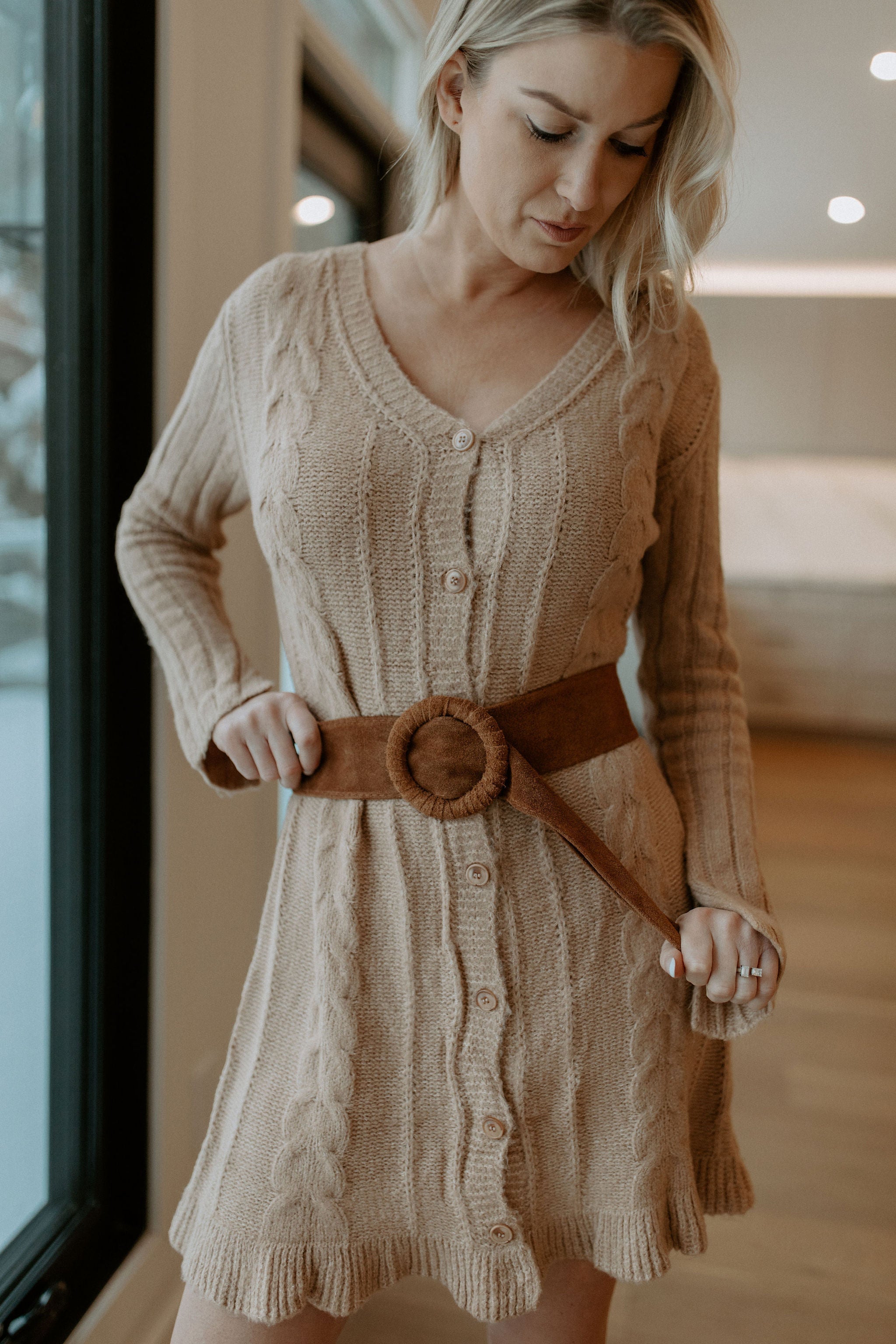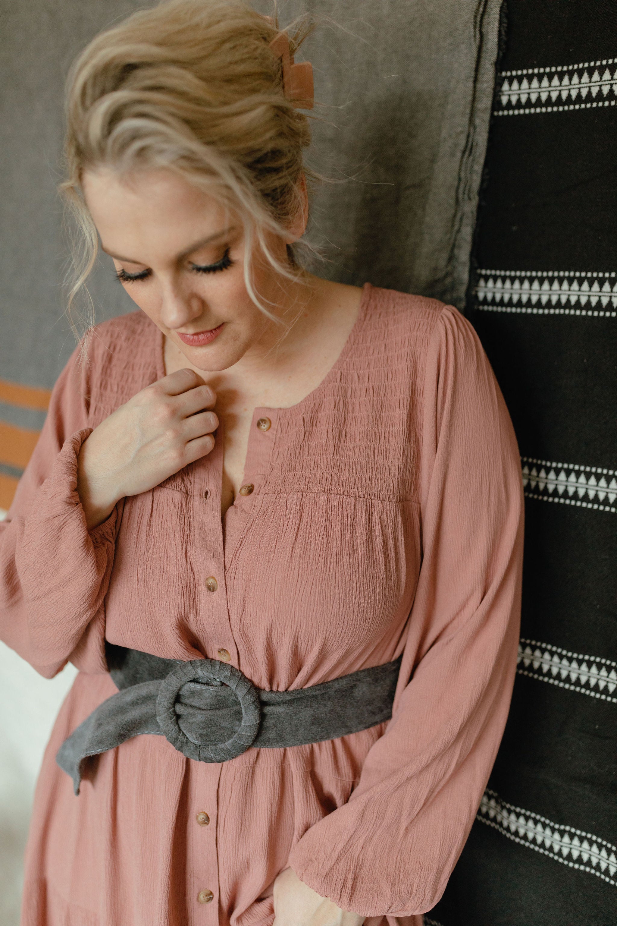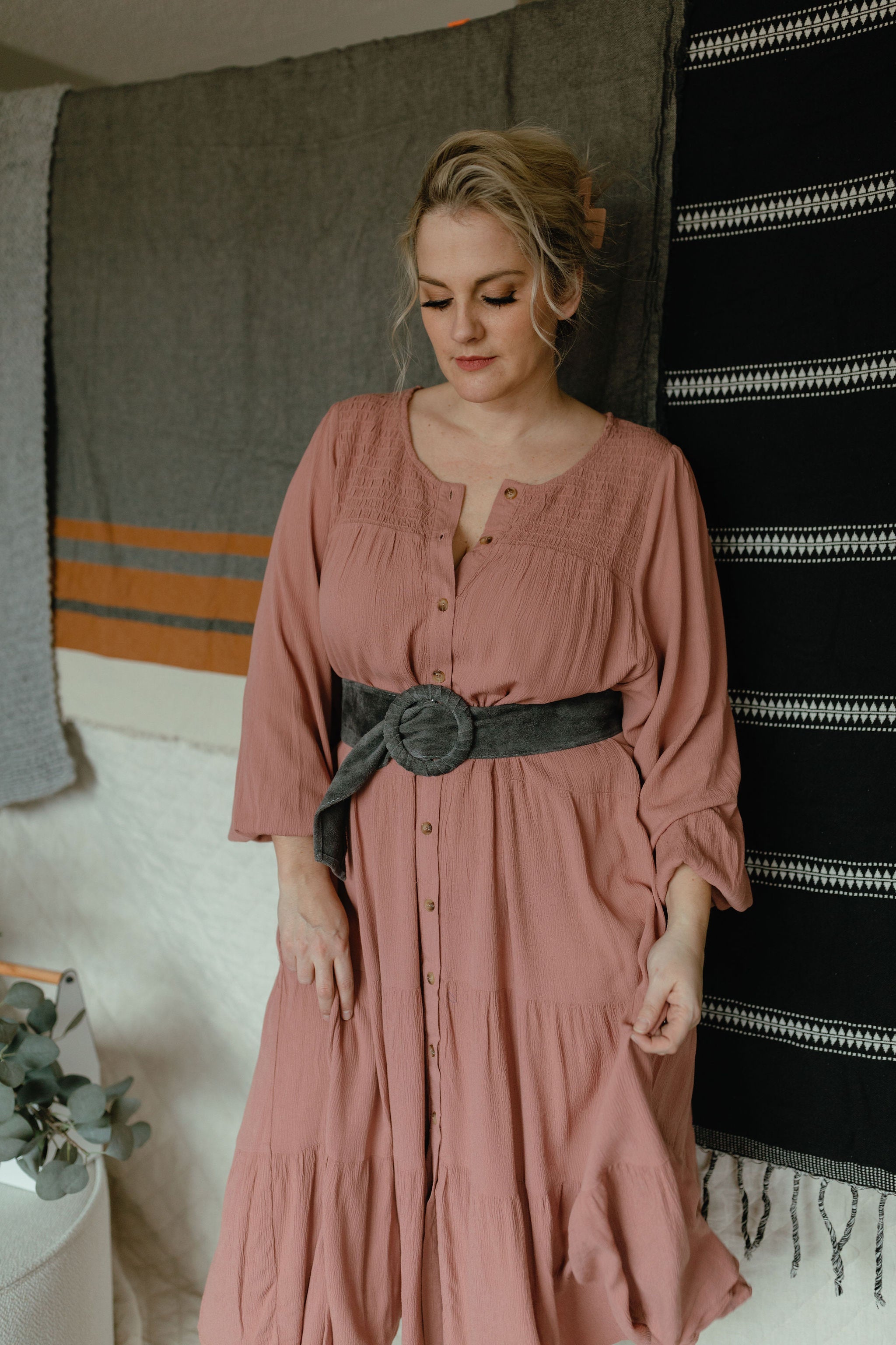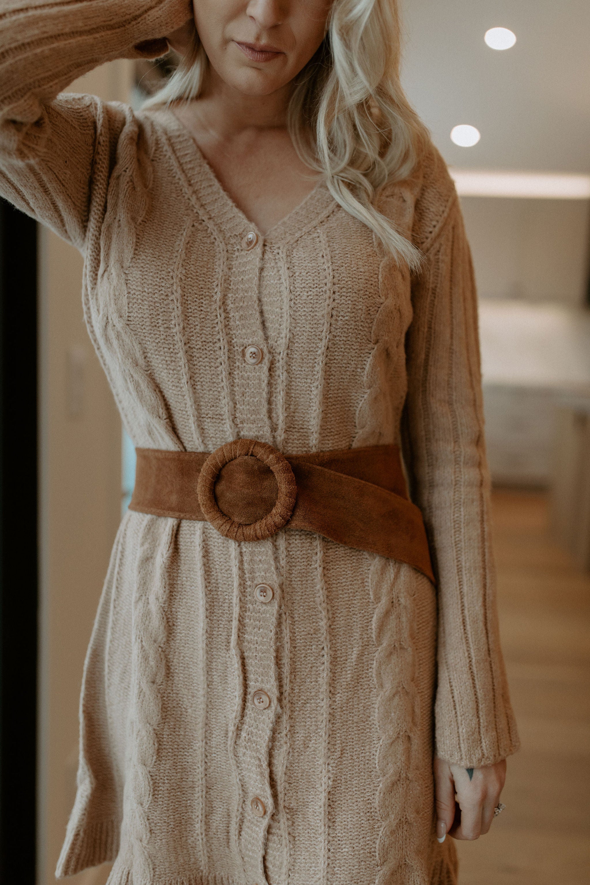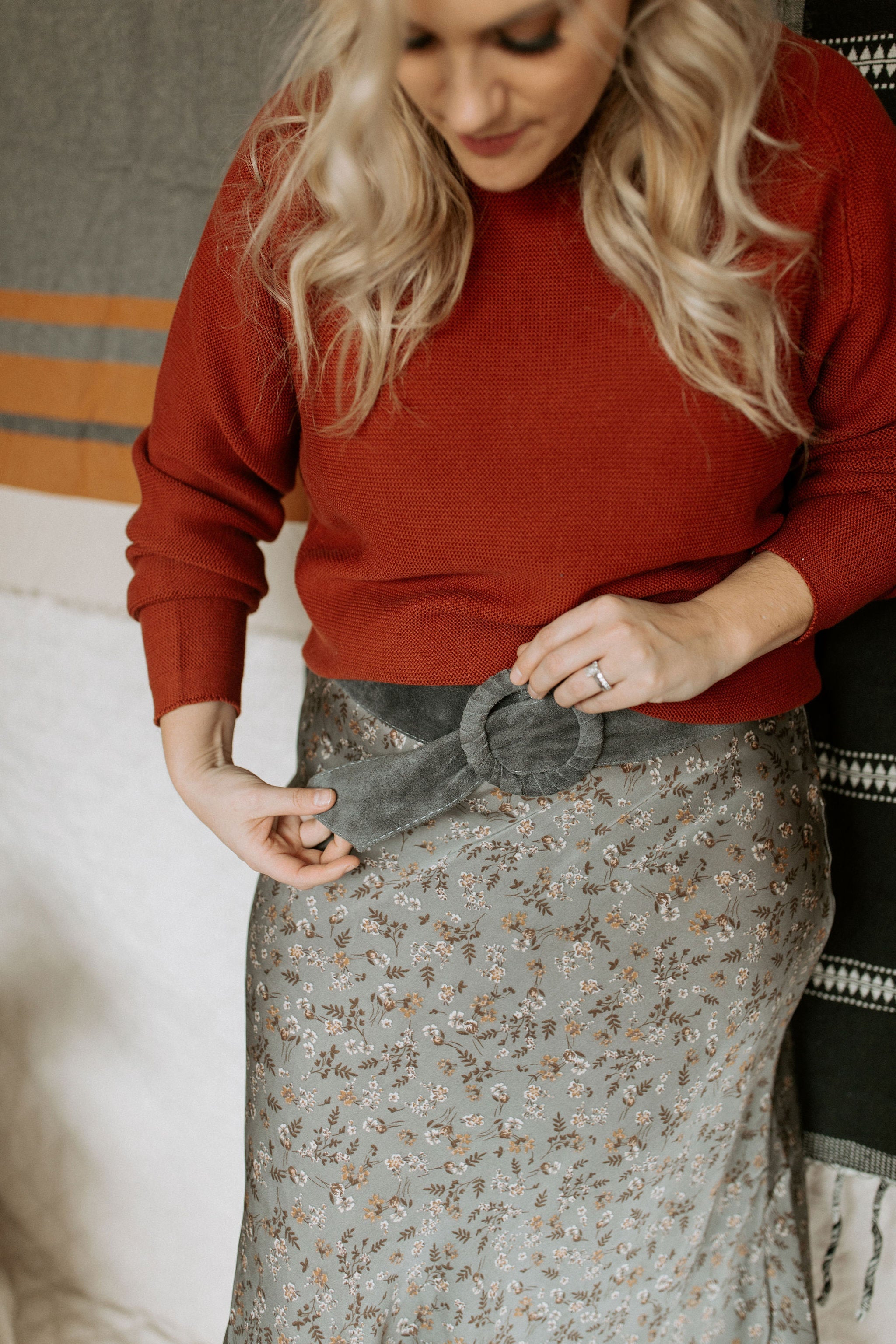 This Suede Round Buckle adjustable belt has a beautiful wrapped buckle. Made from Italian leather.