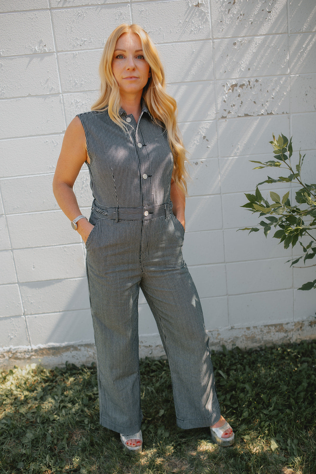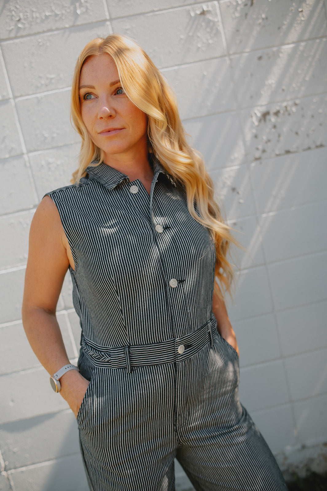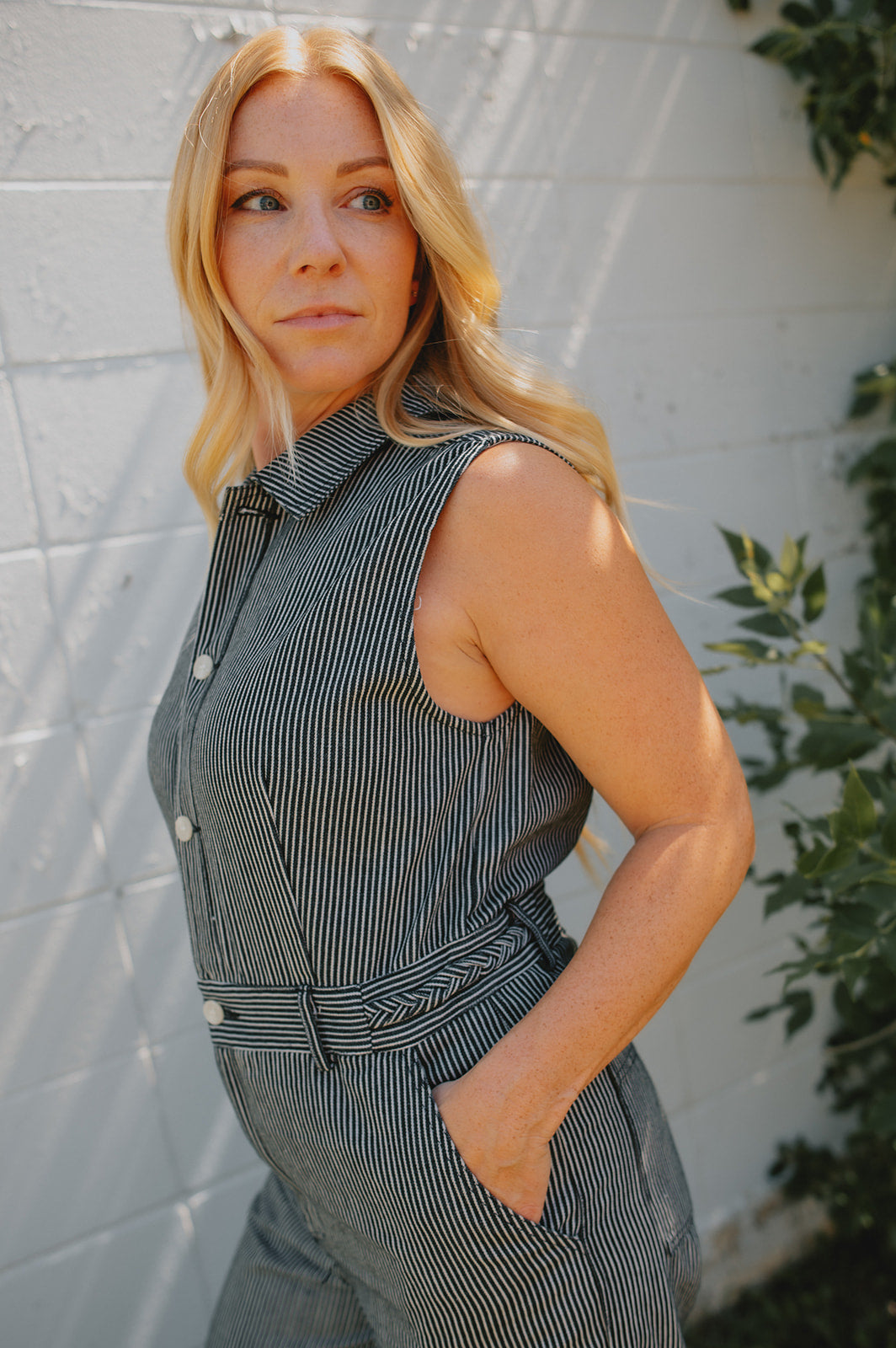 The Simone Railroad Stripe Button Jumpsuit blends utilitarian charm with effortless tailoring. Made from a soft cotton-viscose blend, it features a sleeveless, collared button-up bodice with subtle darting for a flattering fit, a braided waist detail, and wide-leg pants with cuffed hems that hit just above the ankle. Complete with belt loops, a zipper fly, and side and back pockets, the railroad stripe pattern adds a vintage-inspired edge to this one-and-done piece.