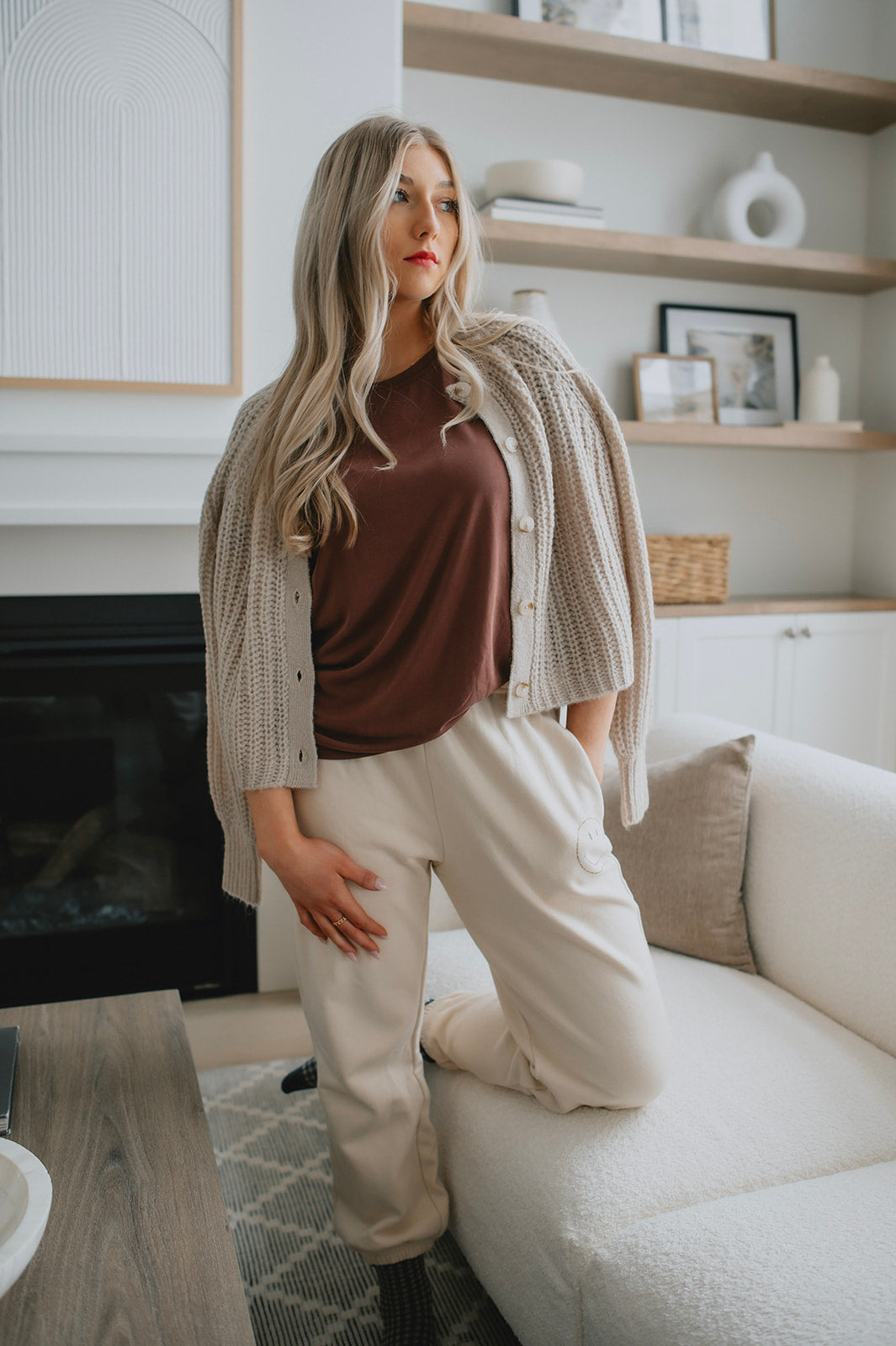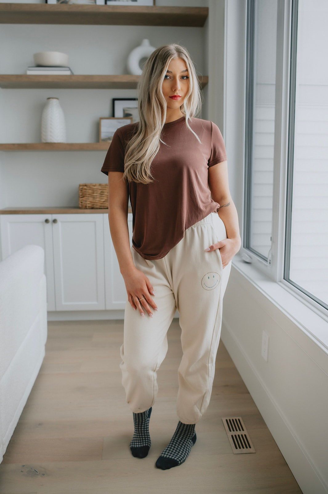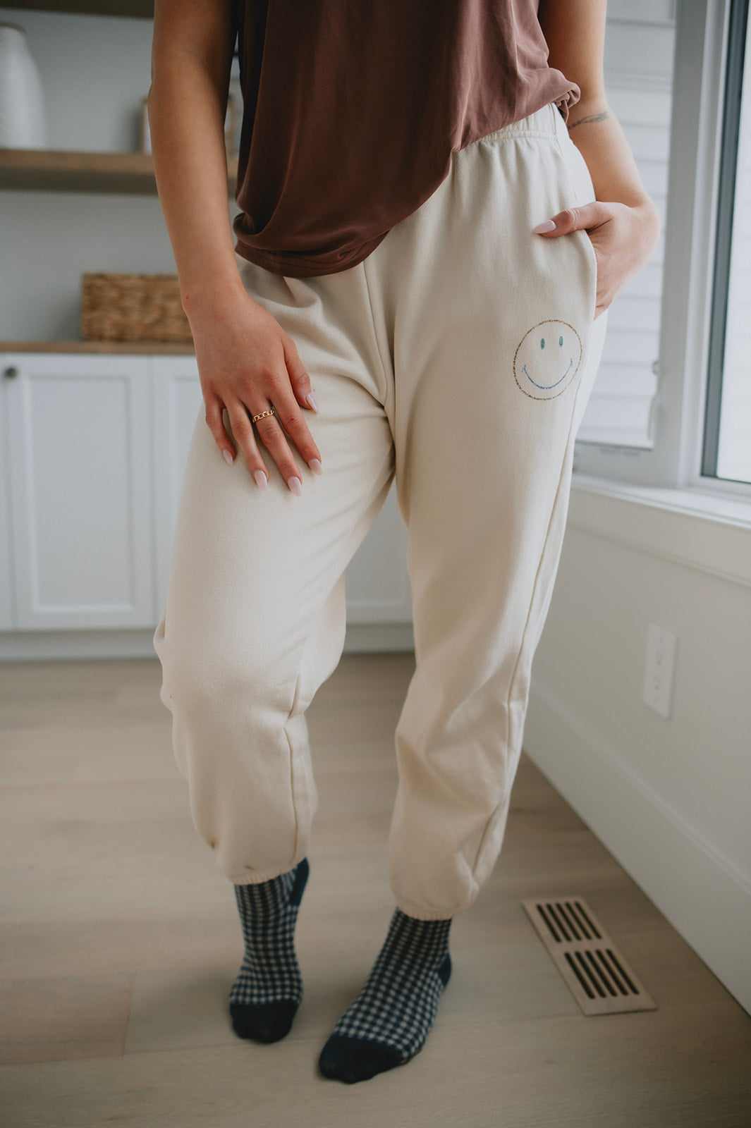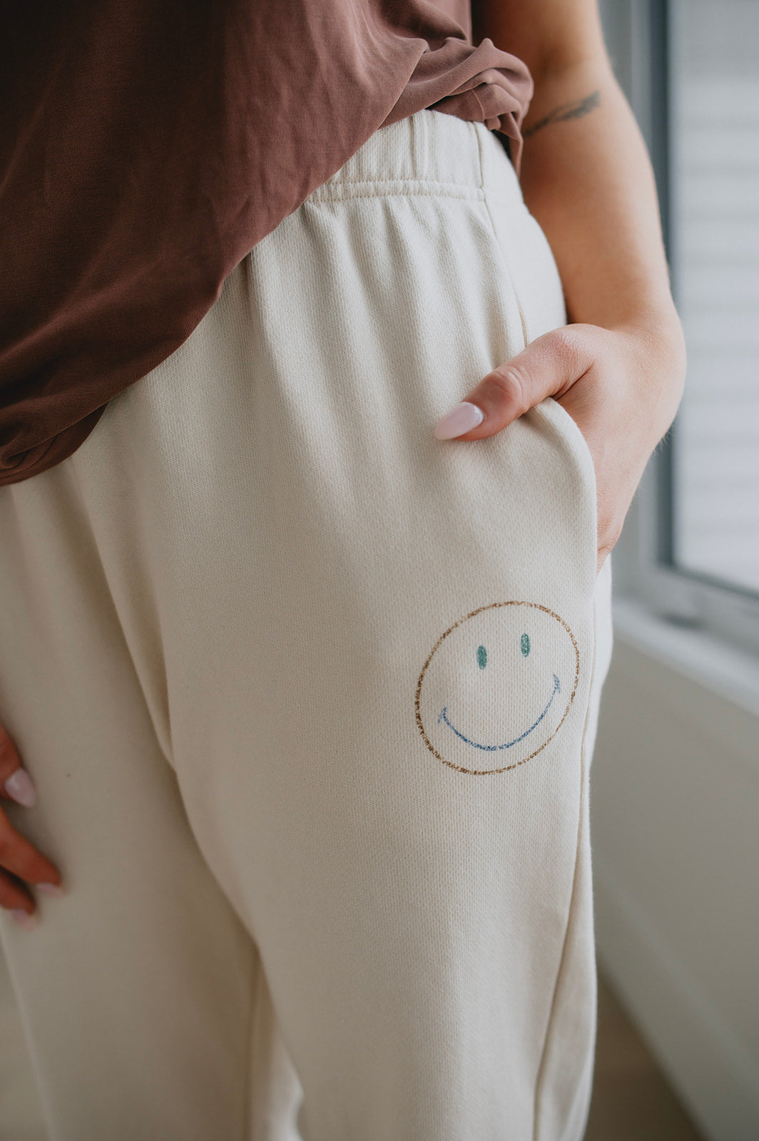 We live for a good sweatpant and these are great ones. They are a gorgeous warm beige with the cutest smiley face on the thigh that makes them a bit more elevated than your run of the mill sweatpant. We'd pair these with a tee and a shacket or denim jacket to wear out running errands, or with an oversized cozy sweater and some socks for cozy days.