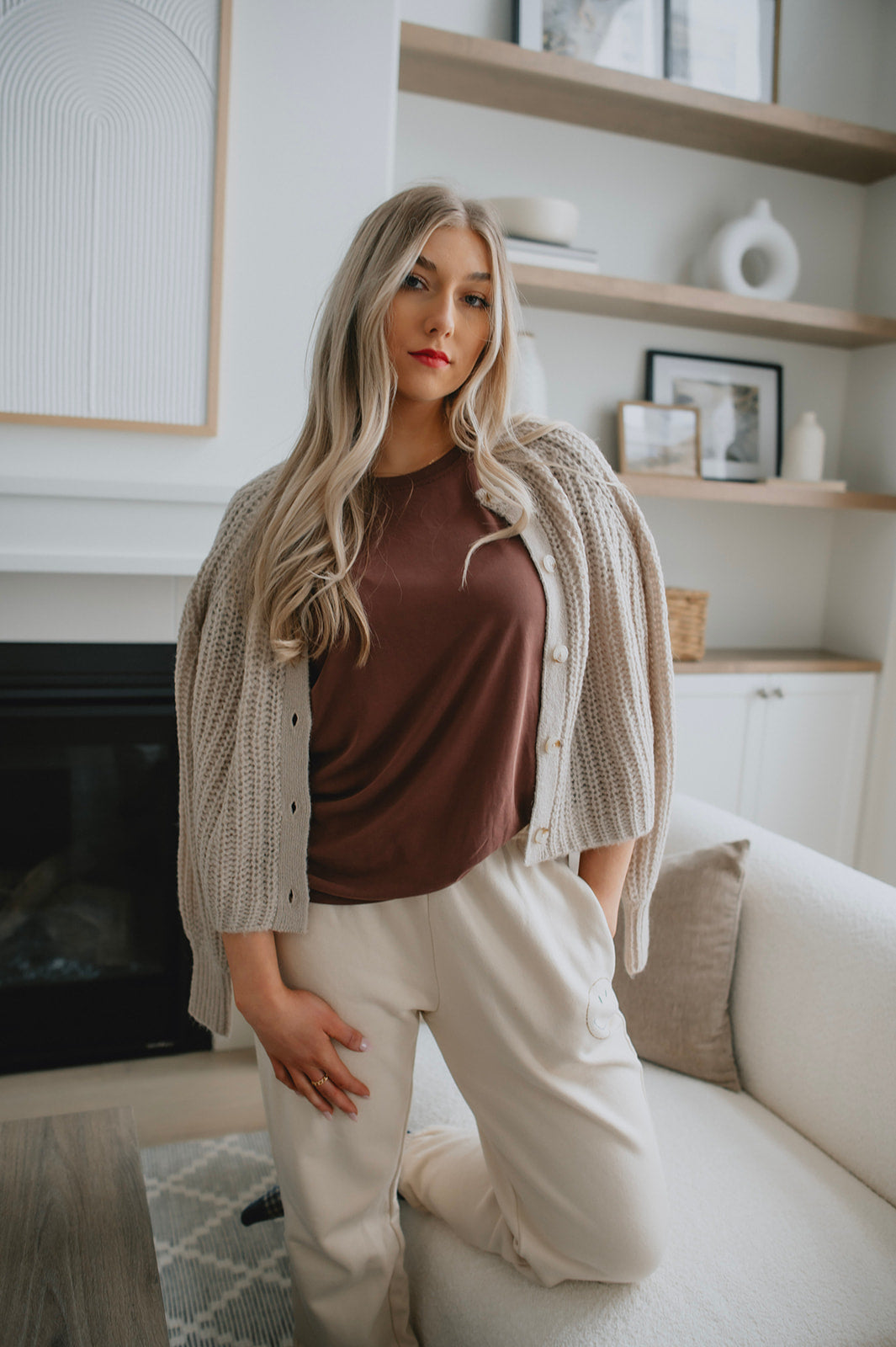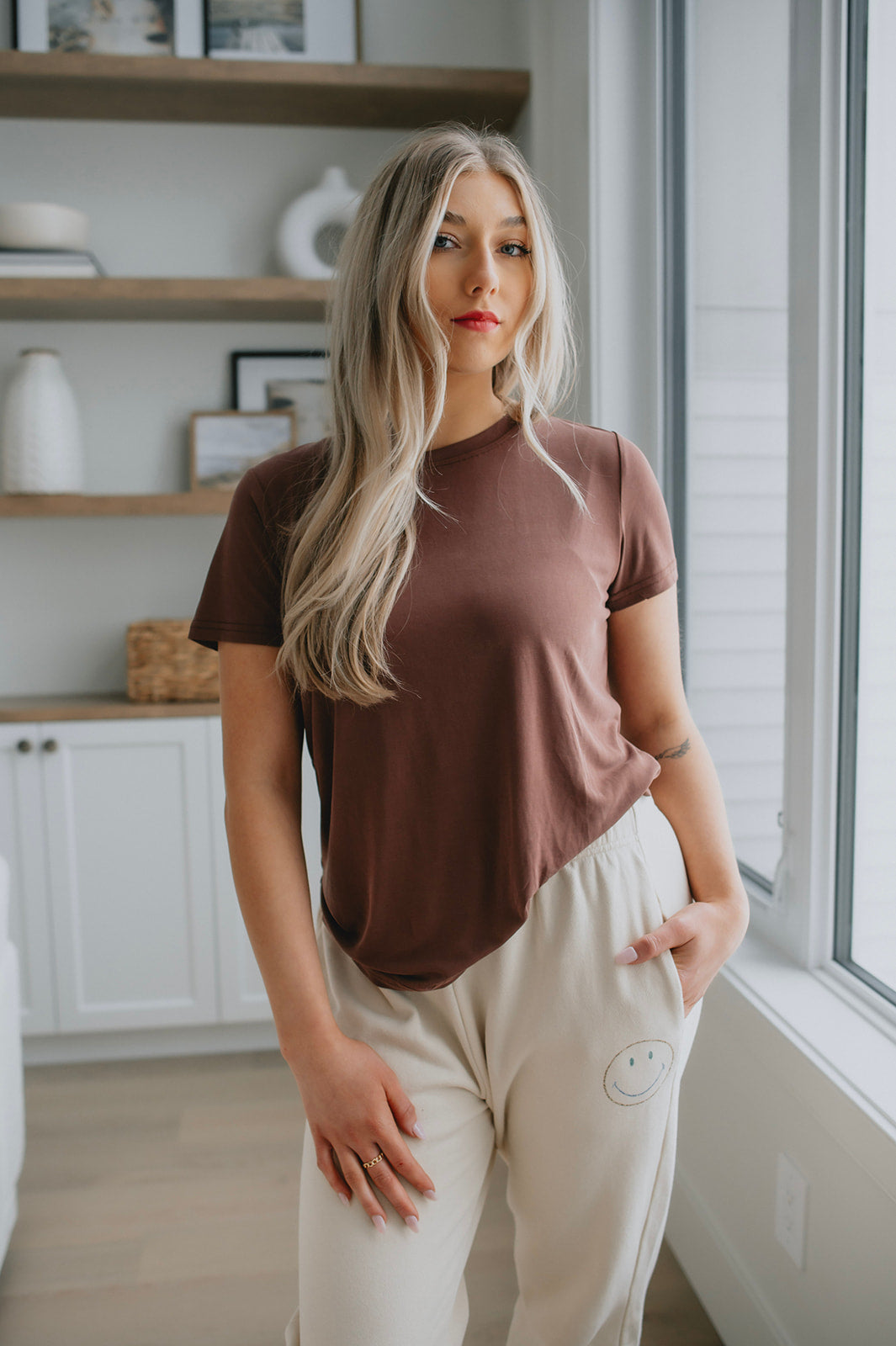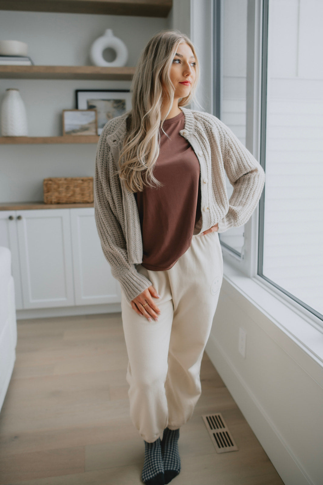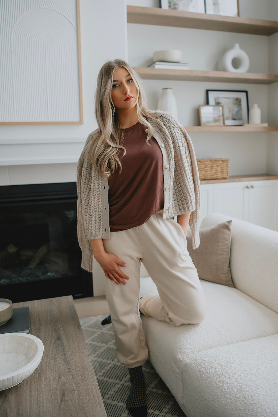 We live for a good sweatpant and these are great ones. They are a gorgeous warm beige with the cutest smiley face on the thigh that makes them a bit more elevated than your run of the mill sweatpant. We'd pair these with a tee and a shacket or denim jacket to wear out running errands, or with an oversized cozy sweater and some socks for cozy days.