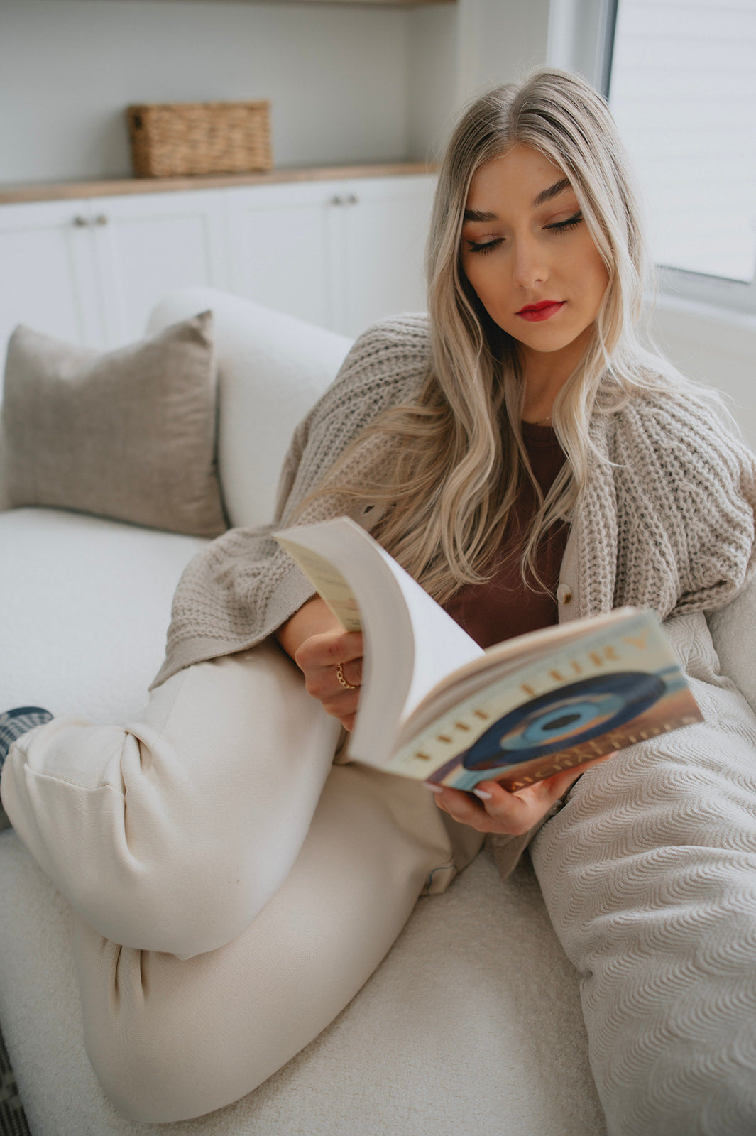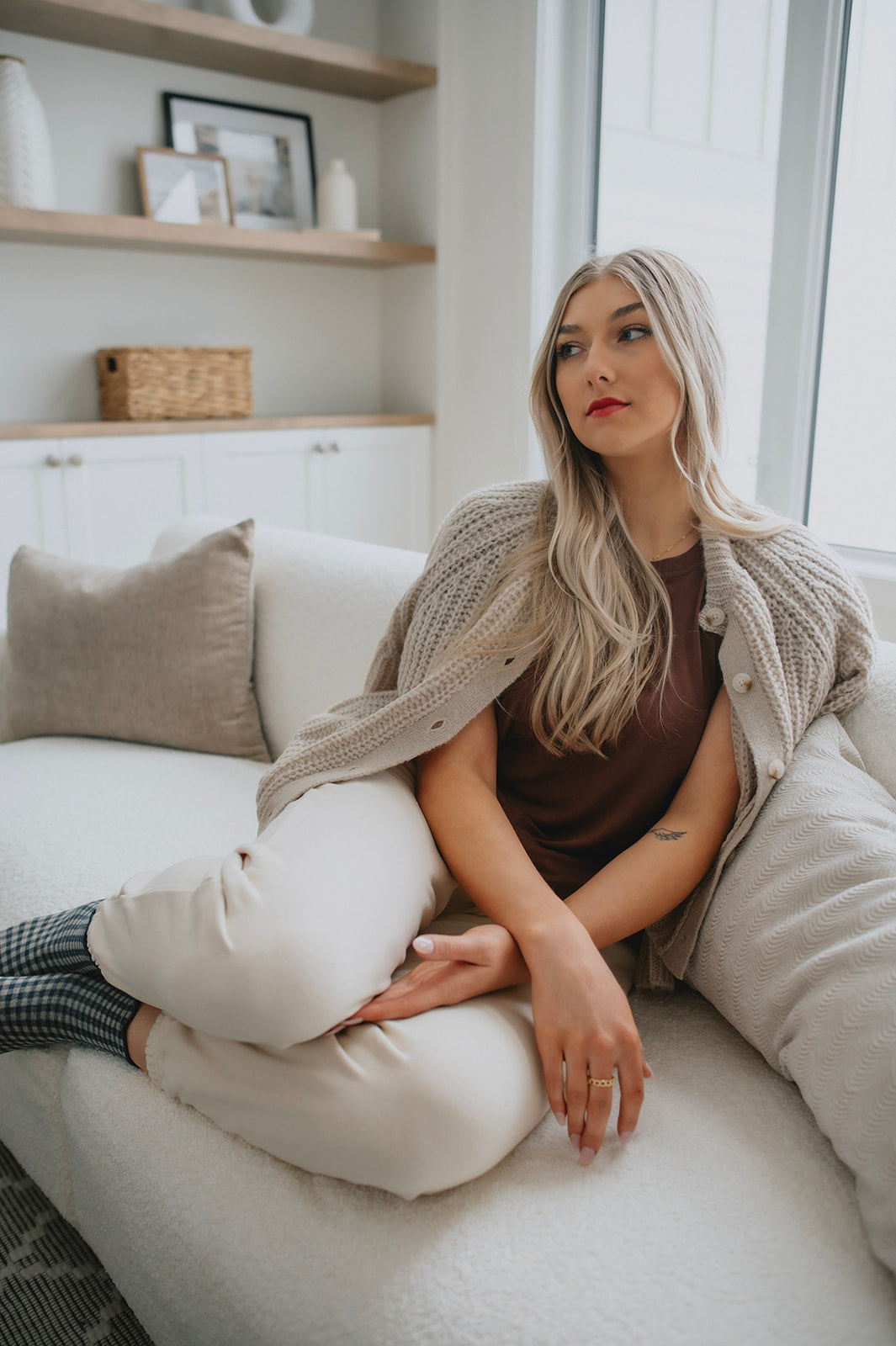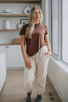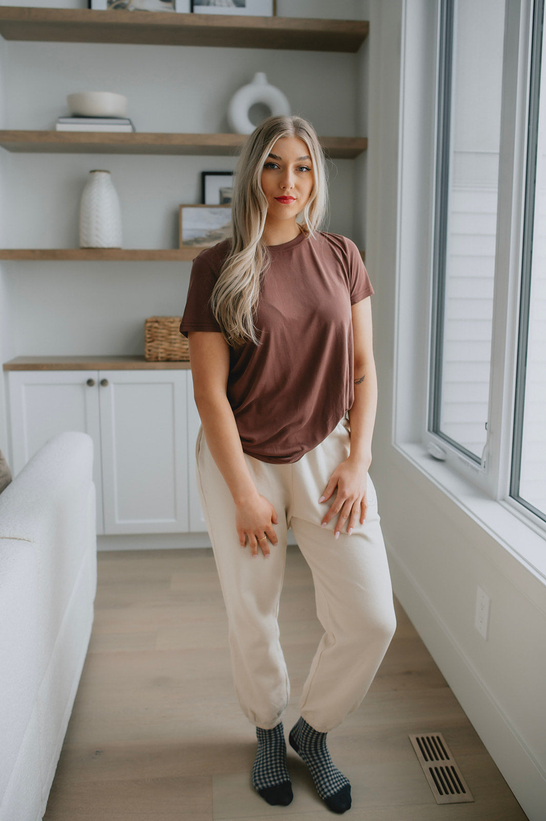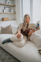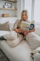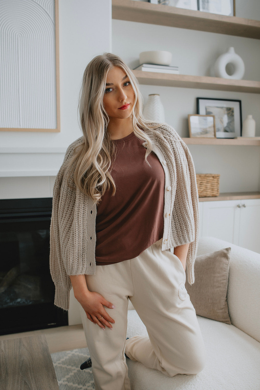 We live for a good sweatpant and these are great ones. They are a gorgeous warm beige with the cutest smiley face on the thigh that makes them a bit more elevated than your run of the mill sweatpant. We'd pair these with a tee and a shacket or denim jacket to wear out running errands, or with an oversized cozy sweater and some socks for cozy days.