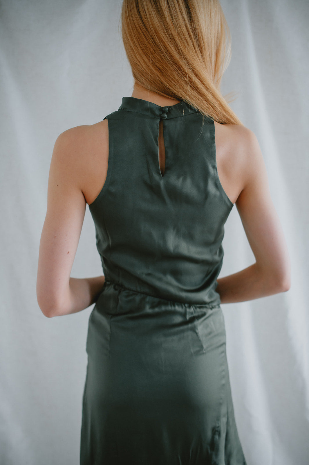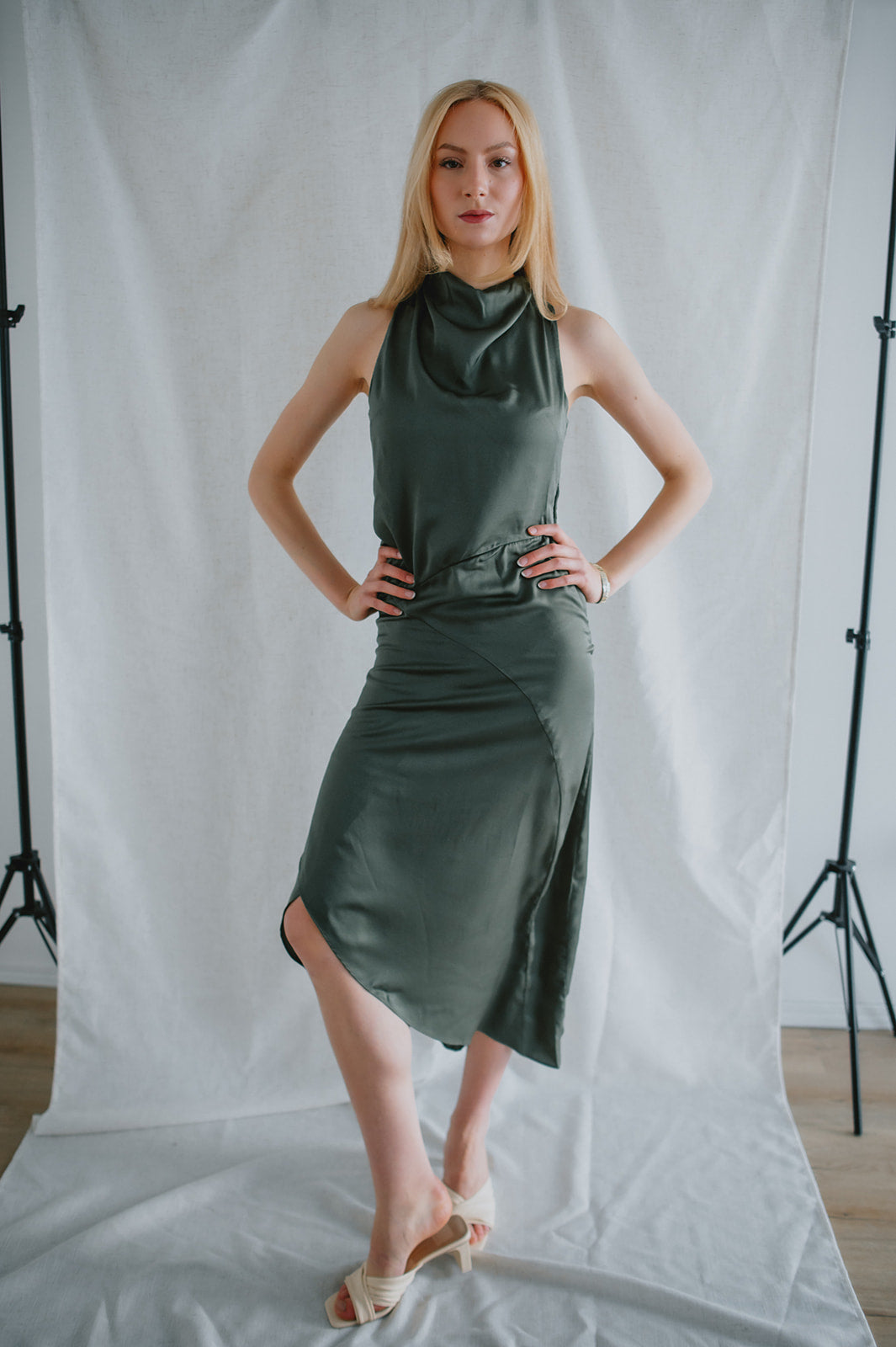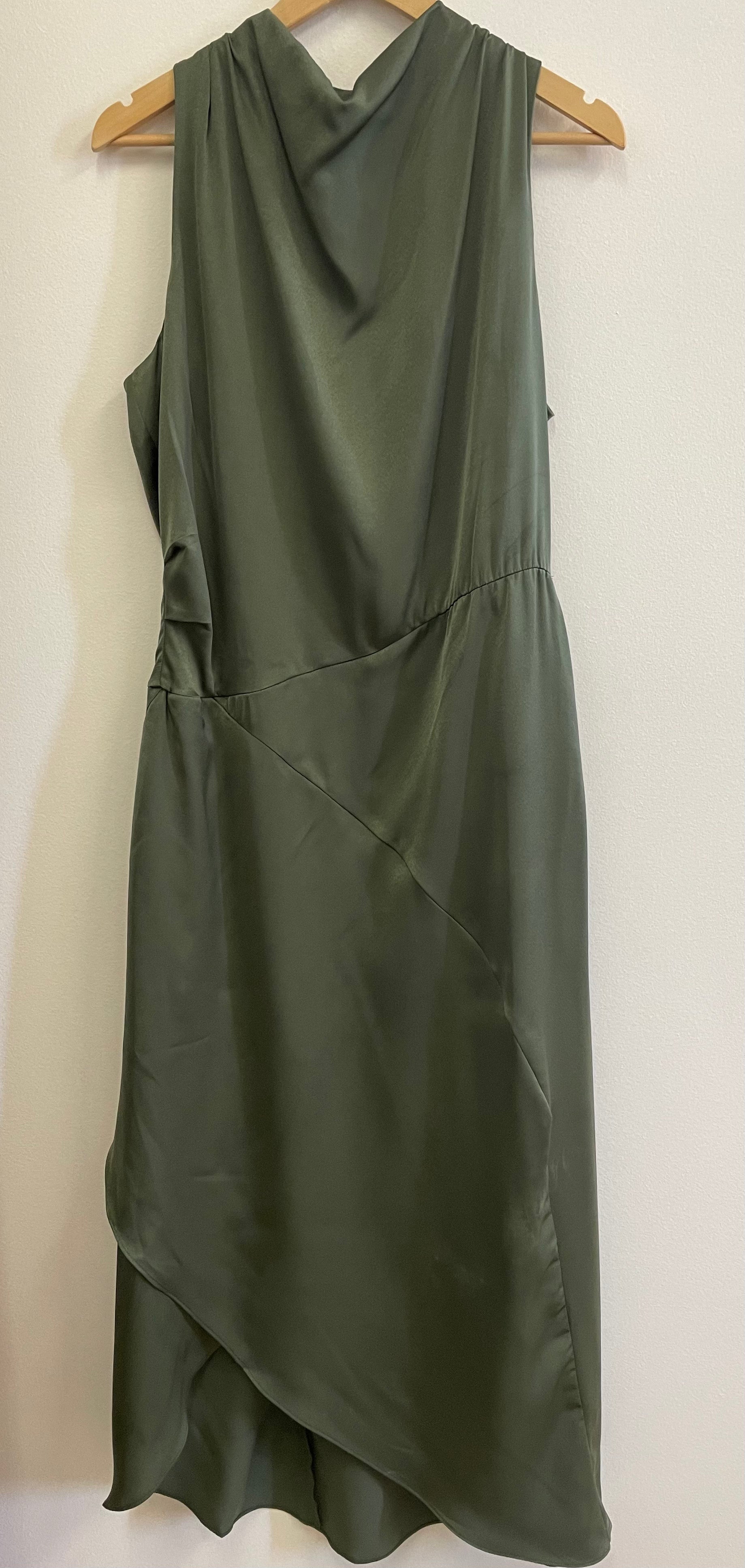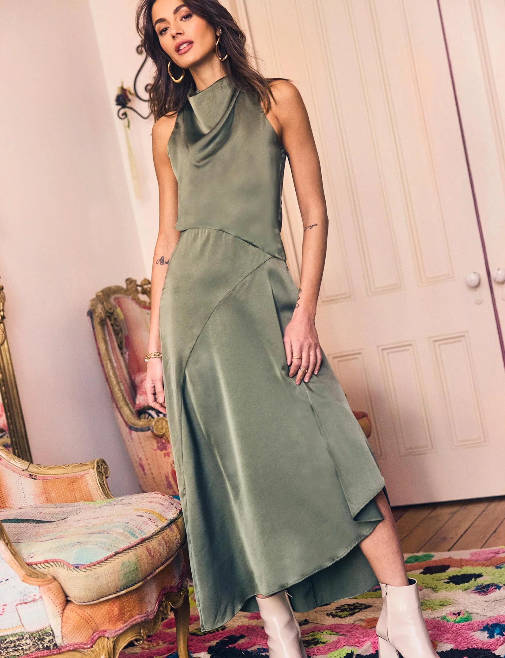 Get ready for the party season with the Laurel Dress. It is made from a lux-washed satin. It features a cowl neck, a seamed body for a flattering fit, and an asymmetric hemline. Pair with flats or kitten heels for a cool girl evening look.