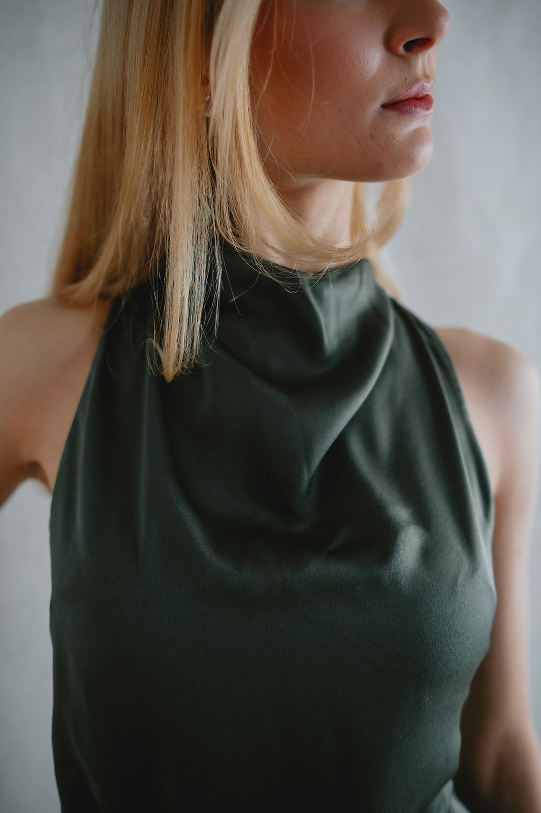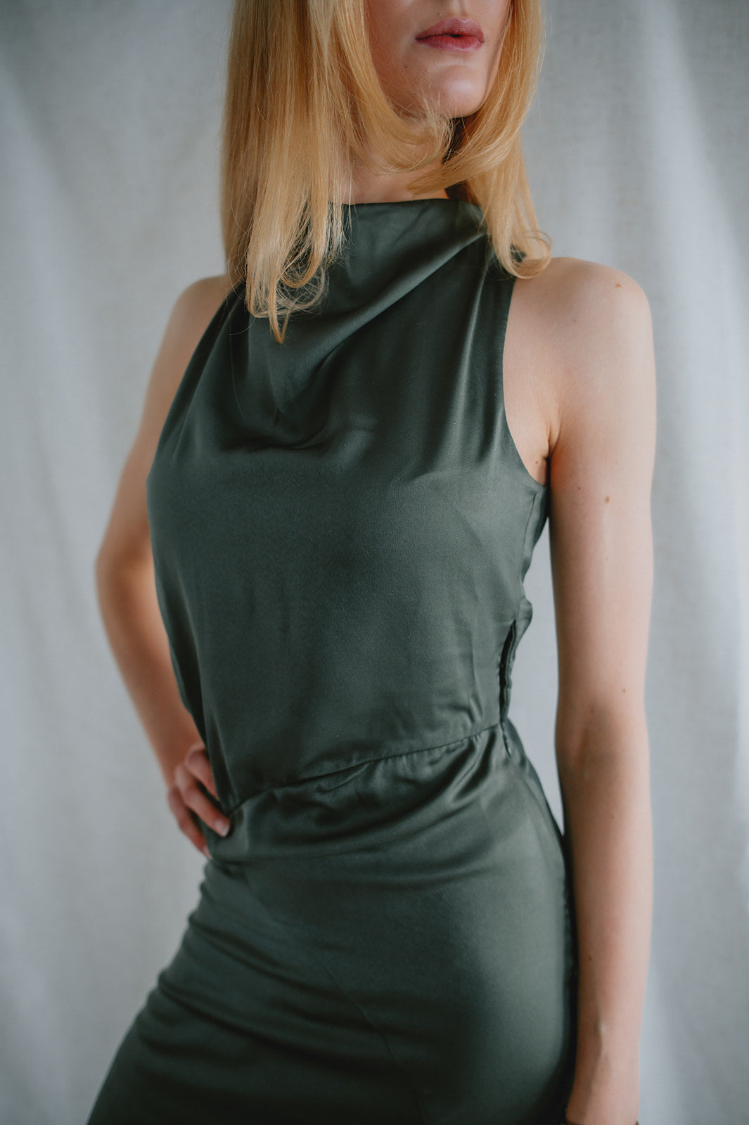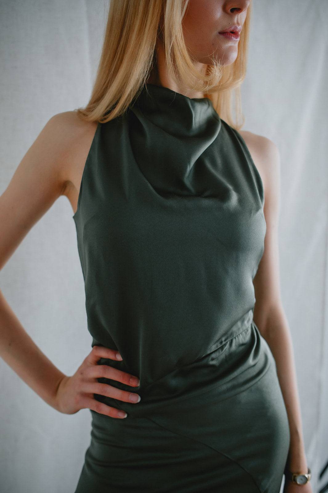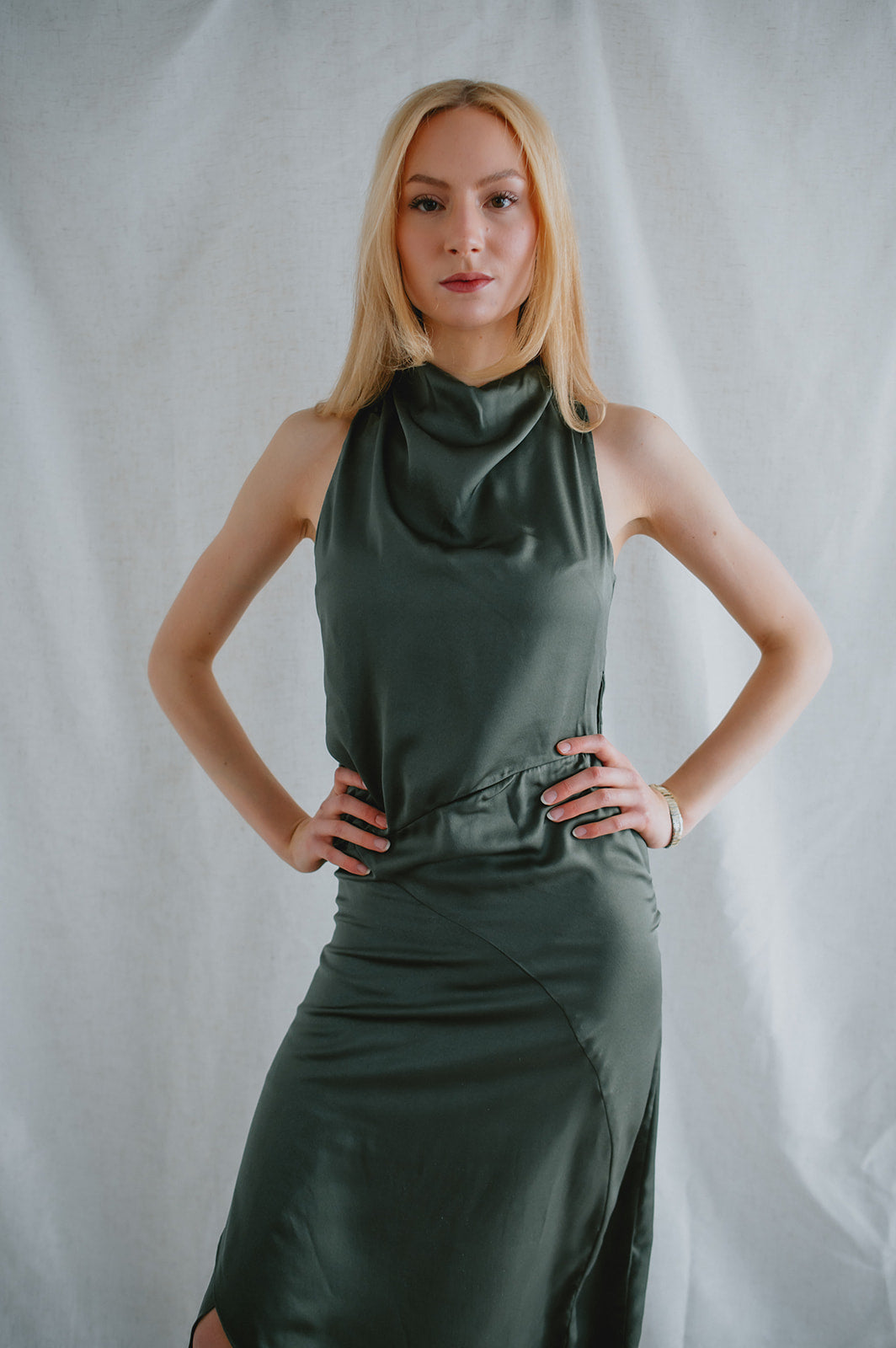Get ready for the party season with the Laurel Dress. It is made from a lux-washed satin. It features a cowl neck, a seamed body for a flattering fit, and an asymmetric hemline. Pair with flats or kitten heels for a cool girl evening look.
