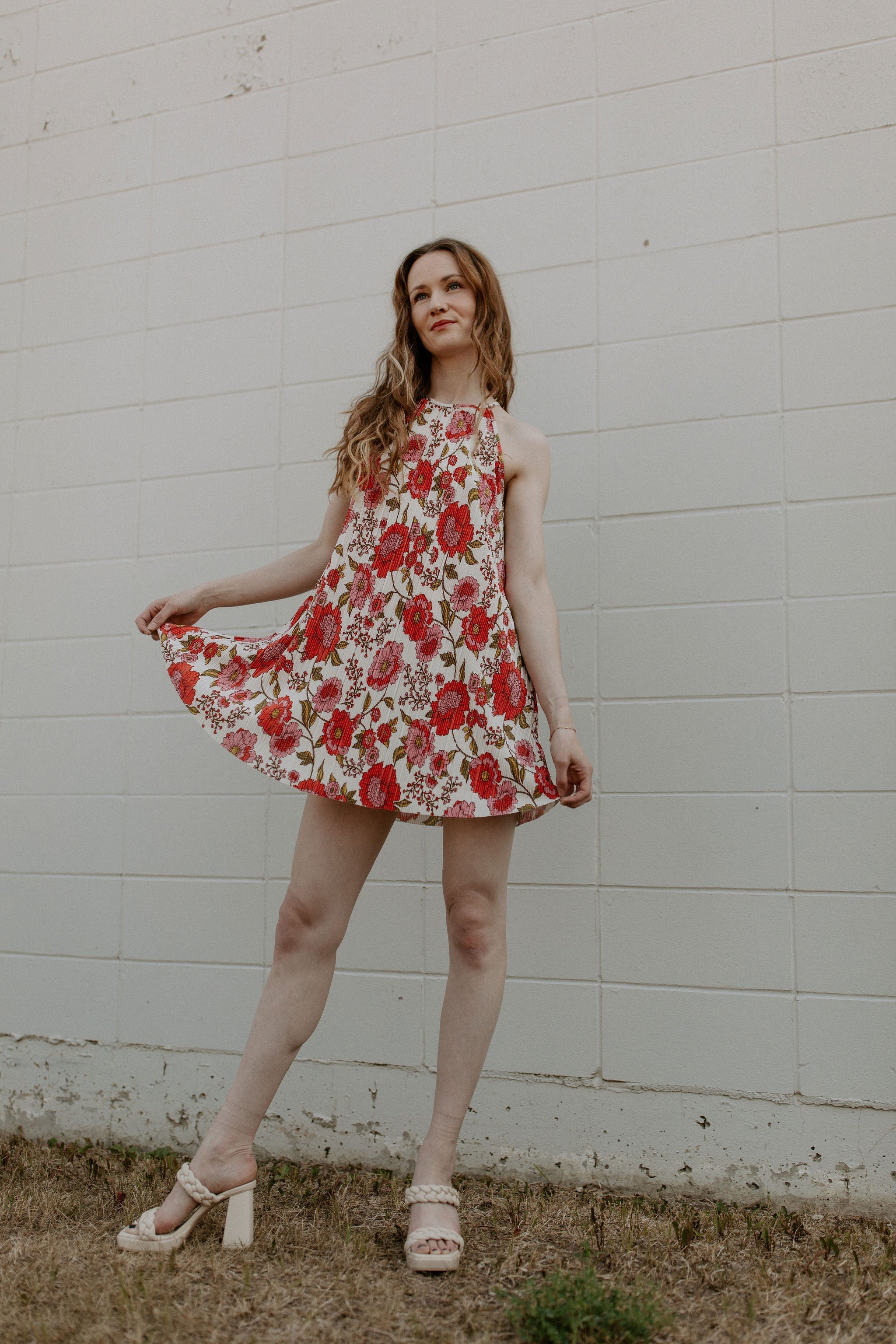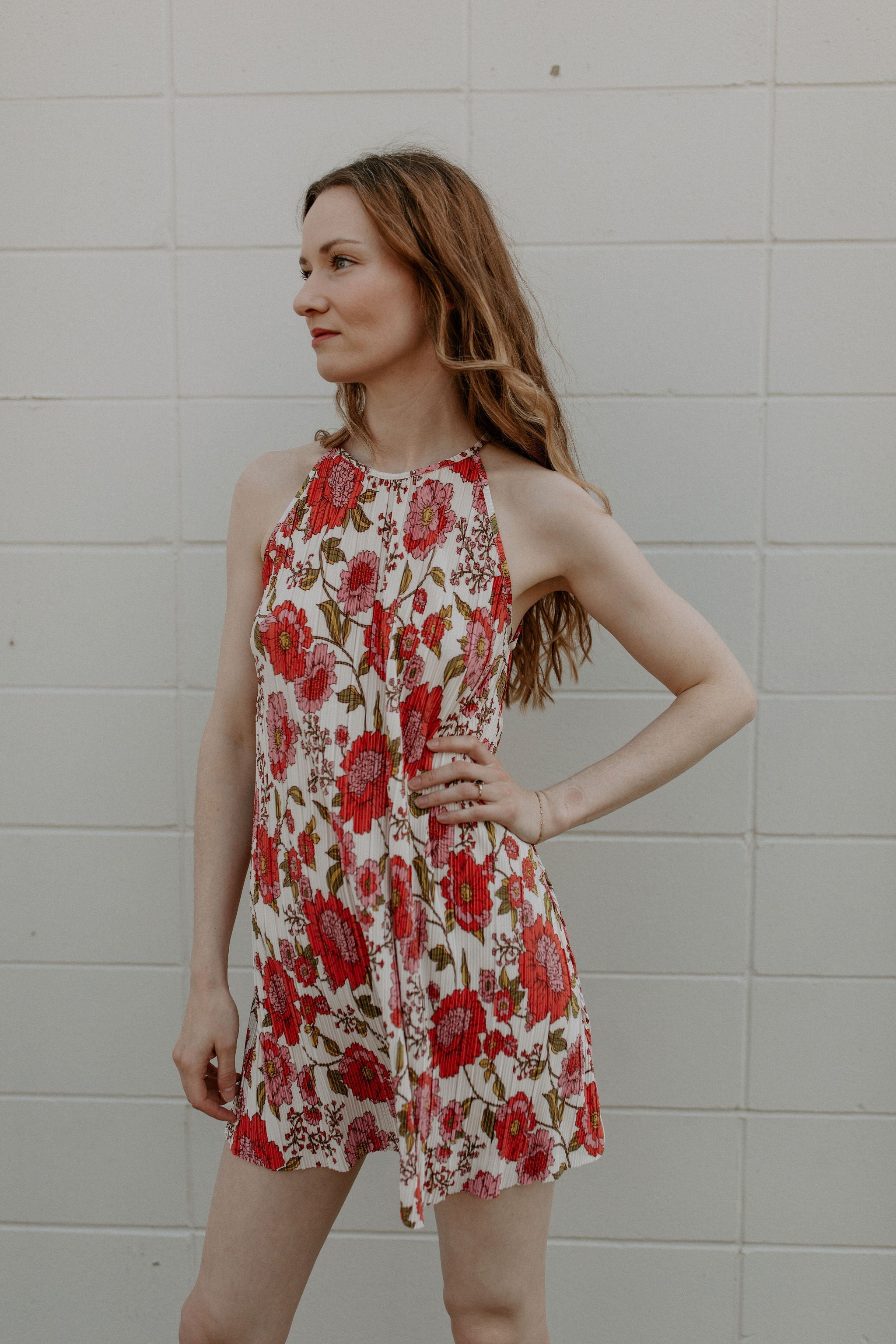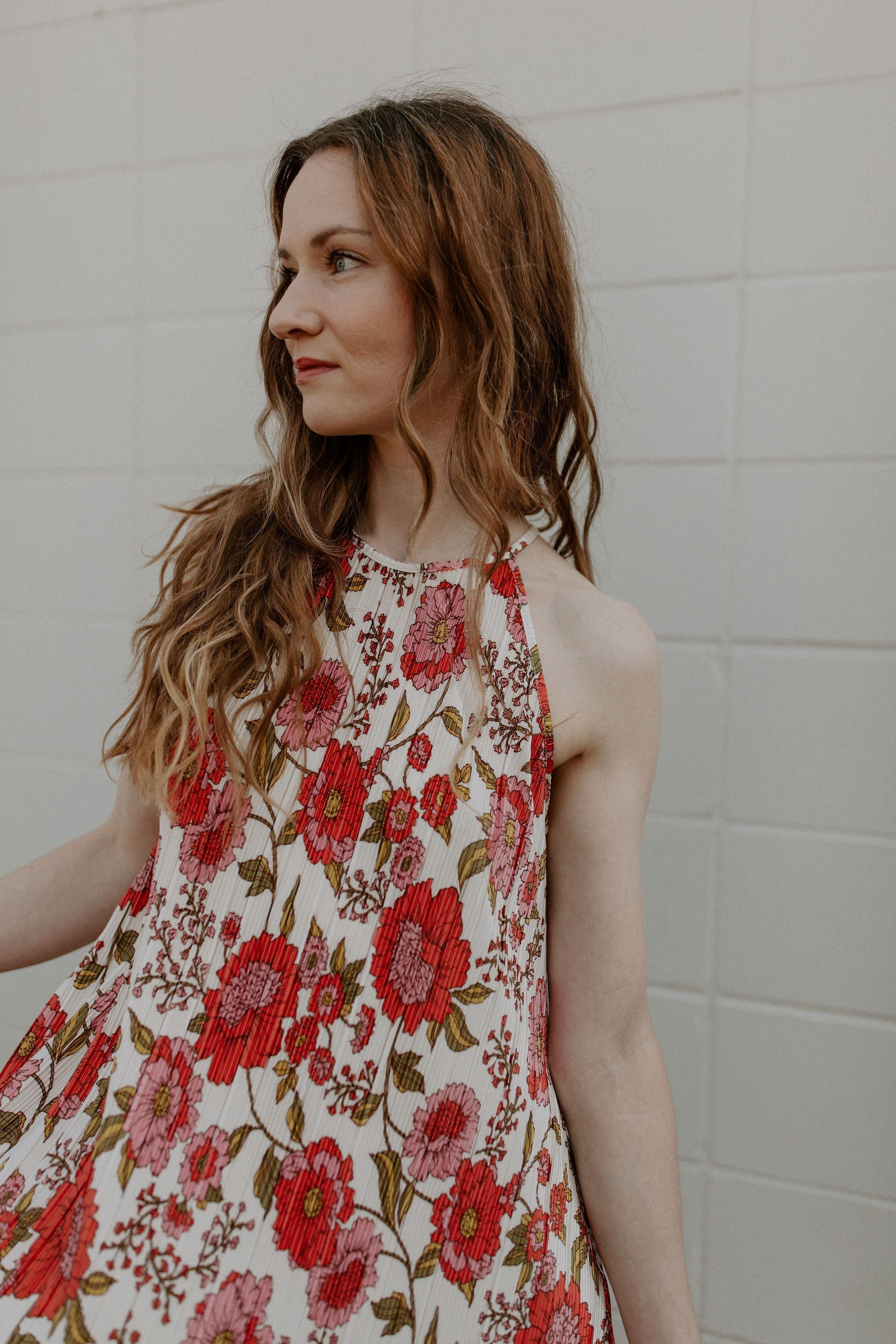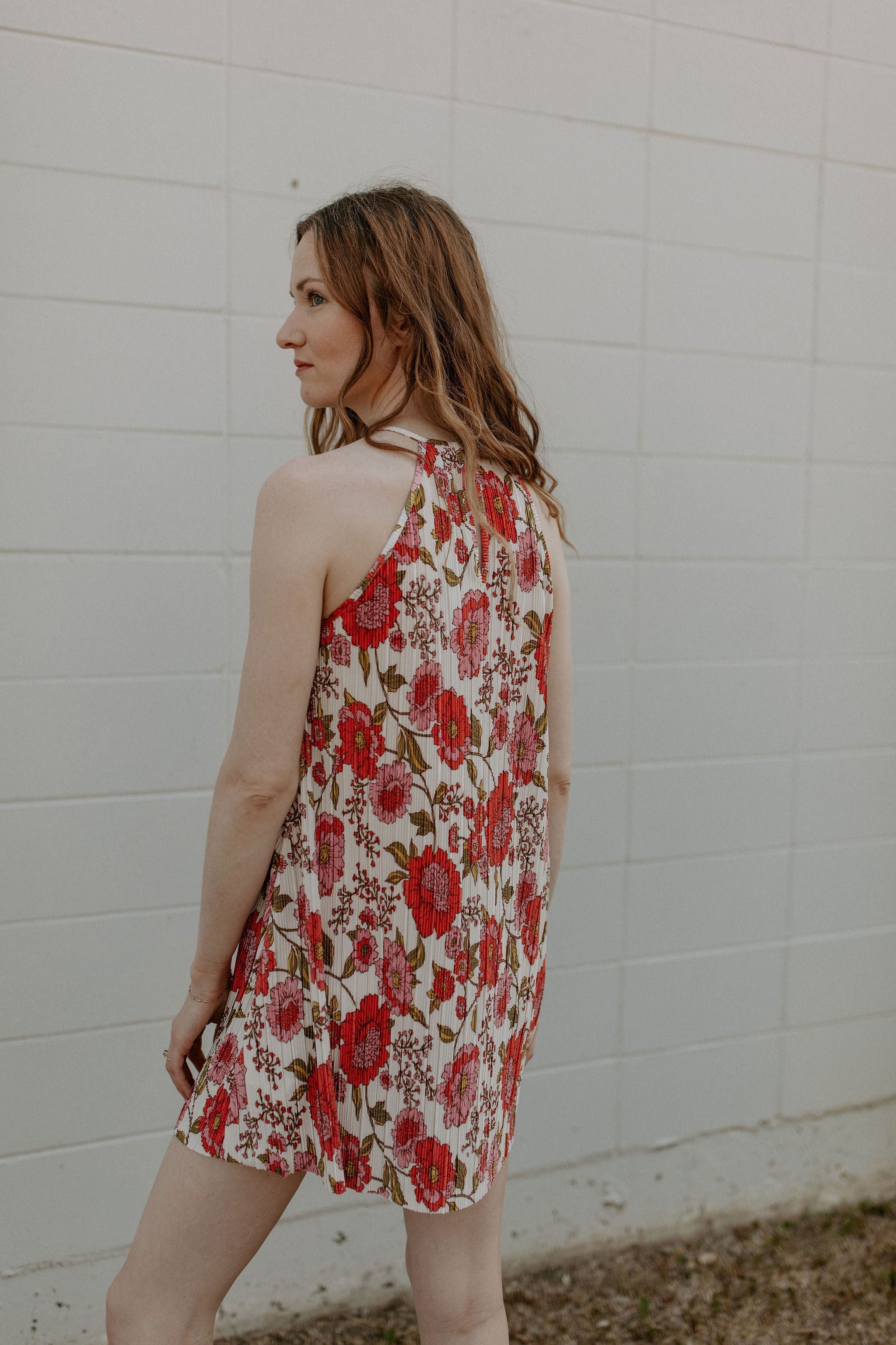 A vintage-inspired floral print brings charming style to a halter-neck trapeze dress textured by rippling plissé pleats. Awesome 70's Botanical Vine print throughout. Pleated. Halter style.