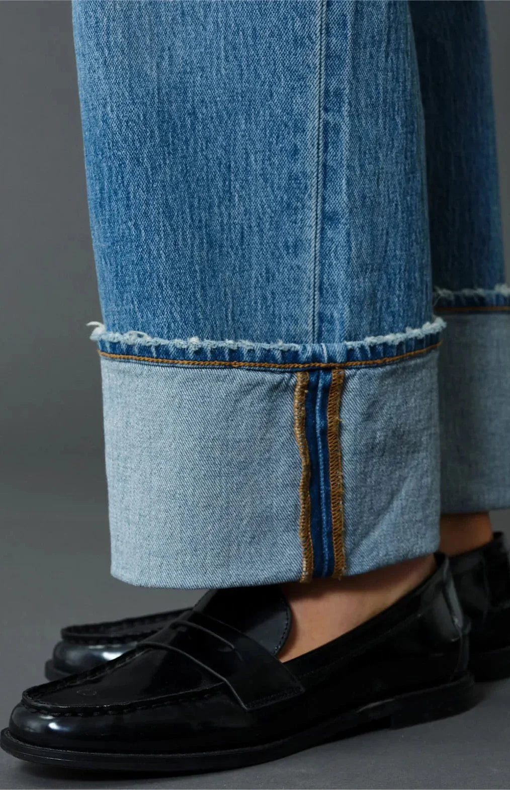 Undone, but still put together. Our relaxed fit cuffed denim is a straight that is constructed in a dark wash with slight fading throughout. Crafted from our "Tough Love" denim, it makes every pair look like an authentic vintage fit - it's mostly rigid but yields to your body in all the right places.