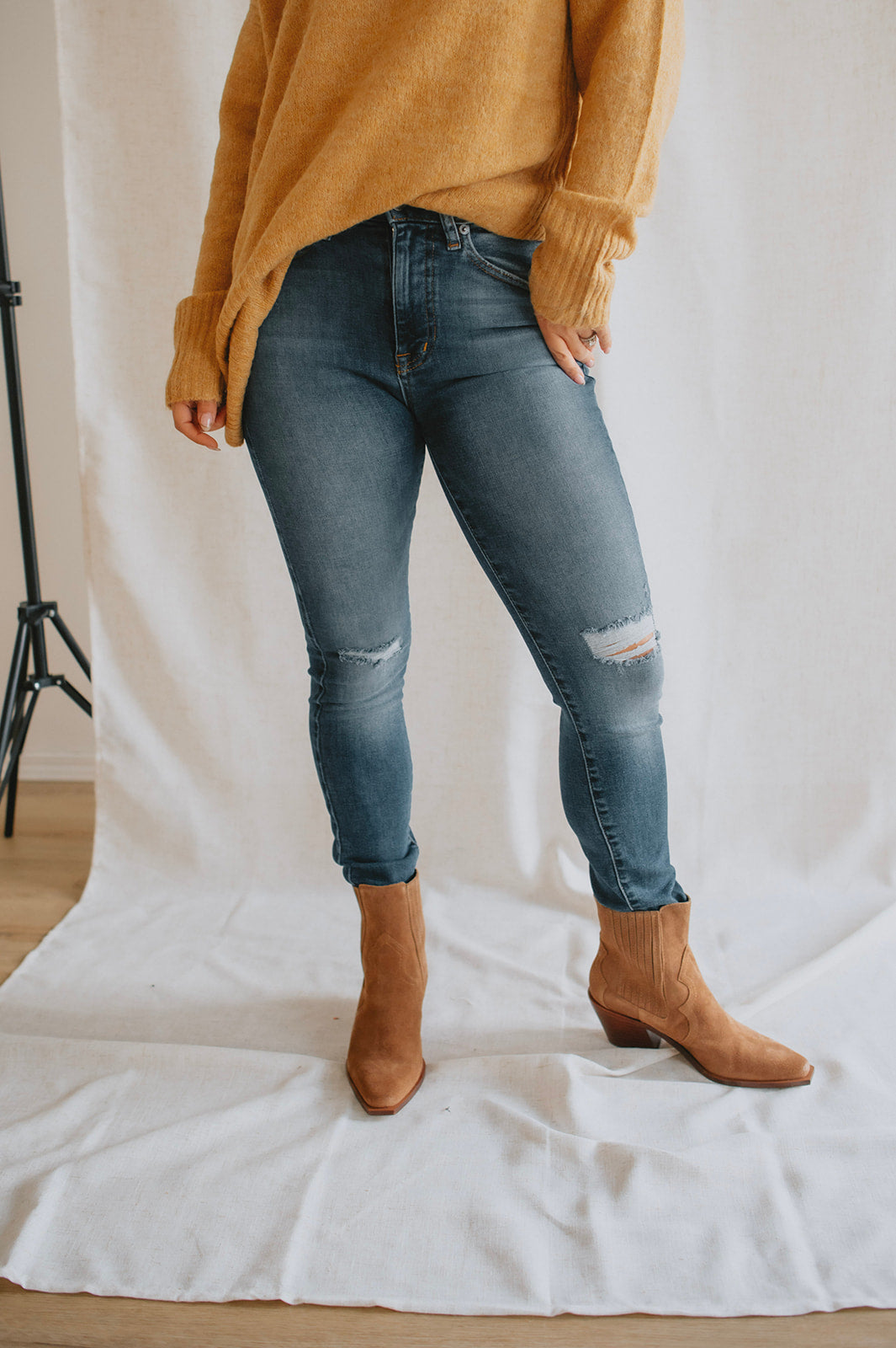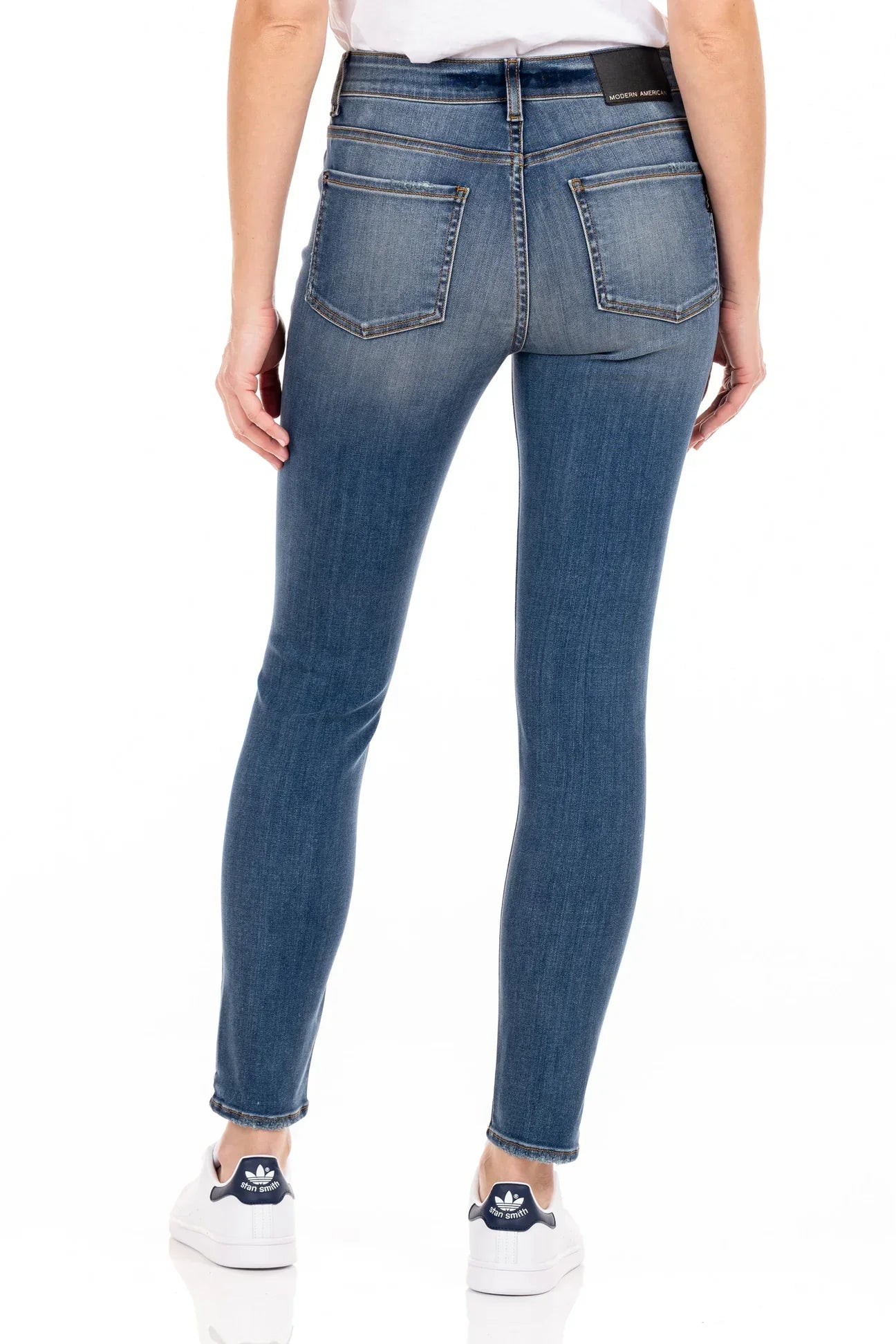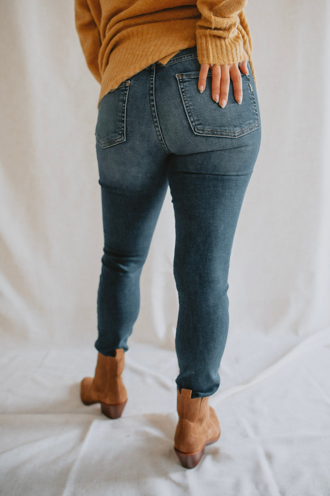 Our popular high-rise cropped skinny in this medium blue wash will be your new go to. Rips at both knees add a vintage feel. Hand crafted from Liberty Denim you get a true denim look with a soft stretchy fabric for comfort.