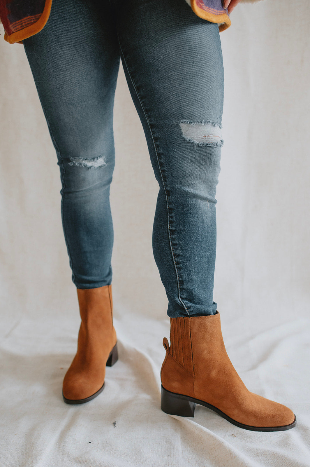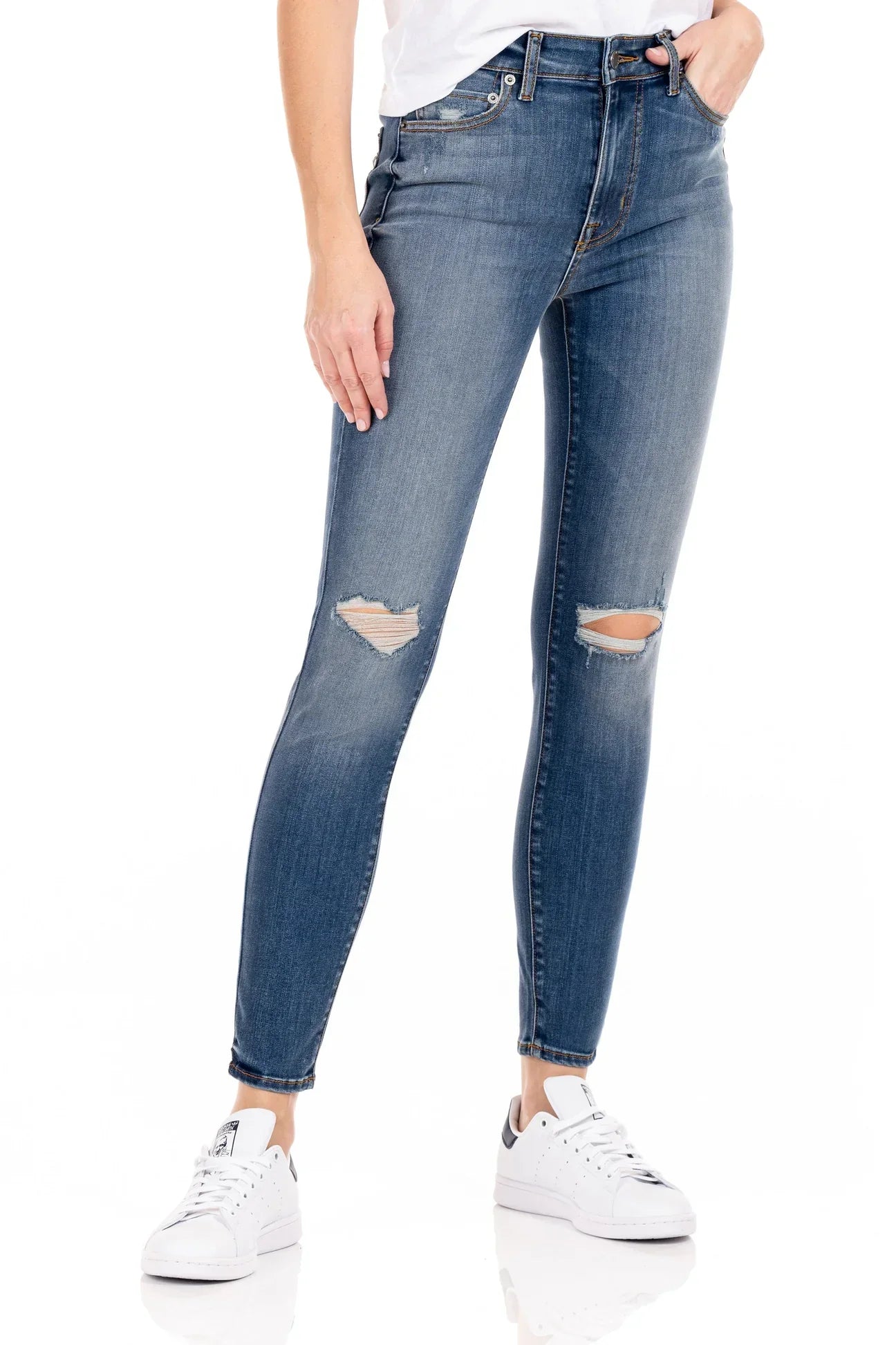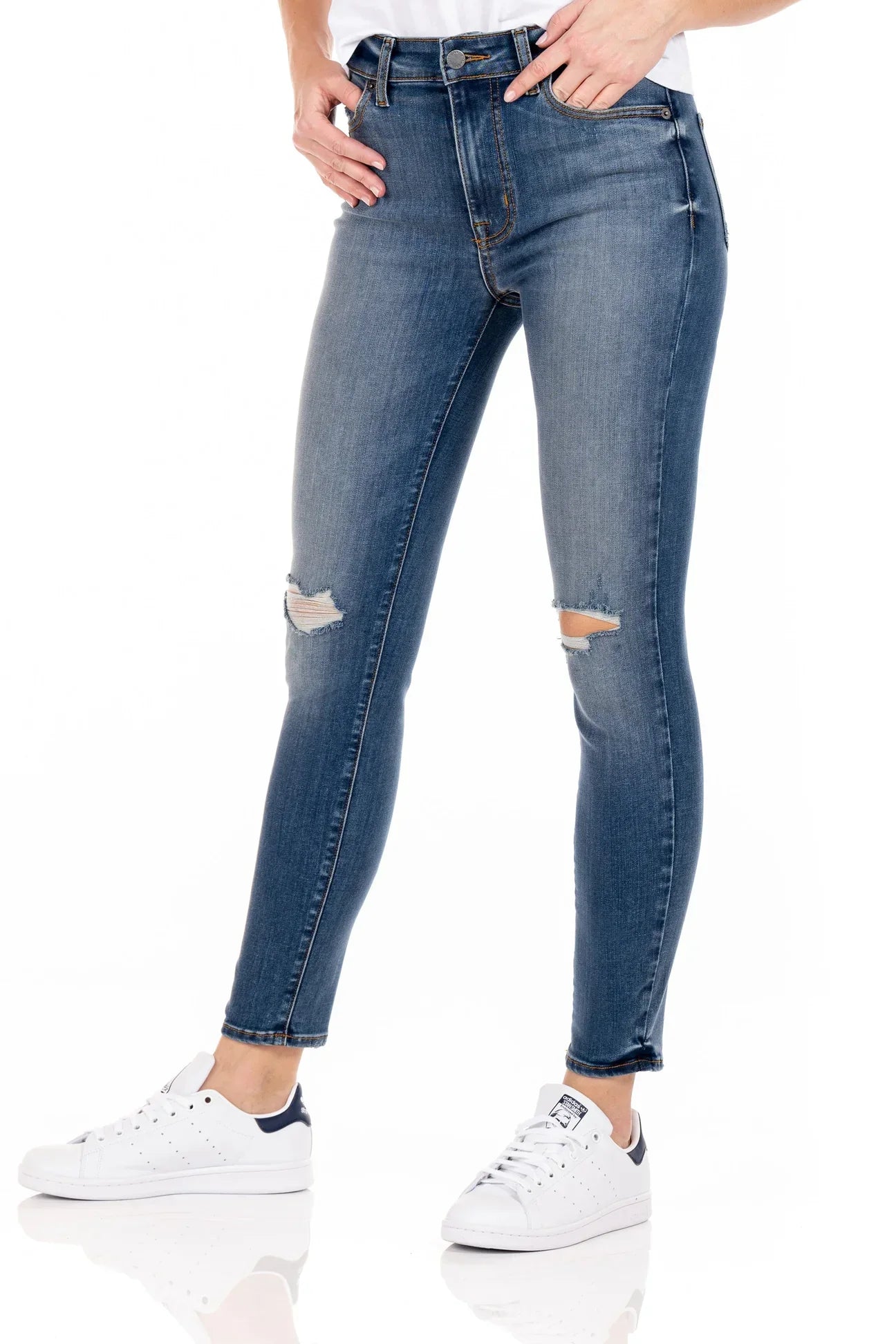 Our popular high-rise cropped skinny in this medium blue wash will be your new go to. Rips at both knees add a vintage feel. Hand crafted from Liberty Denim you get a true denim look with a soft stretchy fabric for comfort.