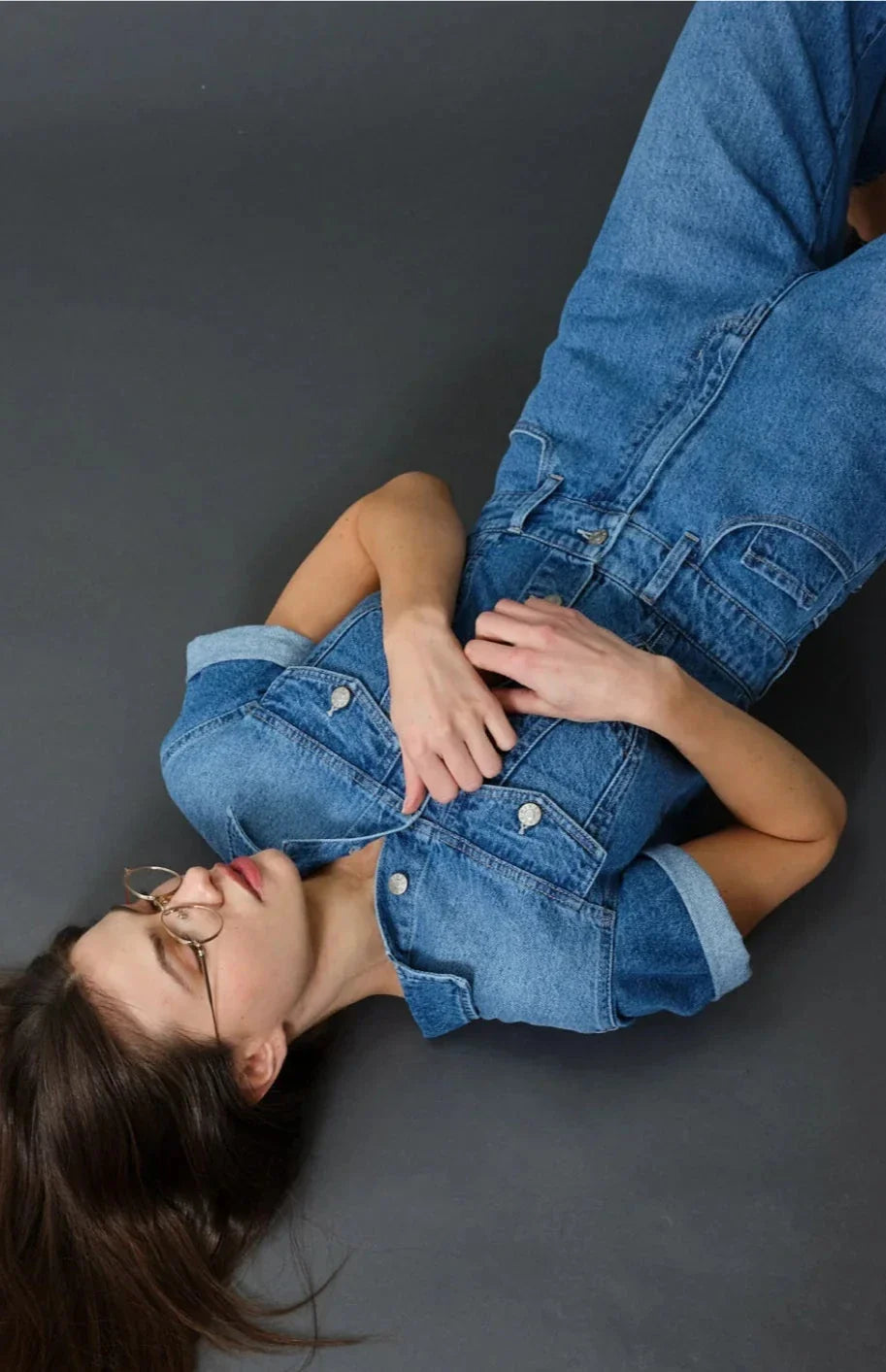 A brand new addition to Daze - a denim jumpsuit. Created from a non stretch fabric, this jumpsuit features a full wide leg with belt loops, and a button front.