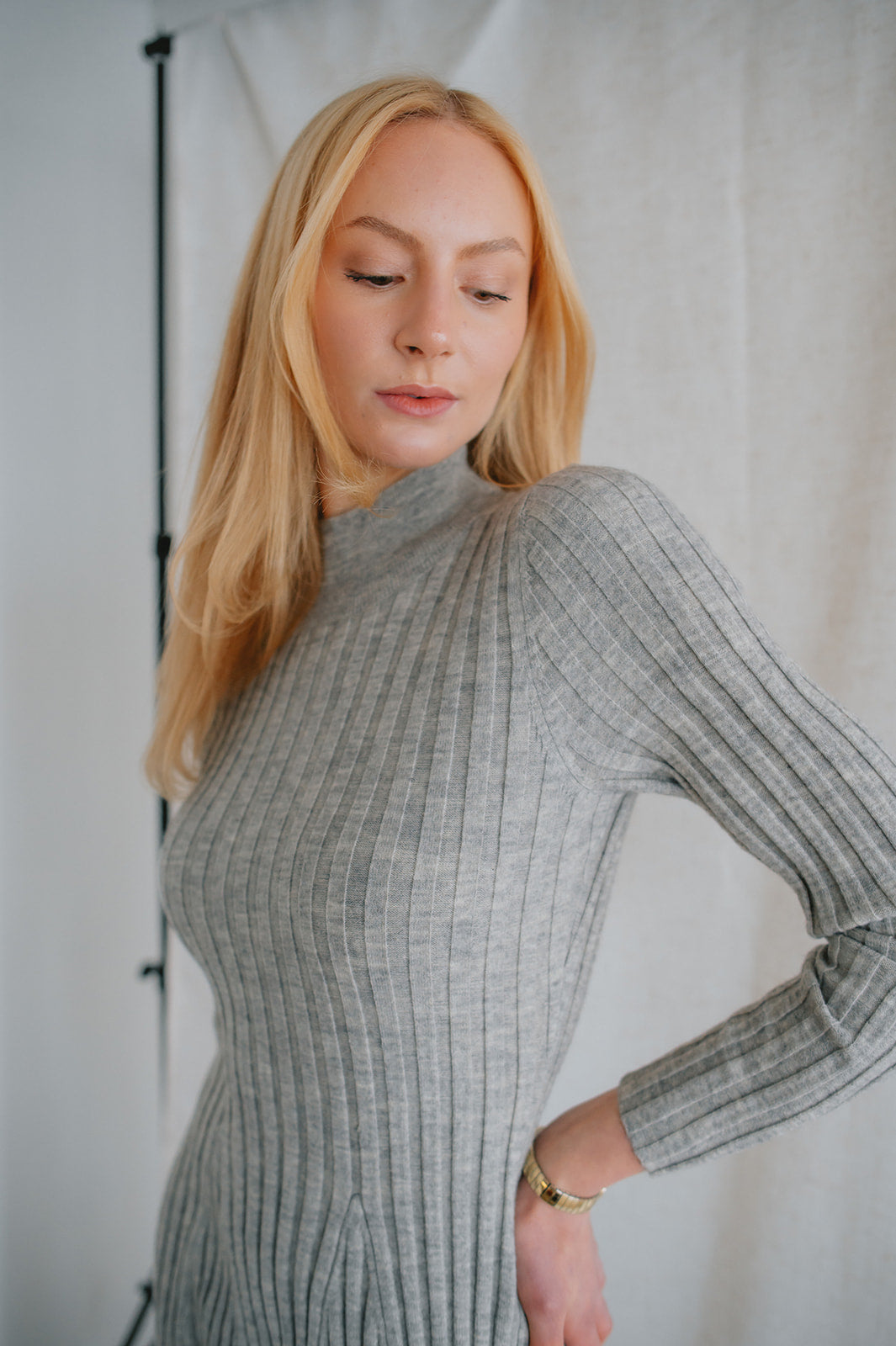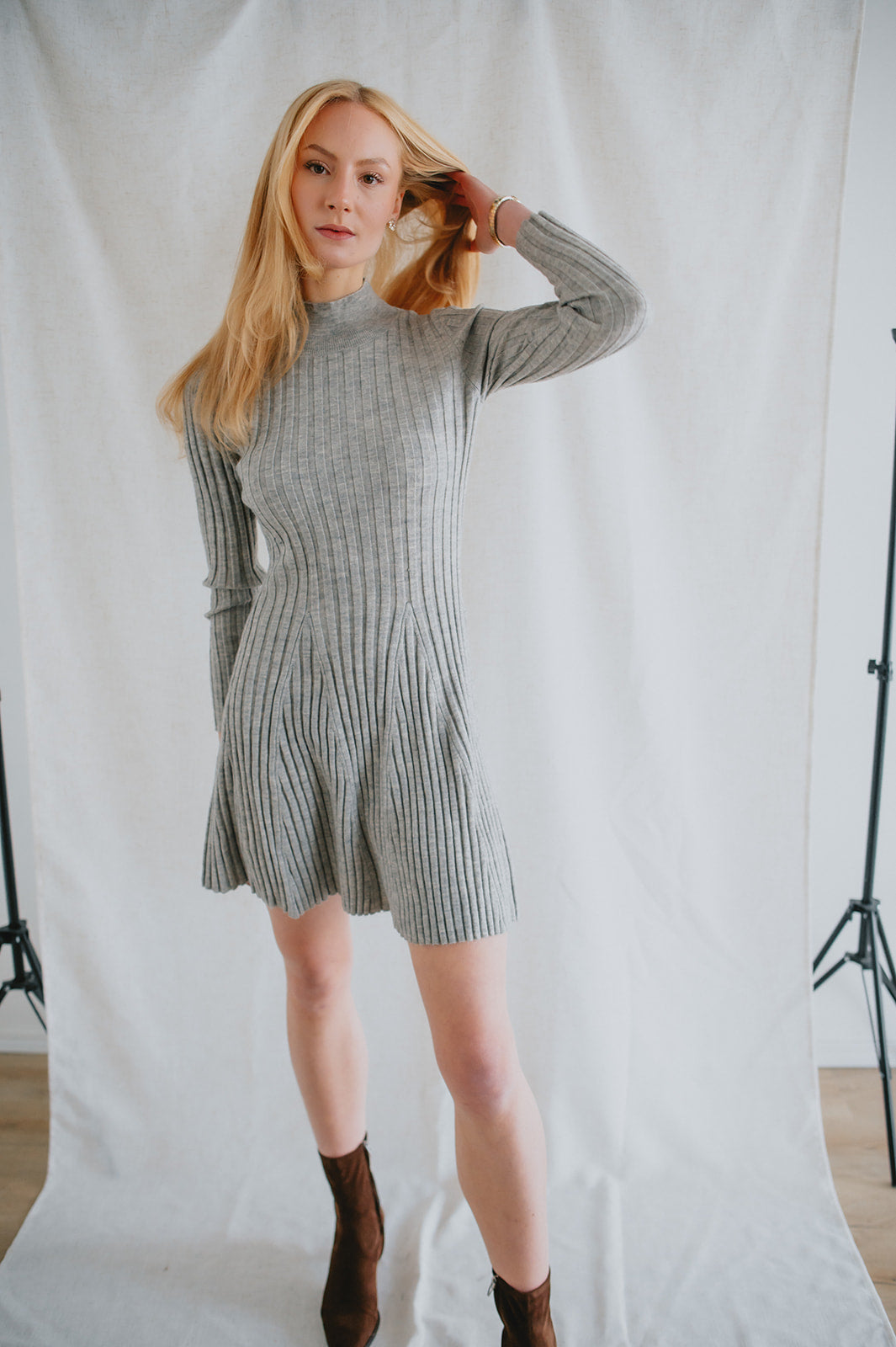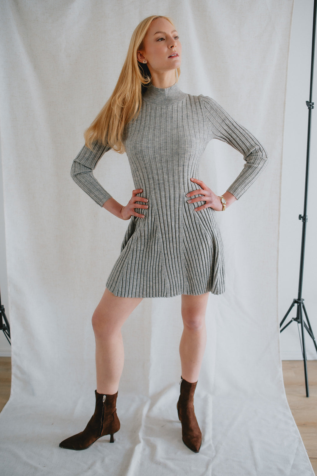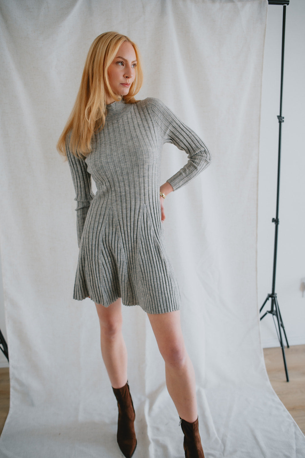 The Adi Dress is our effortless, throw-on-and-go sweater dress. It has a mock neck and slim fitting sleeves. But the magic is in the skirt, the rib is knit into godets to create a cute flounce at the sweep. Perfect with knee high boots.