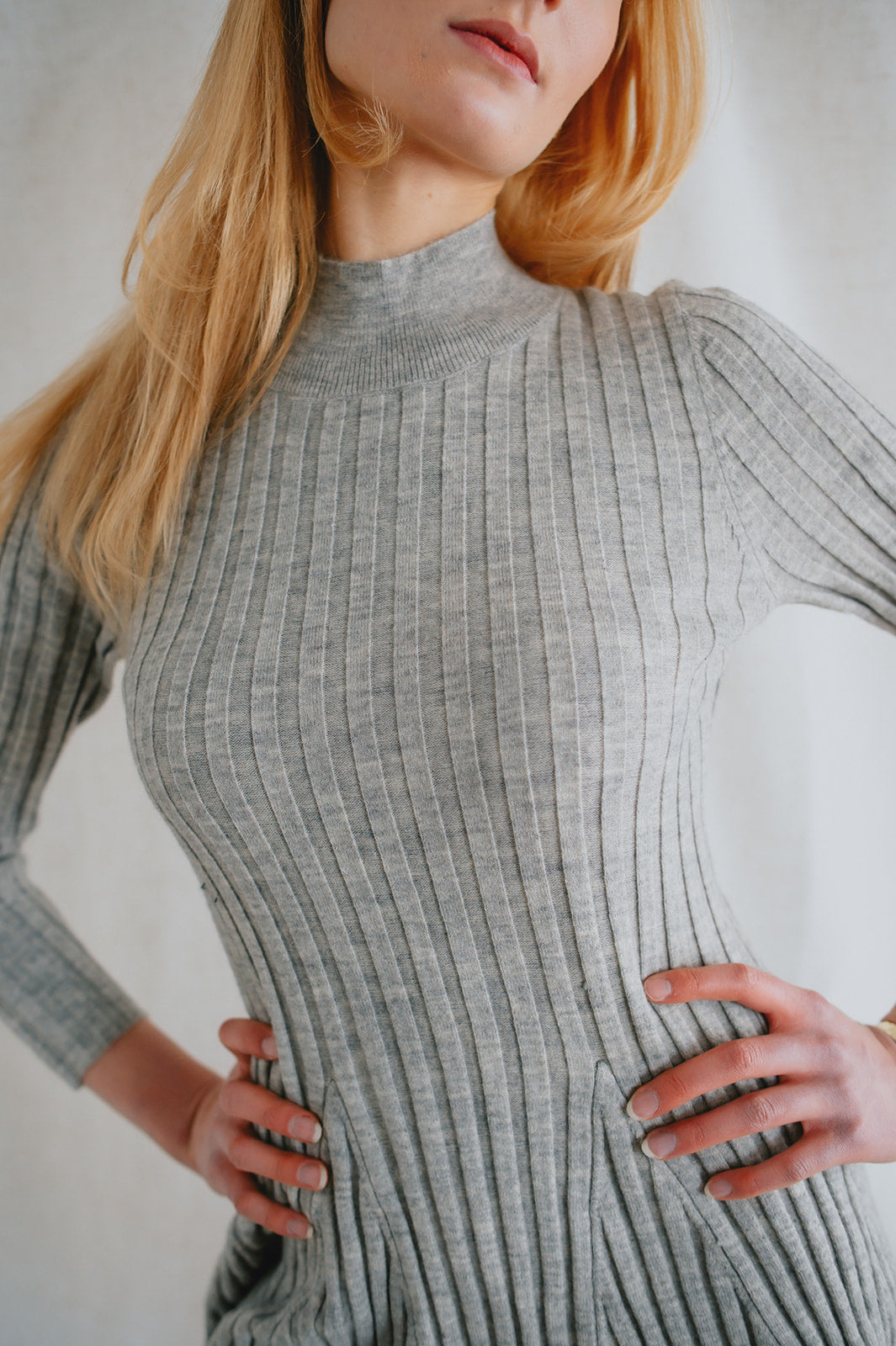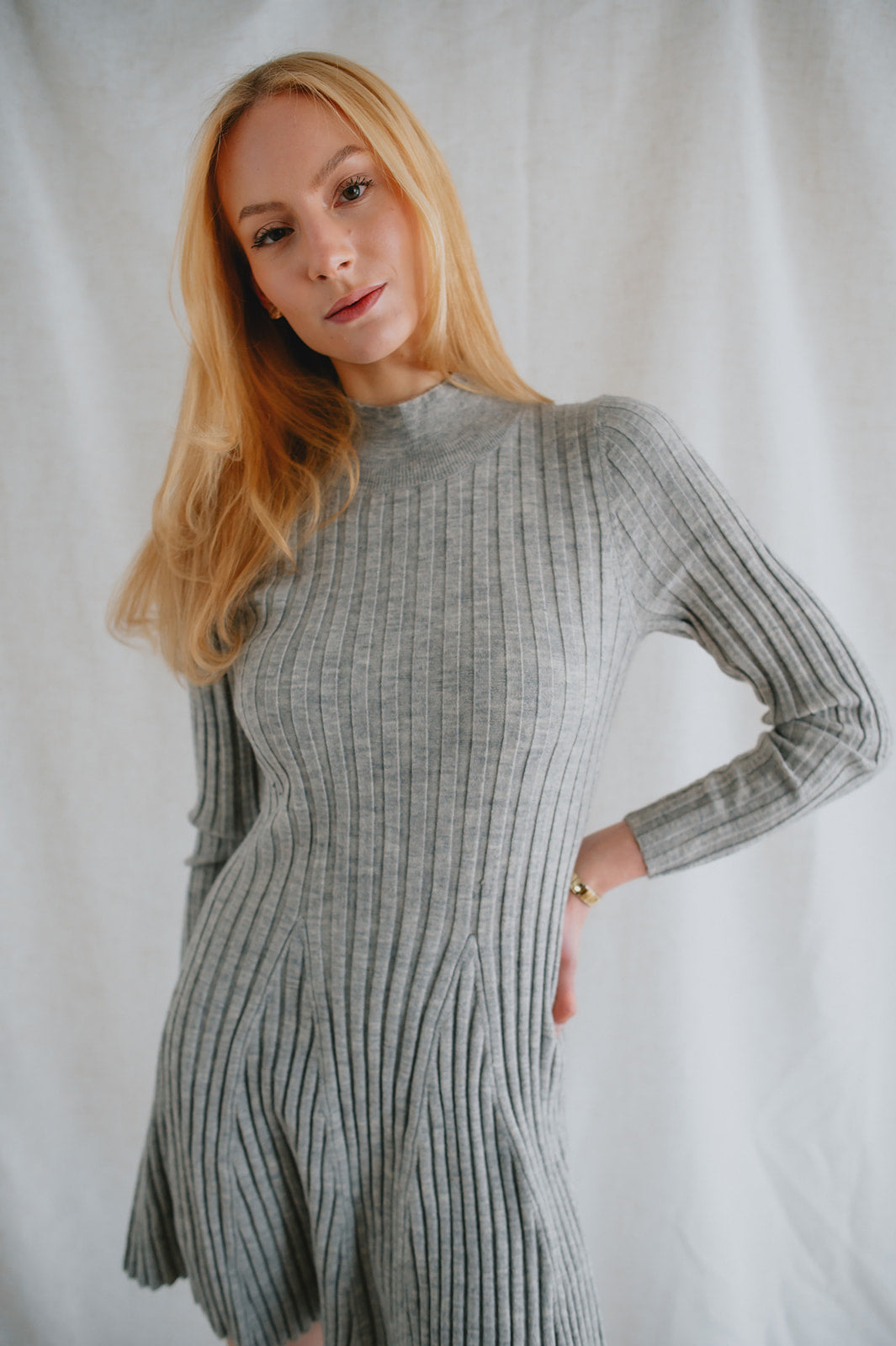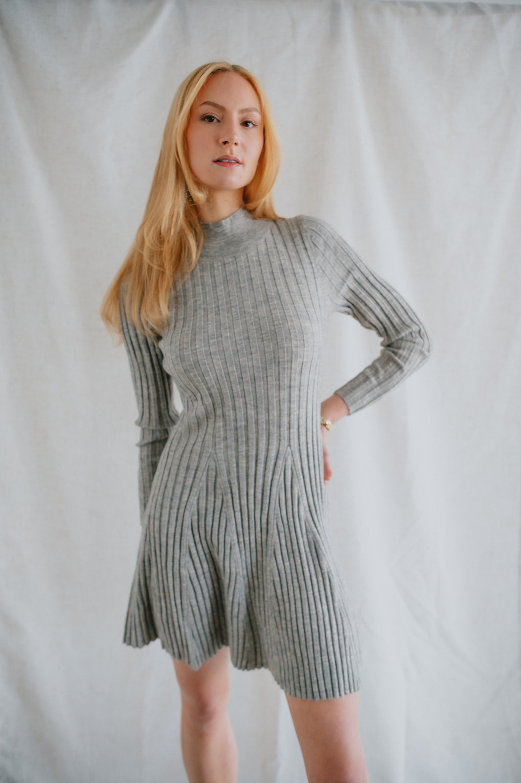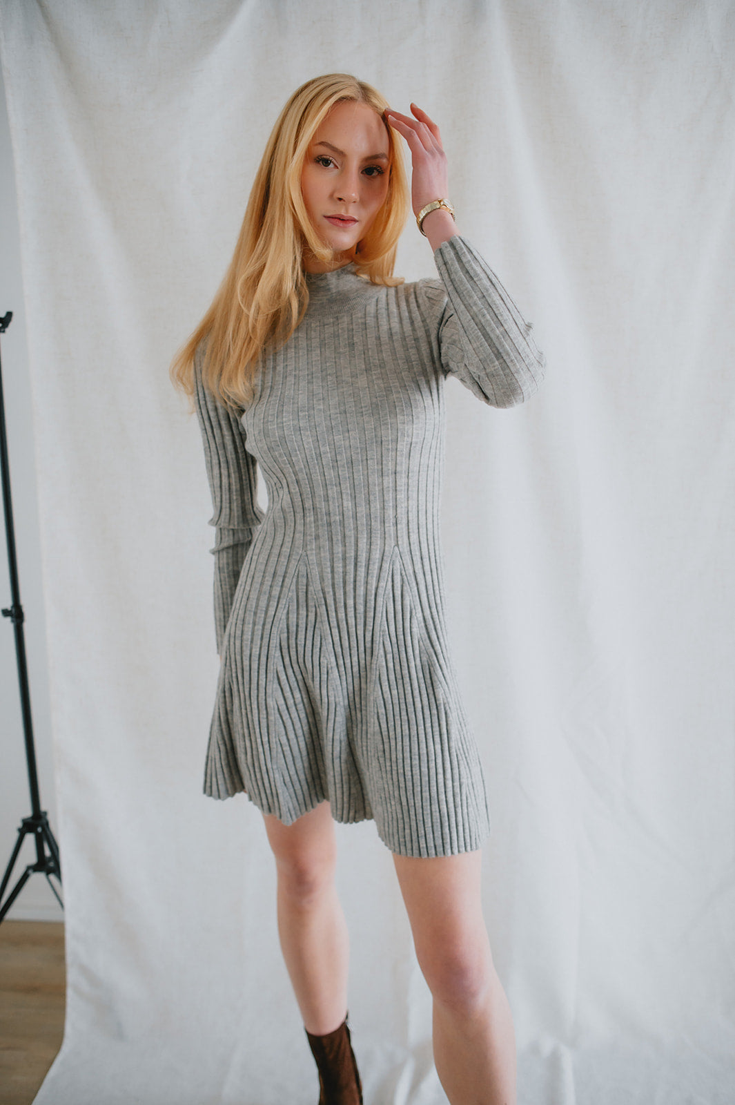 The Adi Dress is our effortless, throw-on-and-go sweater dress. It has a mock neck and slim fitting sleeves. But the magic is in the skirt, the rib is knit into godets to create a cute flounce at the sweep. Perfect with knee high boots.