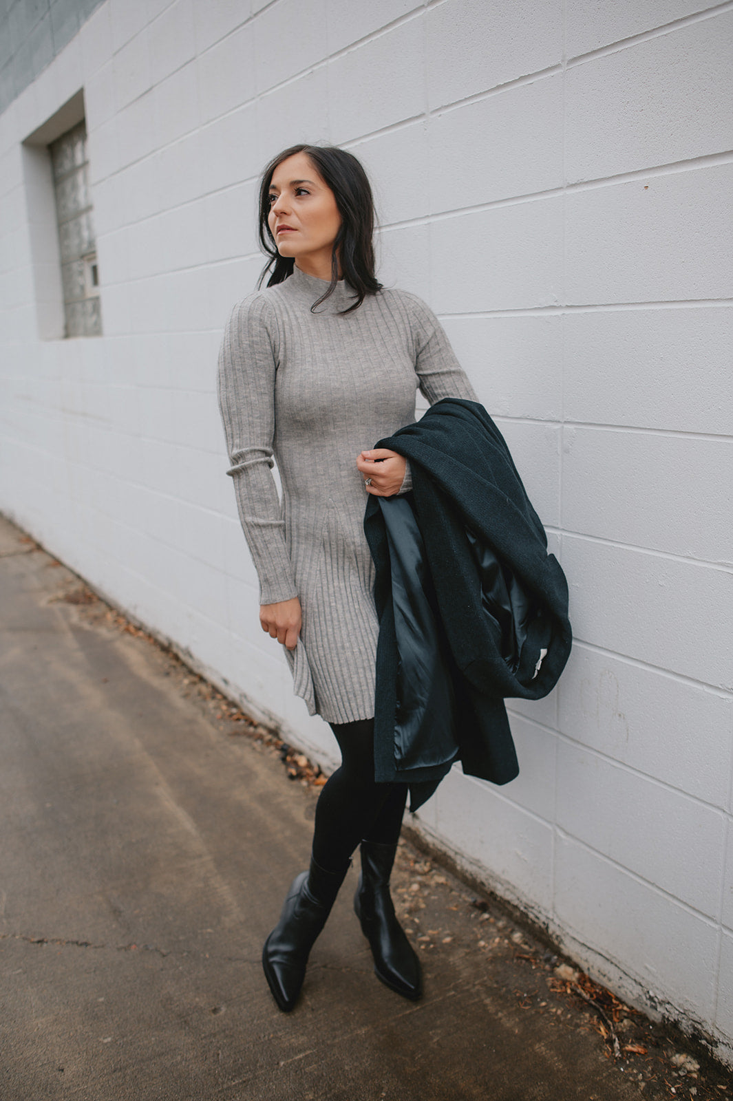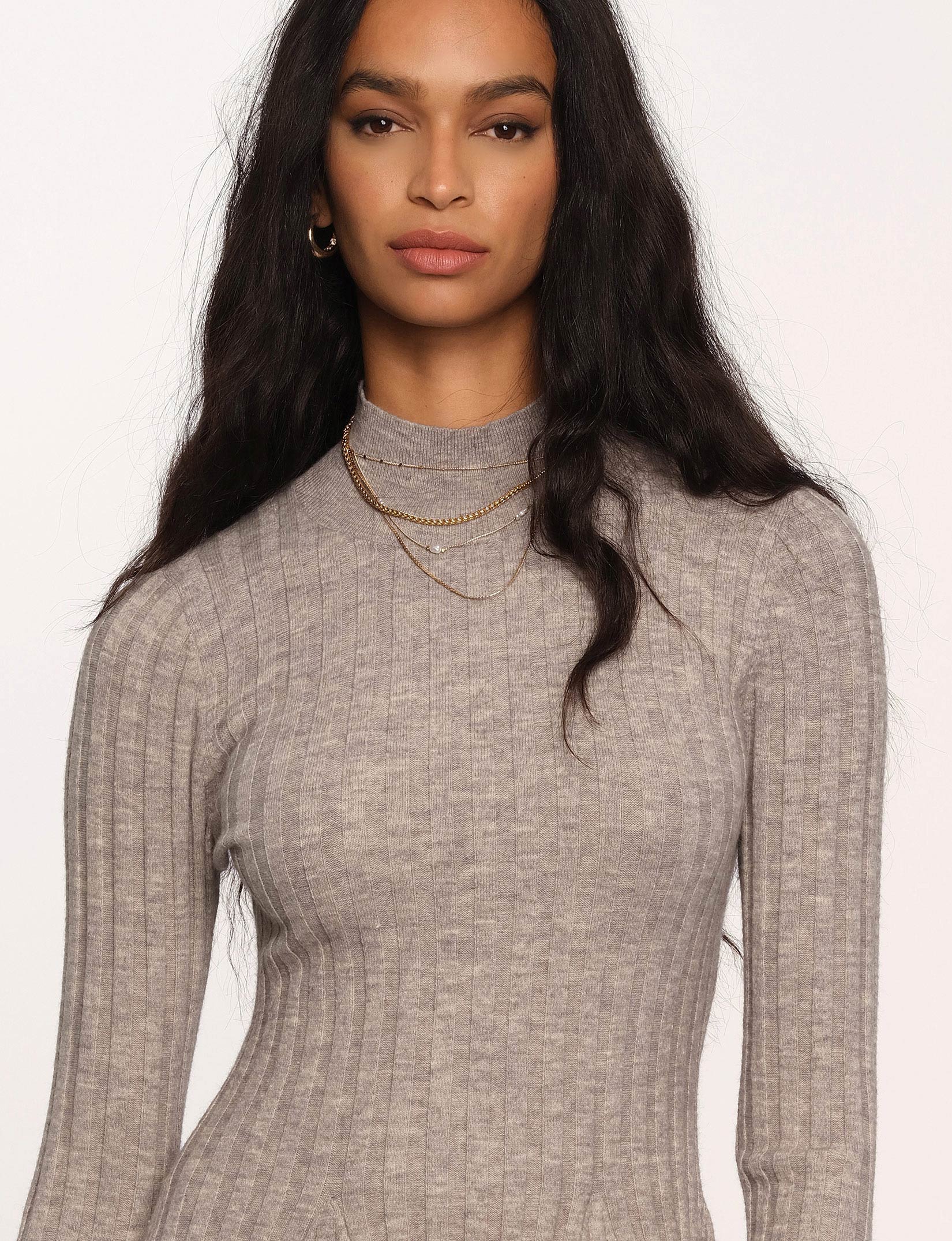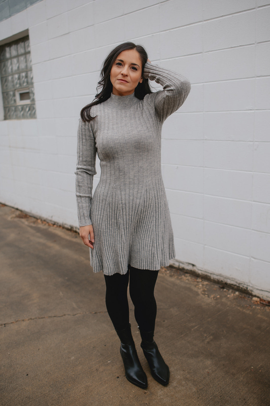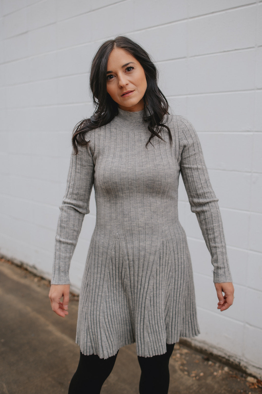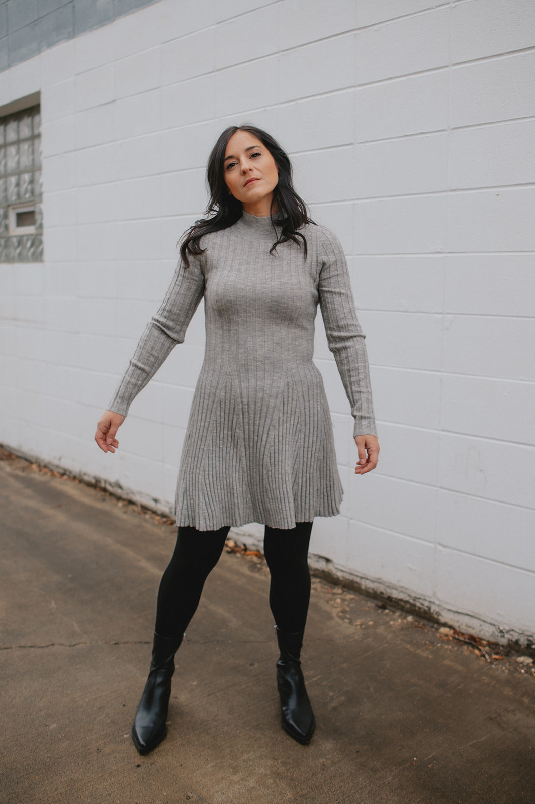 The Adi Dress is our effortless, throw-on-and-go sweater dress. It has a mock neck and slim fitting sleeves. But the magic is in the skirt, the rib is knit into godets to create a cute flounce at the sweep. Perfect with knee high boots.